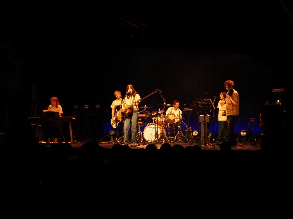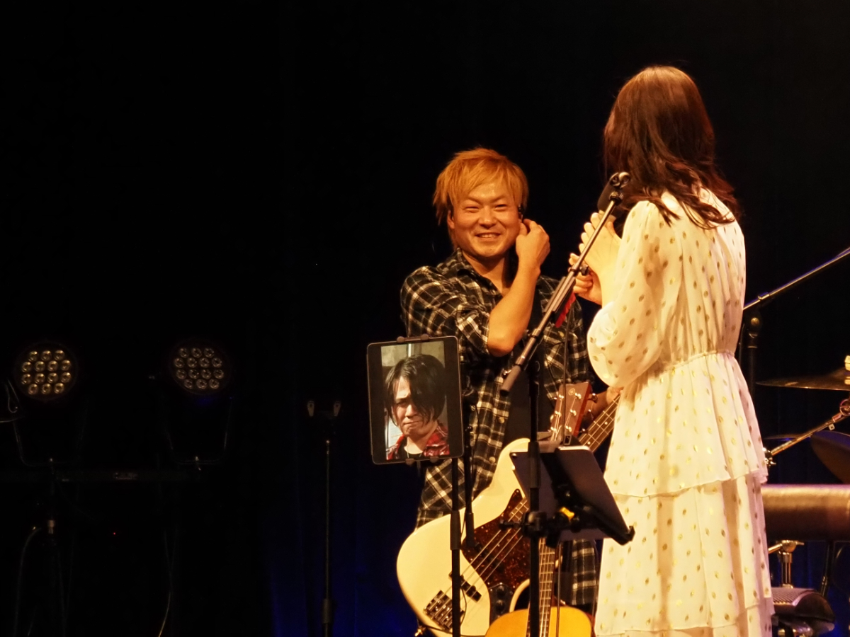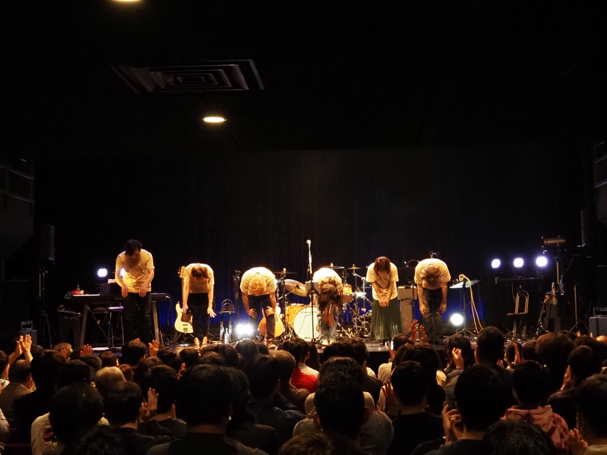 アンコールに応え、ライブグッズのTシャツに着替えた大原が再び舞台へ登場。グッズ紹介を挟んでバンドメンバーを呼び込む際には、コーラス・逆井寛子を呼べばなぜかベース・蛇石徹が登場し、キーボード・あいあいを呼べばヴァイオリン・多ヶ谷樹が現れ、ドラム・横瀬卓哉を呼べばキーボード・あいあいが……といった具合に一人ひとりがランダムに登場して会場を和ませる。また、もともと舞台上には出ないマニピュレーター・須賀勇介と、今回は欠席して写真だけの登場となったギター・吉田穣の名も呼ばれ、大原ゆい子バックバンドの再集結となった。