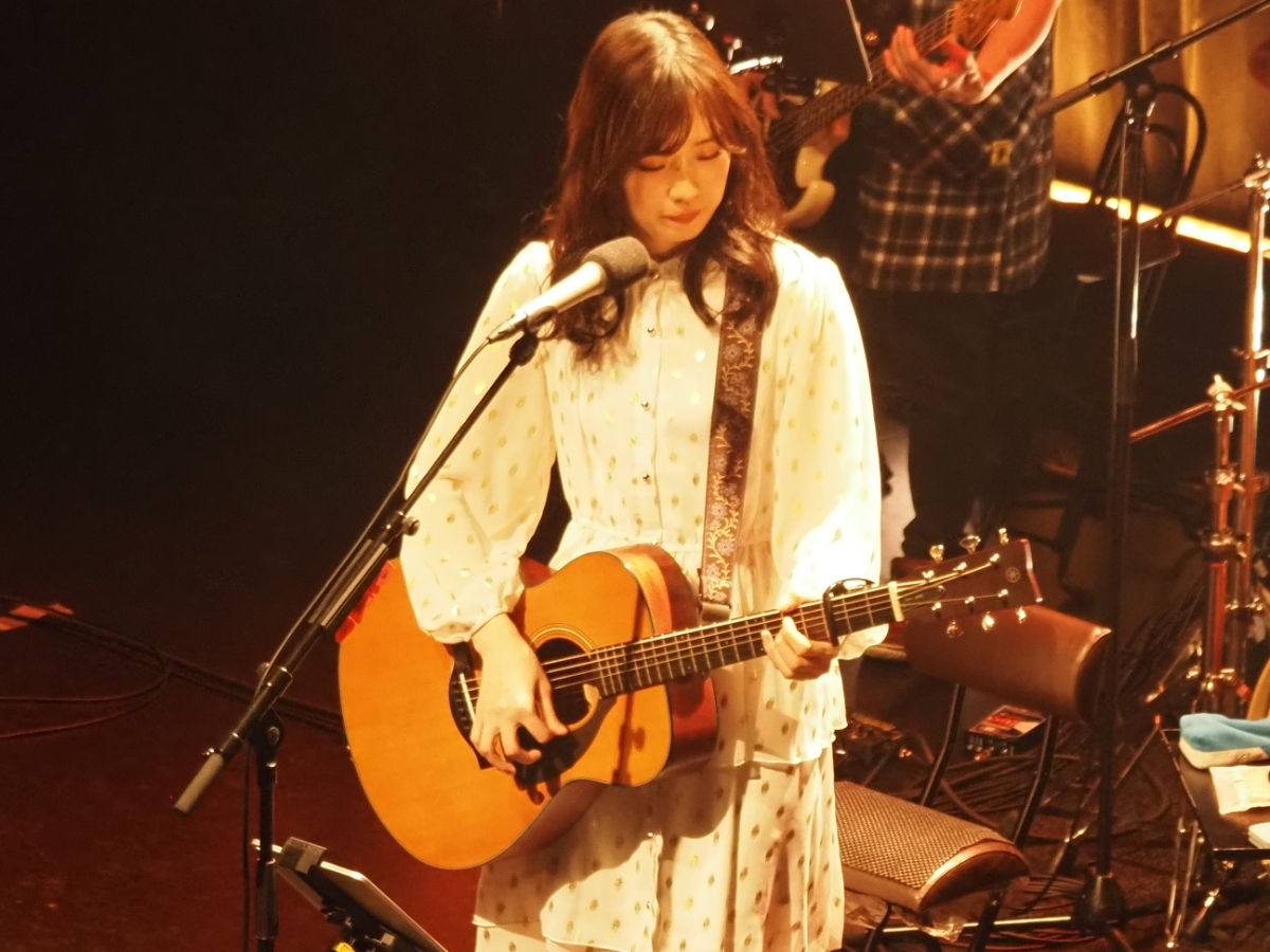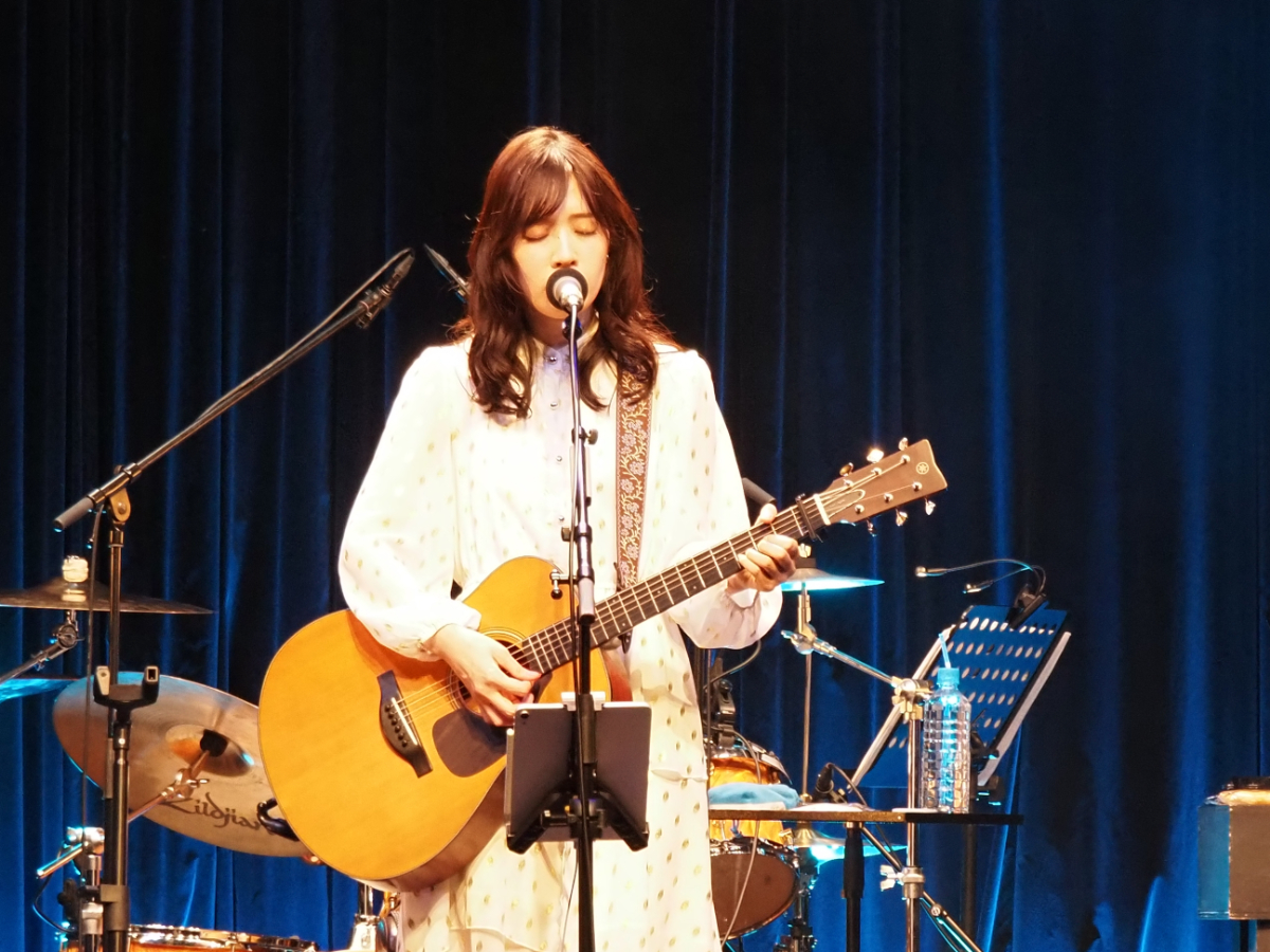 ちょうどお酒のトークが披露されたところで、9曲目には「星が眠るまで踊ろうよ」を歌った。「ゆったりまったり」とほろ酔い気分の気持ちいい歌詞。「冷たい水を」の歌詞の箇所では、実際に水のボトルを手にして振ってみせるなどの遊び心も見せてくれた。続く10曲目では「セイセイー!せんべいー!」と叫び、「セイセイせんべい!」(岩塚製菓オフィシャルタイアップソング)を披露。両手に持った岩塚製菓のおかきを大きく振ったり、ぴょんぴょん跳ねたりとかわいらしくダンスすれば、観客も手拍子でそれに応える。間奏ではアコギを肩から下げ、お菓子をピックのように持ってエアギターを披露するというお茶目な仕草も魅力的だった。そして11曲目は「えがおのまほう」(TVアニメ『はなかっぱ』OP)をギター弾き語りで披露。観客も手拍子を続け、本当に「魔法」にかけられたかのように会場中がひとつになっていく。