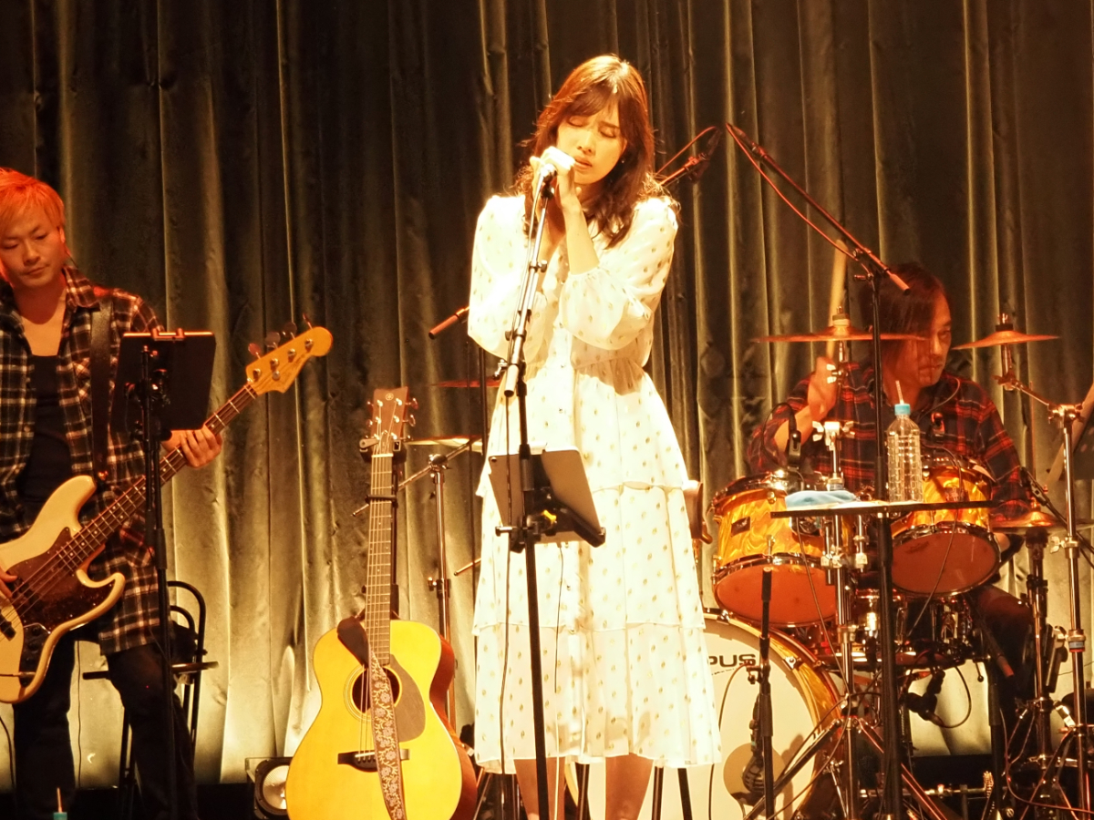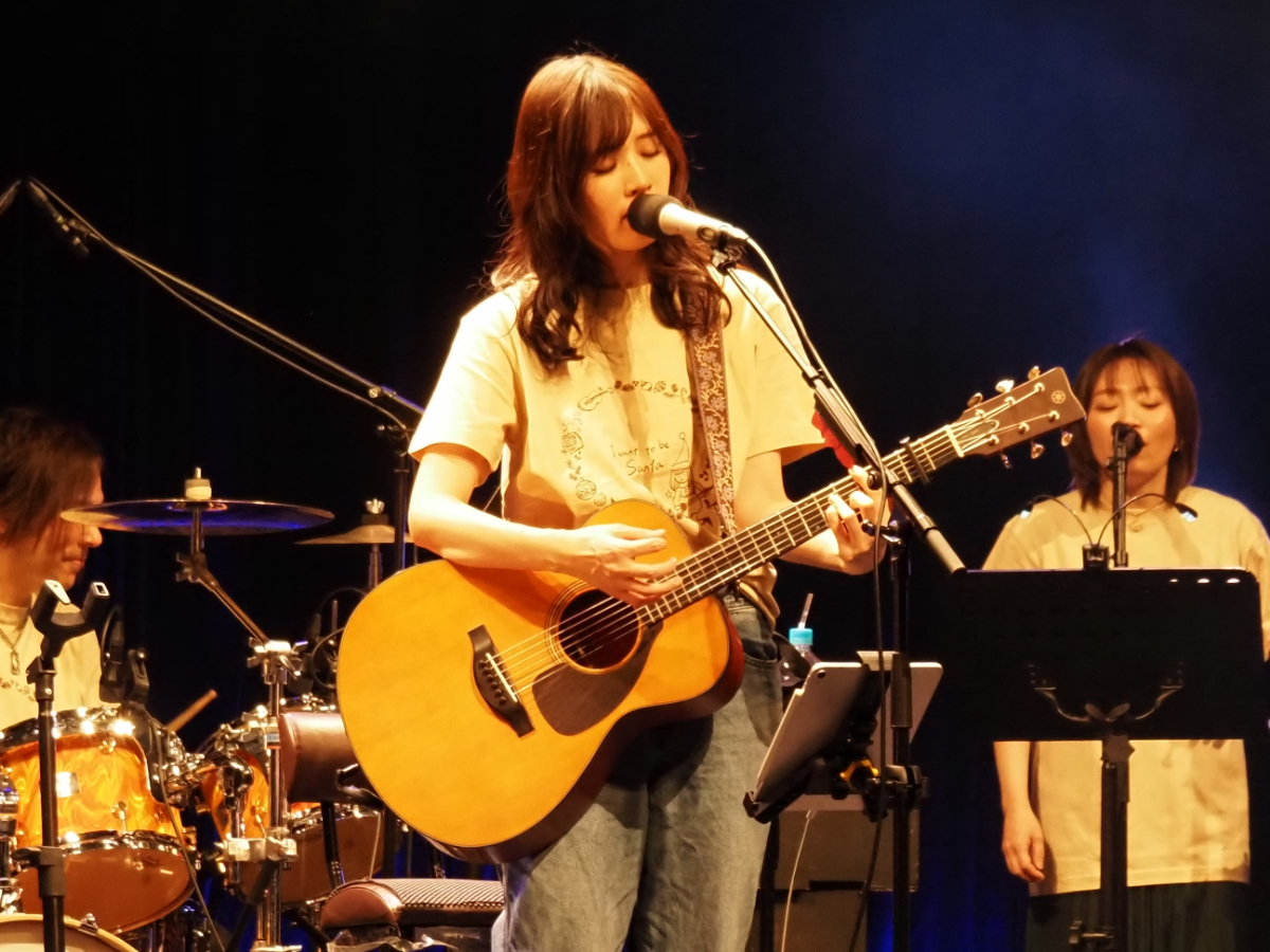 舞台にはまずバンドメンバーが登場。ベース・蛇石徹、キーボード・あいあい、ドラム・横瀬卓哉、コーラス・逆井寛子、ヴァイオリン・多ヶ谷樹の面々だ。そこへ大原ゆい子が加わり、アコギを肩から下げて、1曲目に「まっすぐ」(TVアニメ『からかい上手の高木さん3』OP)を弾き語りで披露した。観客席とステージの距離も近く、バンドメンバーの楽し気な表情まで目に入ってくる。続けて2曲目には「透明な翼」( TVアニメ『リトルウィッチアカデミア』2クールED)を歌い、観客のハートをグッとつかんでいく。