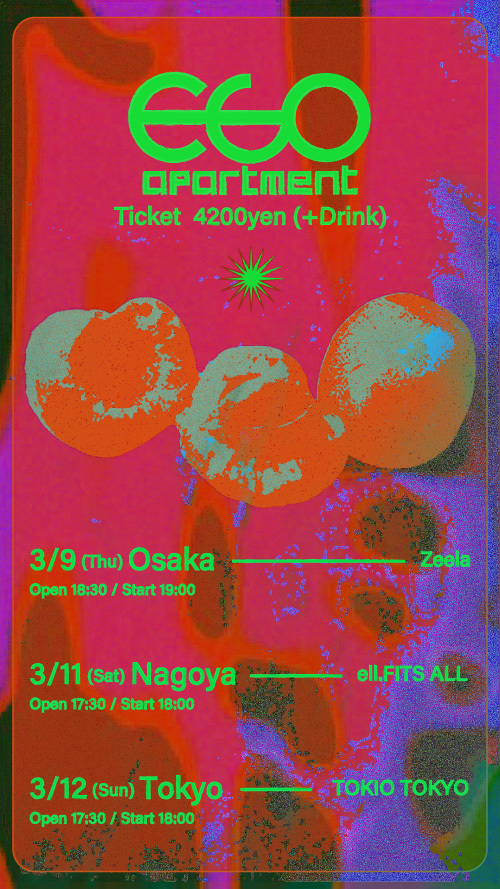 ワンマンライブツアー『EGO APARTMENT -TRANSIT-』は、3月9日(木)に地元・大阪の梅田Zeelaでの公演を皮切りに、3月11日(土)名古屋・ell.FITS ALL、3月12日(日)東京・TOKIO TOKYOにて開催される。