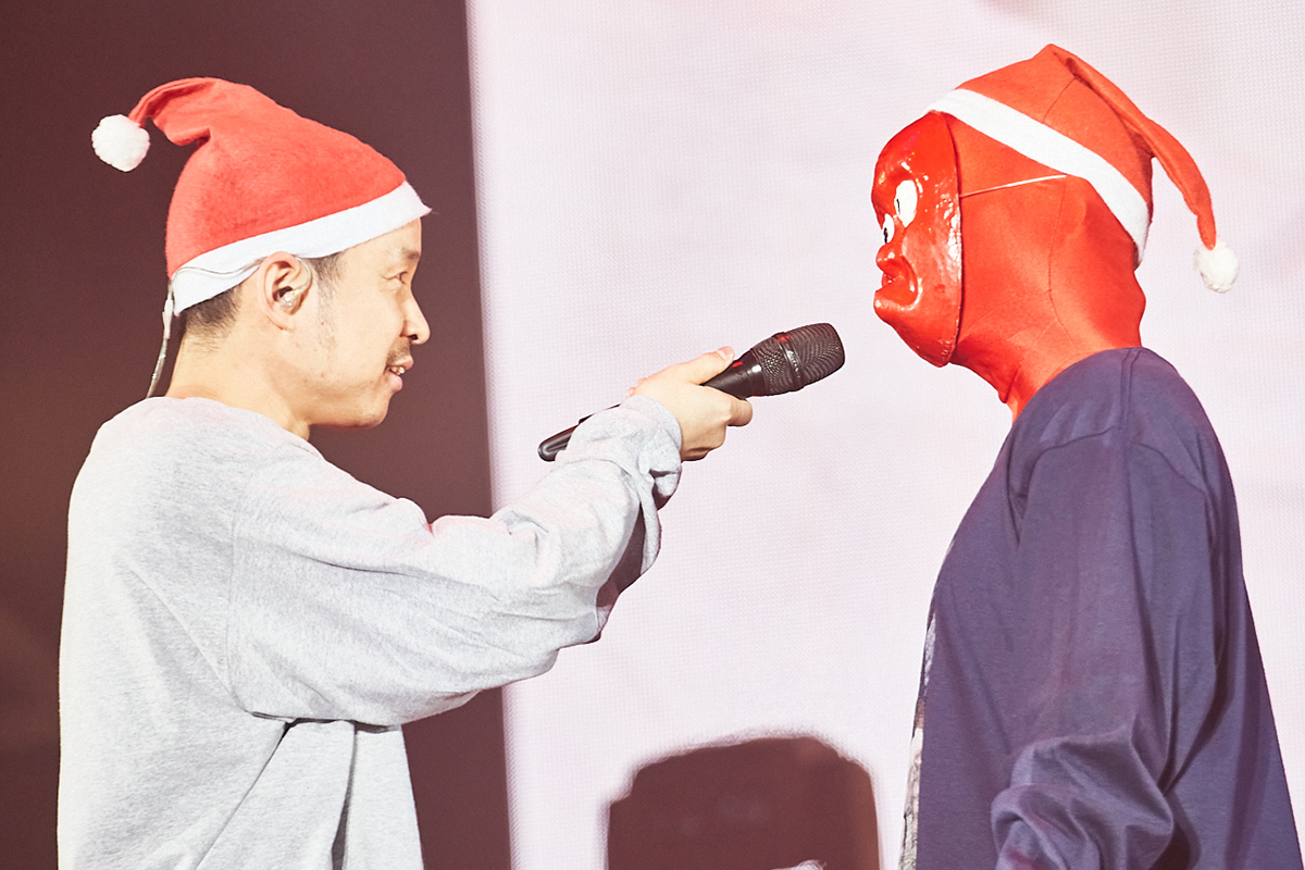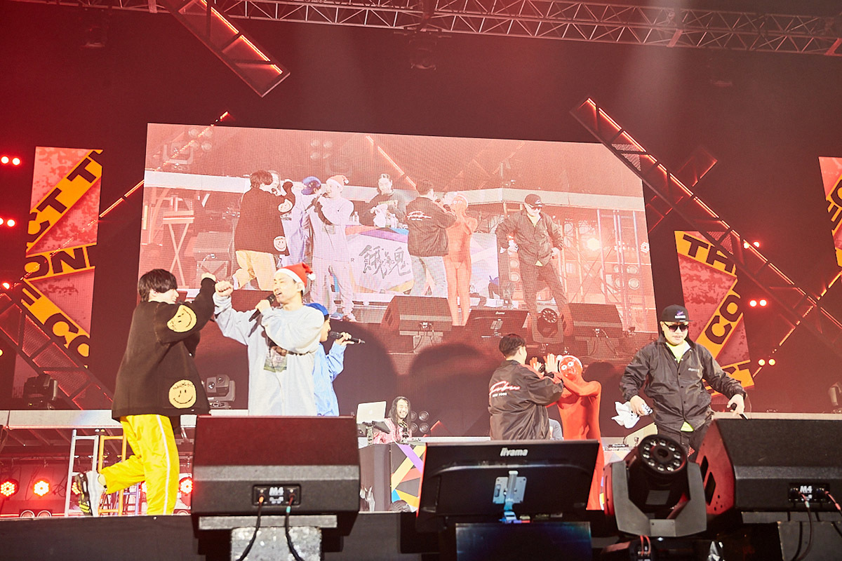 3人がステージを降りると、この日のゲストである餓鬼レンジャーが登場。まずはDJ OSHOWとGP. a.k.a N.O.B.Bが登場し、餓鬼レンジャー楽曲をDJプレイでつなぎ、観客を盛り上げる。そしてラッパーのポチョムキンとYOSHI、ダンサーのタコ神様がステージに上がると、ライブは「TACO DANCE」でスタート。そして「超越」「火ノ粉ヲ散ラス昇龍」「MONKEY4」と、20年以上のキャリアを誇るグループならではの、新旧代表曲を織り交ぜたライブを展開した。