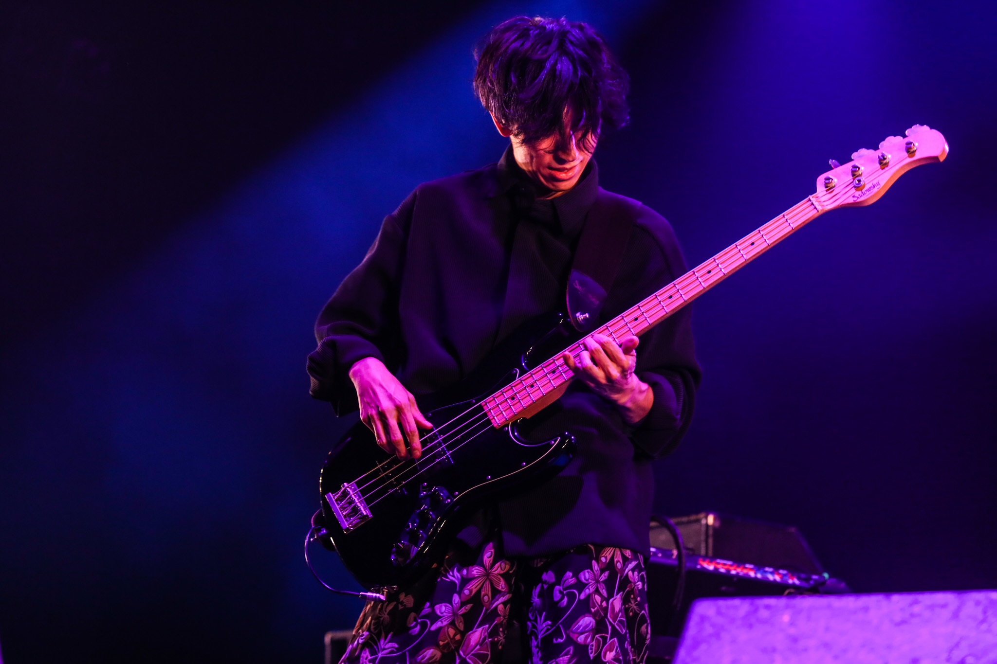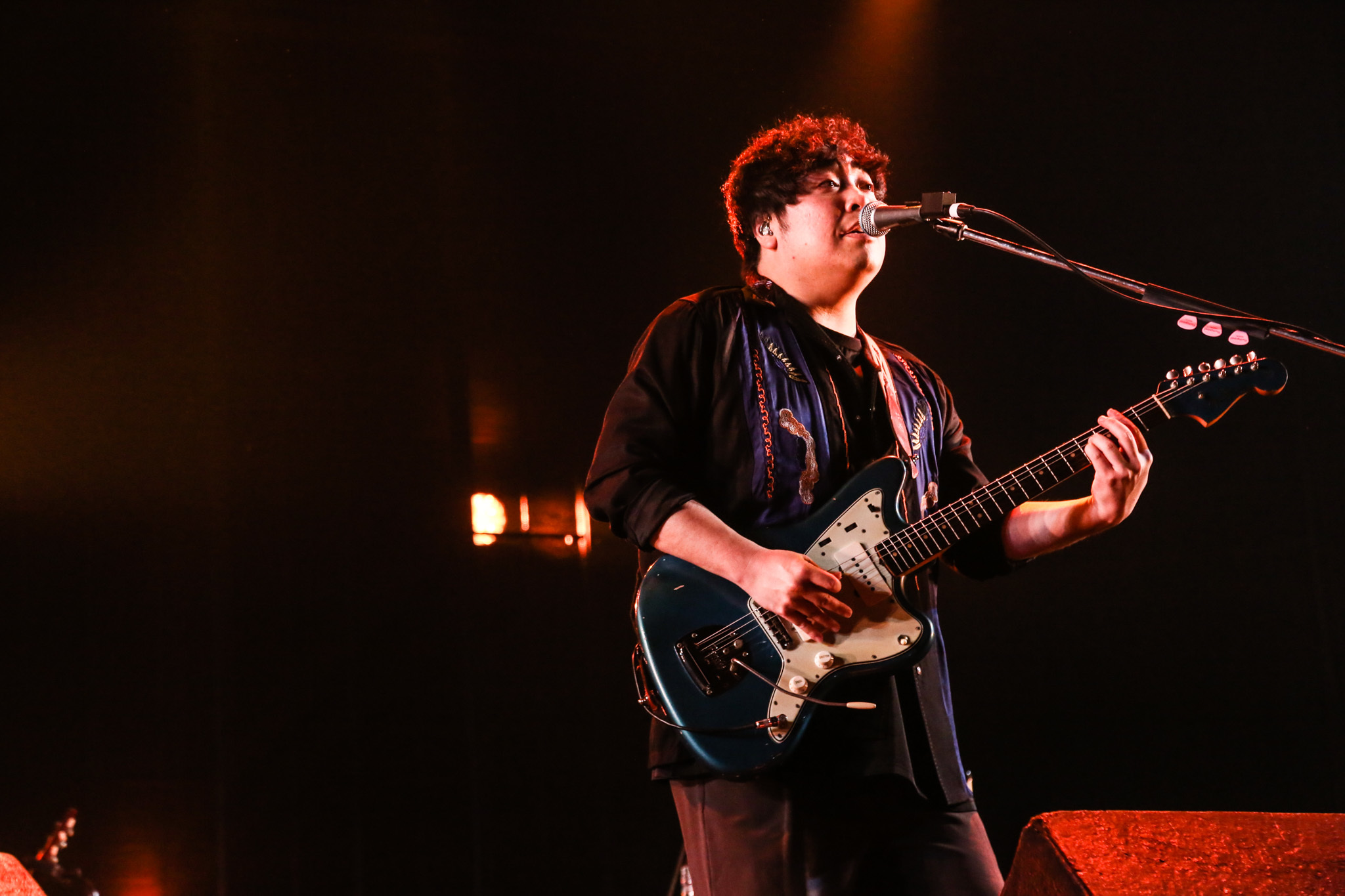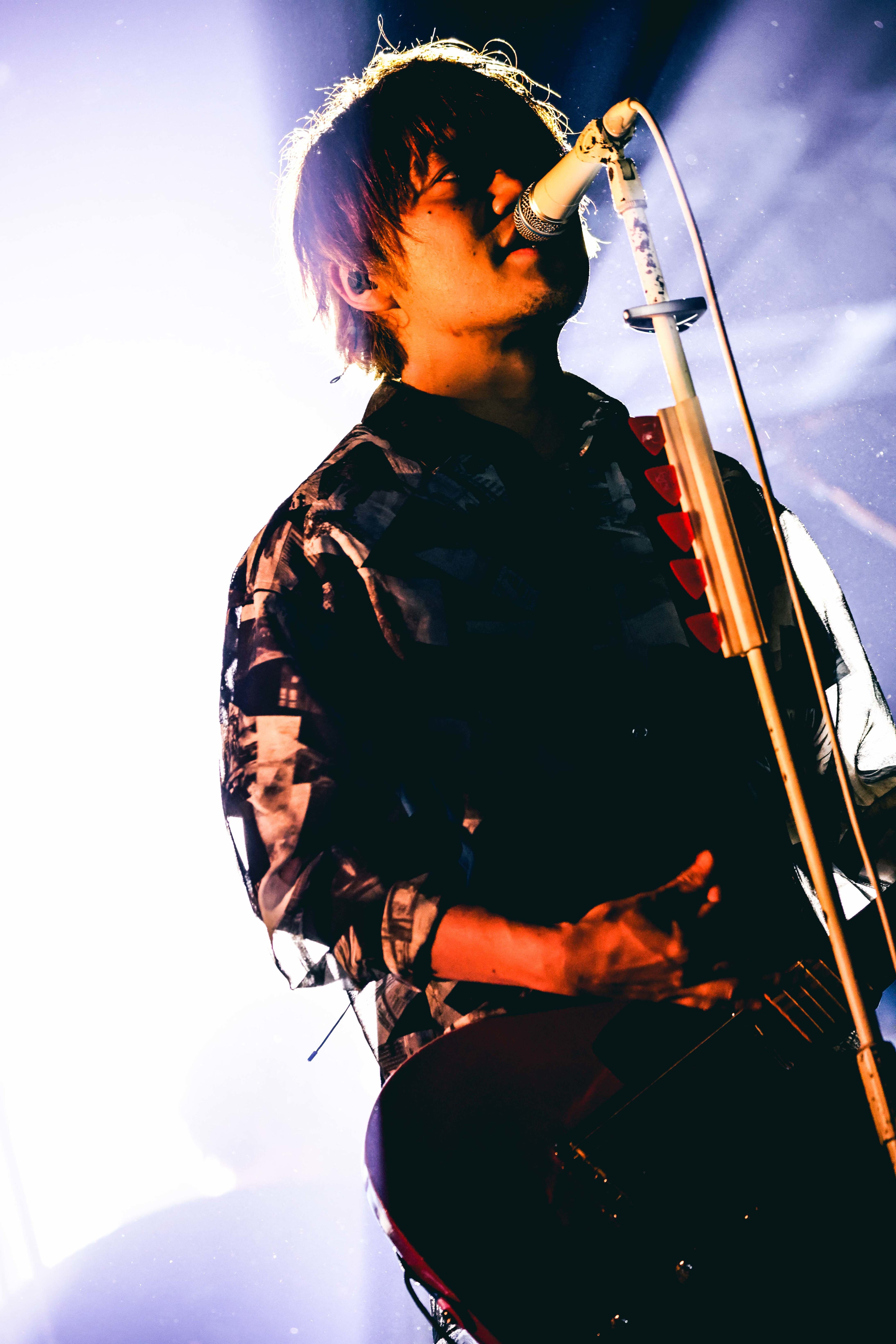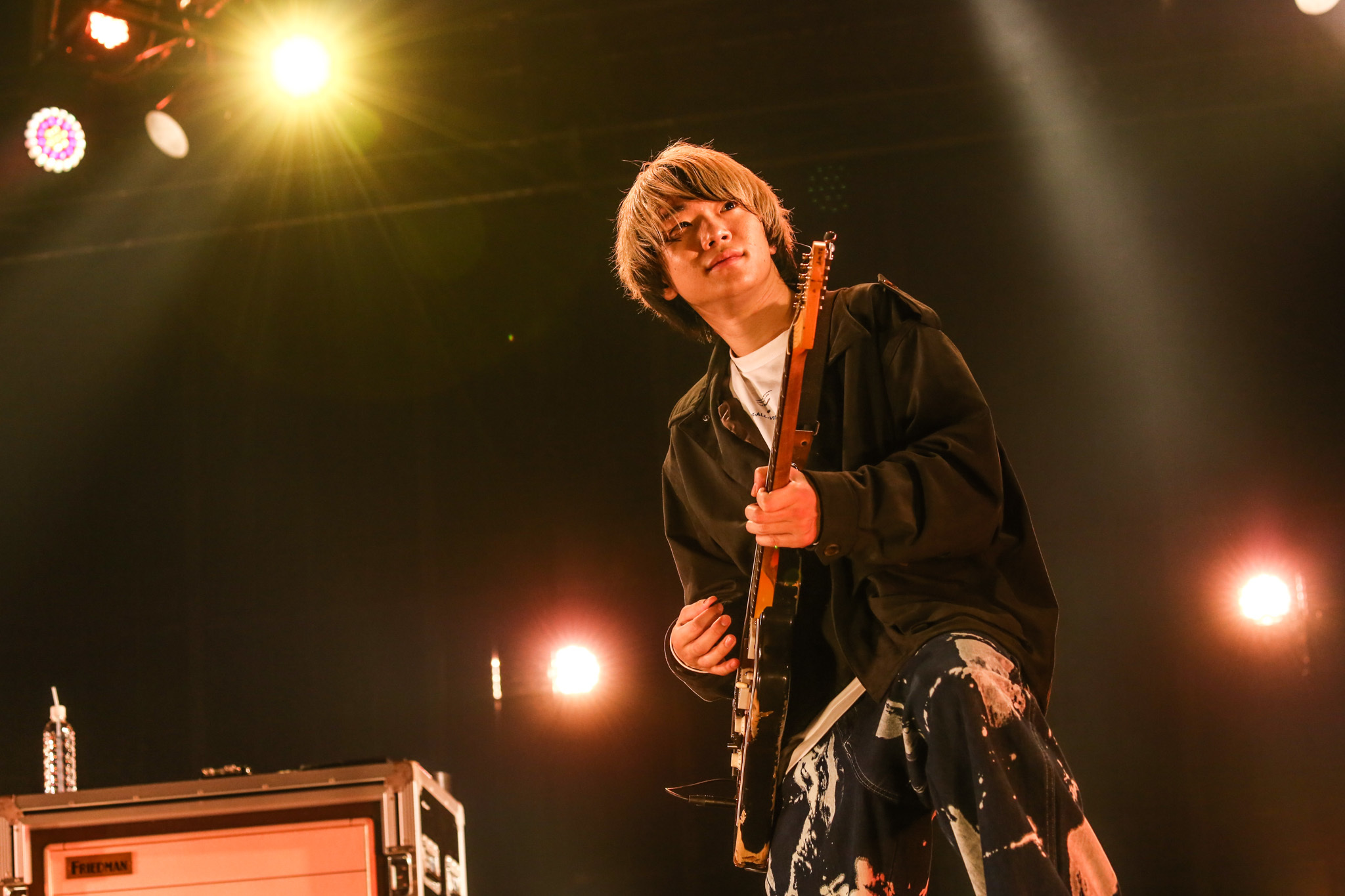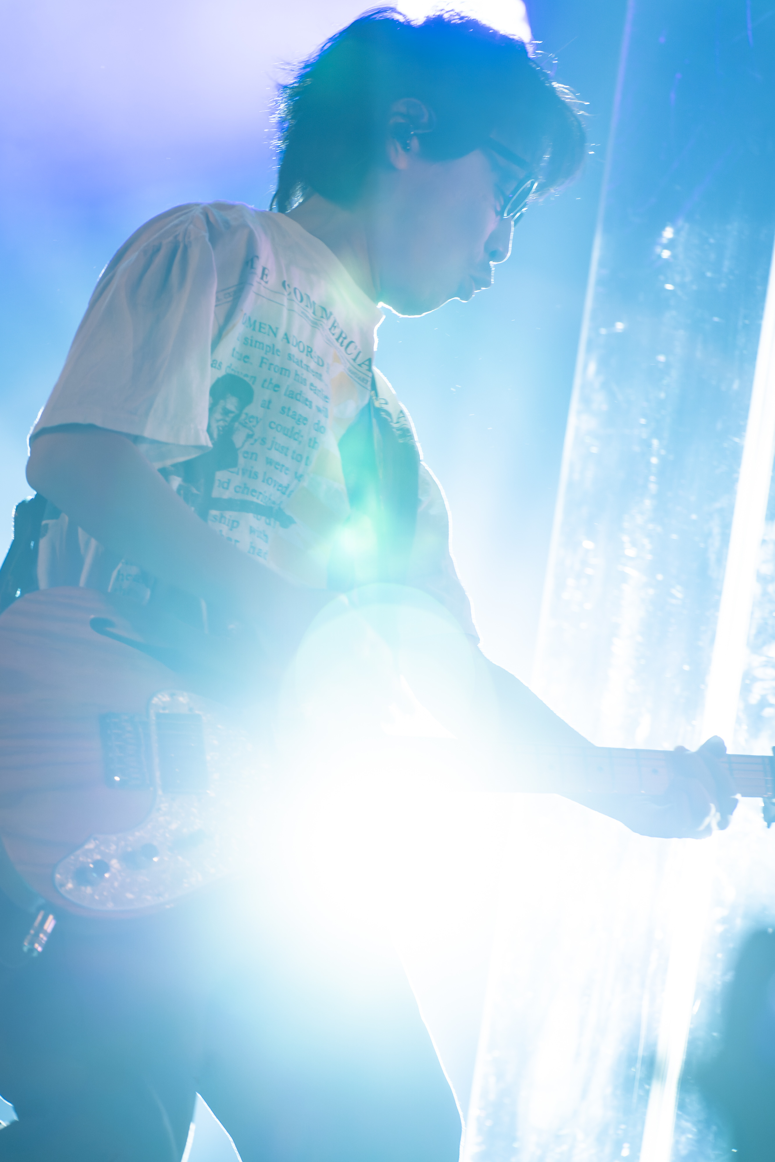 そう真っすぐな思いを吐露すると、澄んだ青いラインティングの中、「ナイトオンザプラネット」へなだれ込む。そっと寄り添うような言葉をラップで紡ぎ、抑えたアンサンブルゆえ粒立った音が絡み合い、バンドの新たな音像を提示。躍動するリズムを刻みながら長谷川カオナシ(Ba)が情感たっぷりの歌声を響かせ、「しょうもな」ではサビの階段を駆け上るような美メロにグッと心を掴まれる。小川幸慈(Gt)のドライブするギターが場を掌握し、小泉拓(Dr)の精微なドラミングにもアドレナリンは全開!