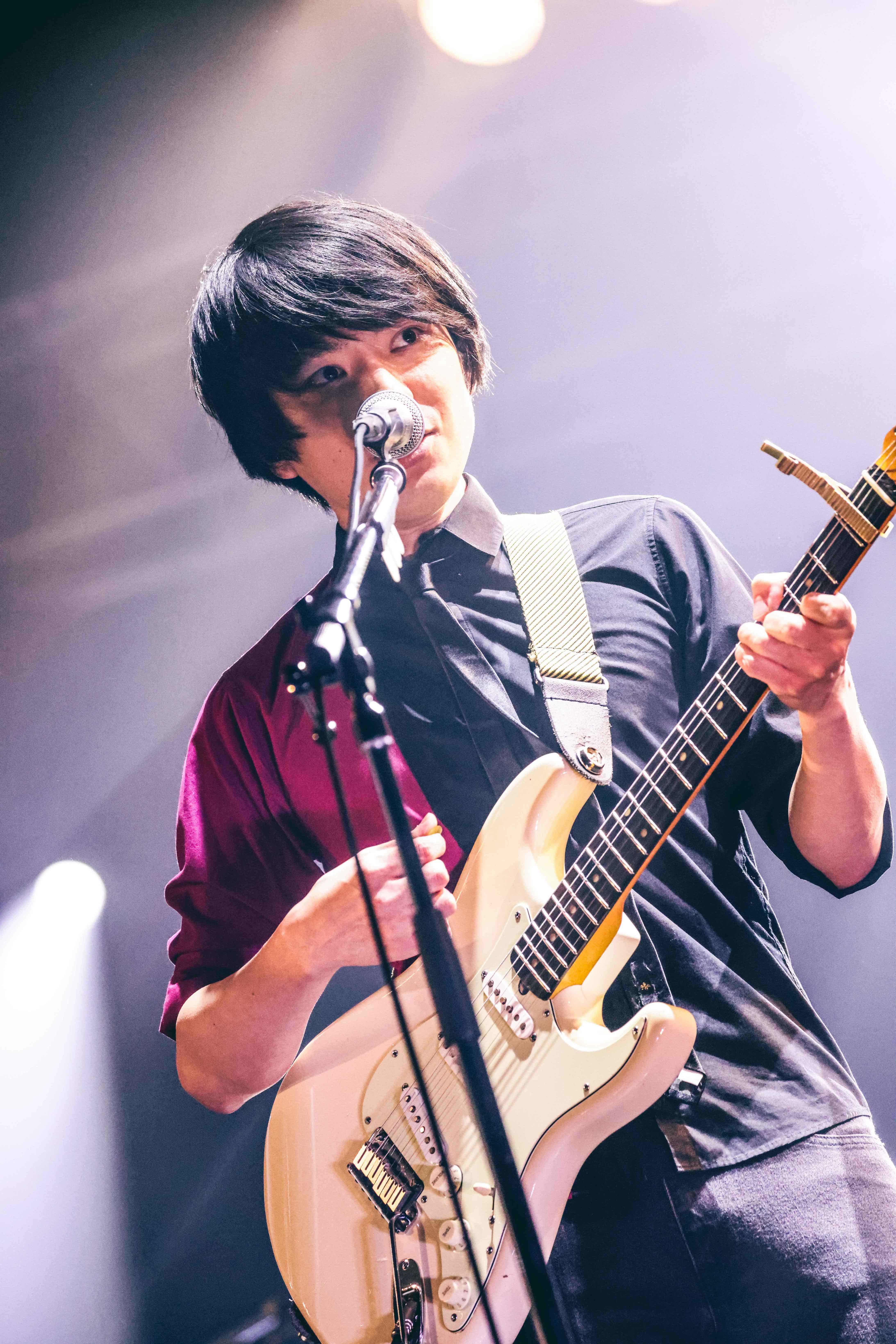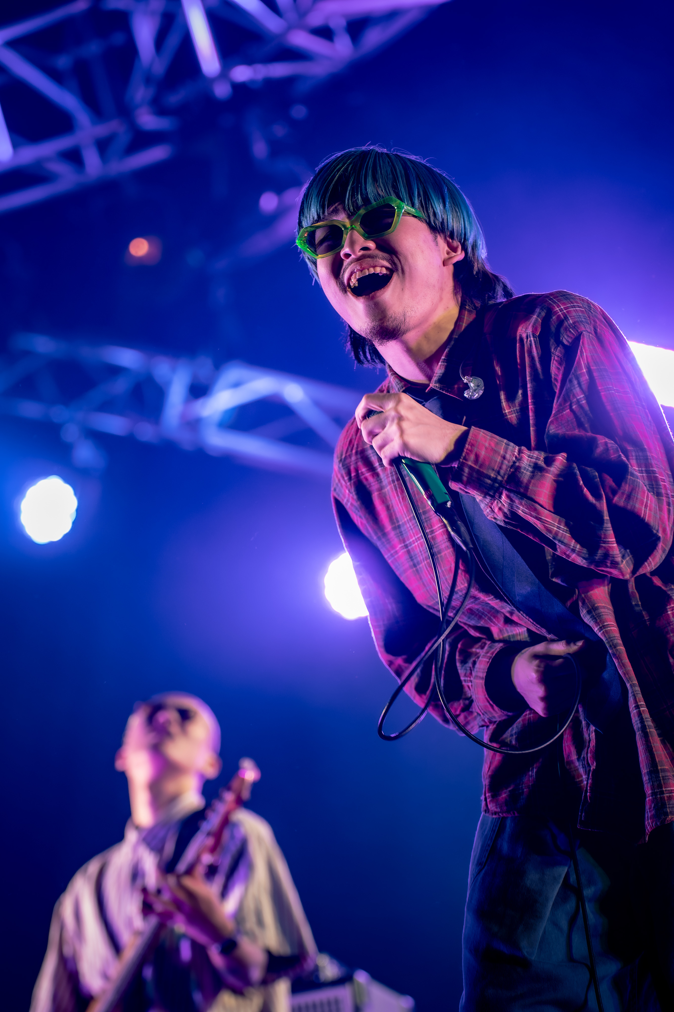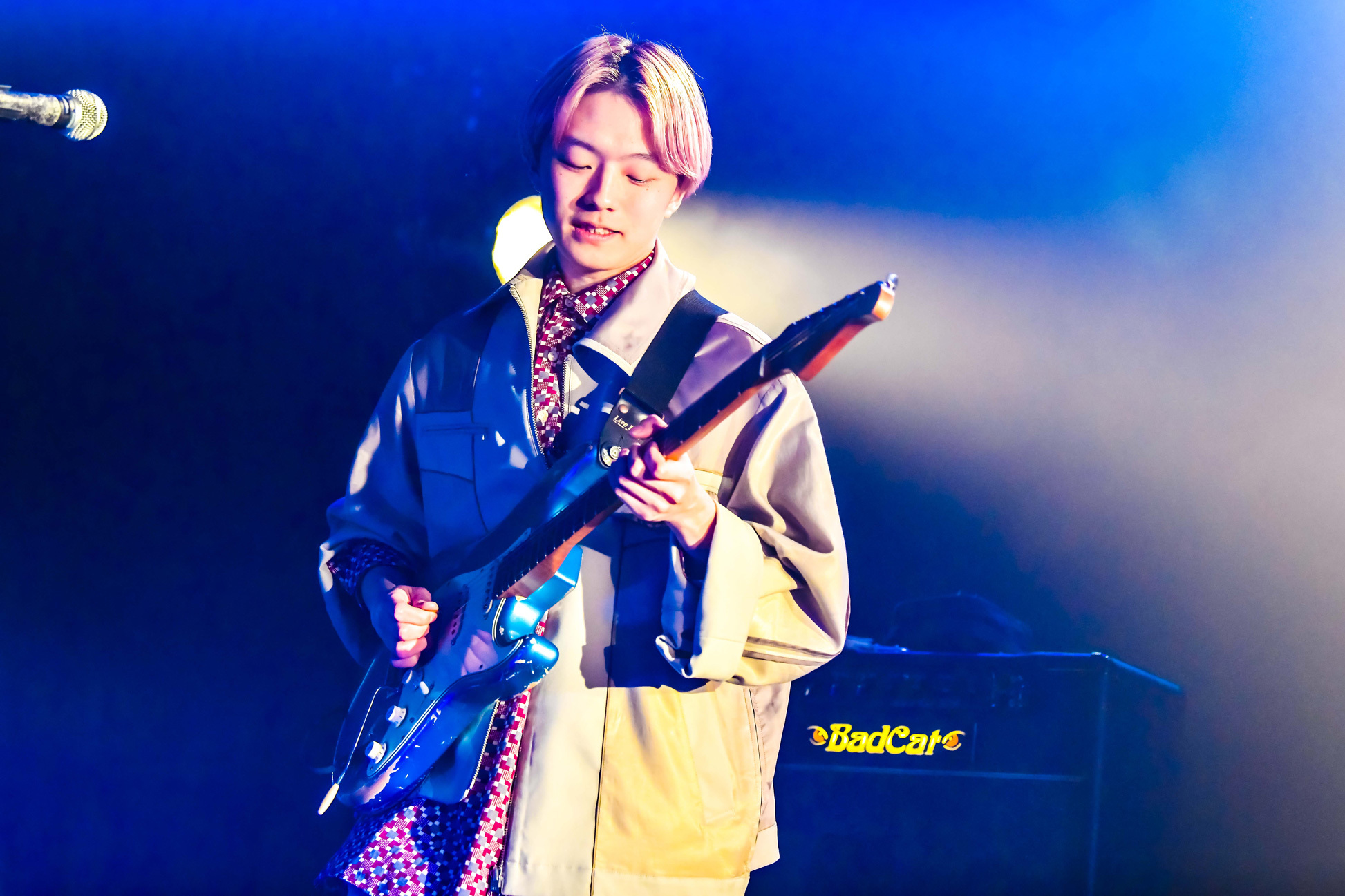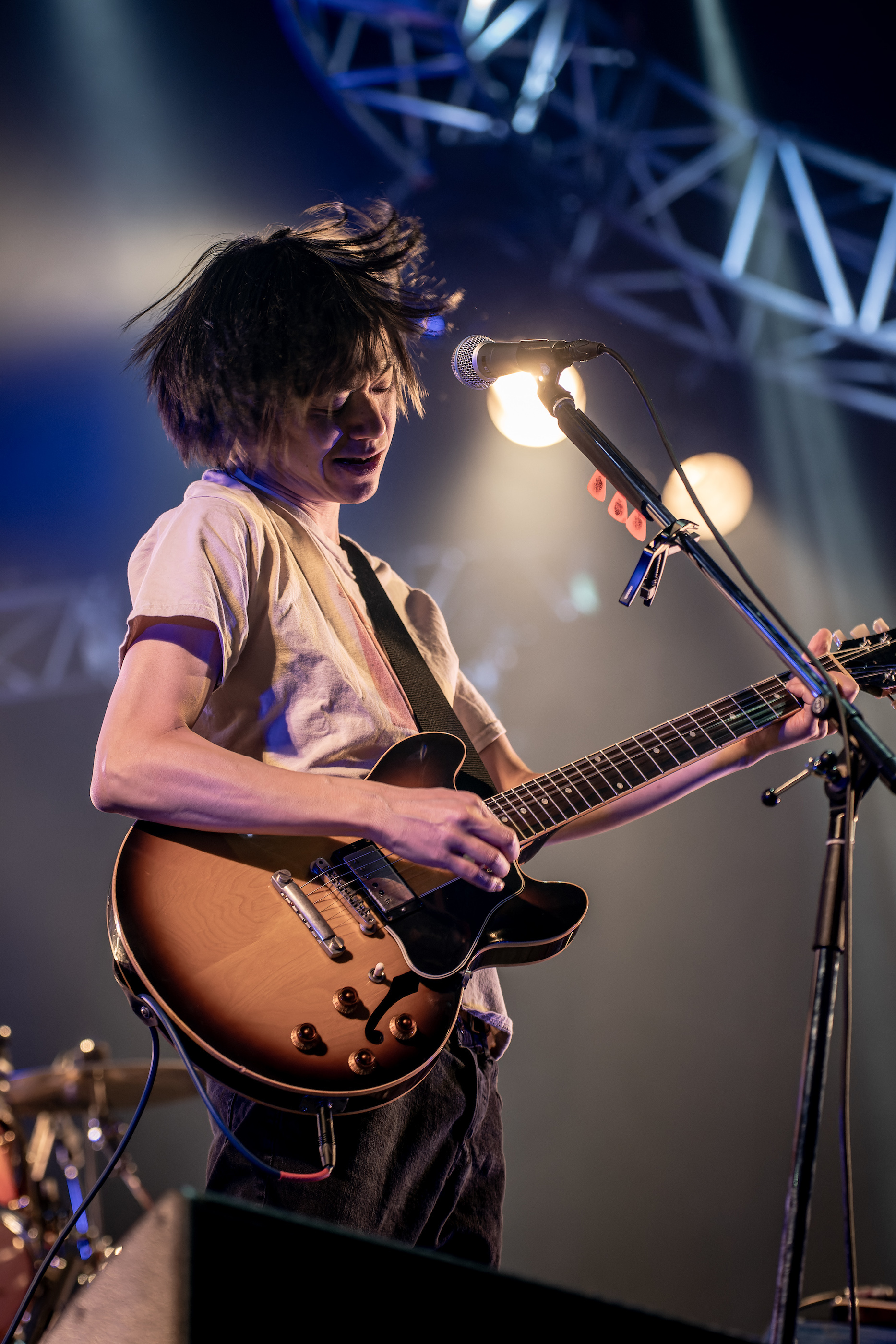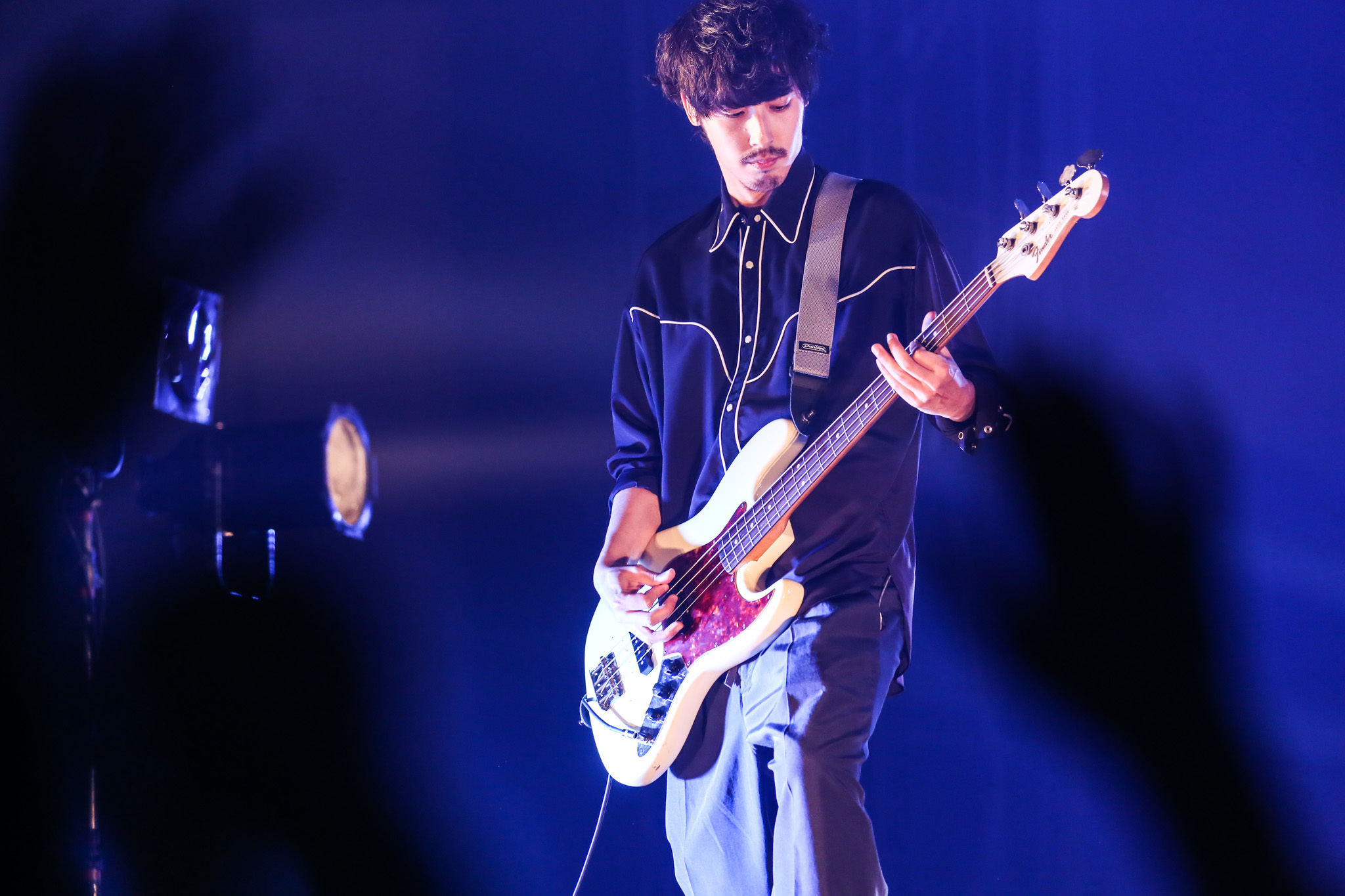 そう真っすぐな思いを吐露すると、澄んだ青いラインティングの中、「ナイトオンザプラネット」へなだれ込む。そっと寄り添うような言葉をラップで紡ぎ、抑えたアンサンブルゆえ粒立った音が絡み合い、バンドの新たな音像を提示。躍動するリズムを刻みながら長谷川カオナシ(Ba)が情感たっぷりの歌声を響かせ、「しょうもな」ではサビの階段を駆け上るような美メロにグッと心を掴まれる。小川幸慈(Gt)のドライブするギターが場を掌握し、小泉拓(Dr)の精微なドラミングにもアドレナリンは全開!
