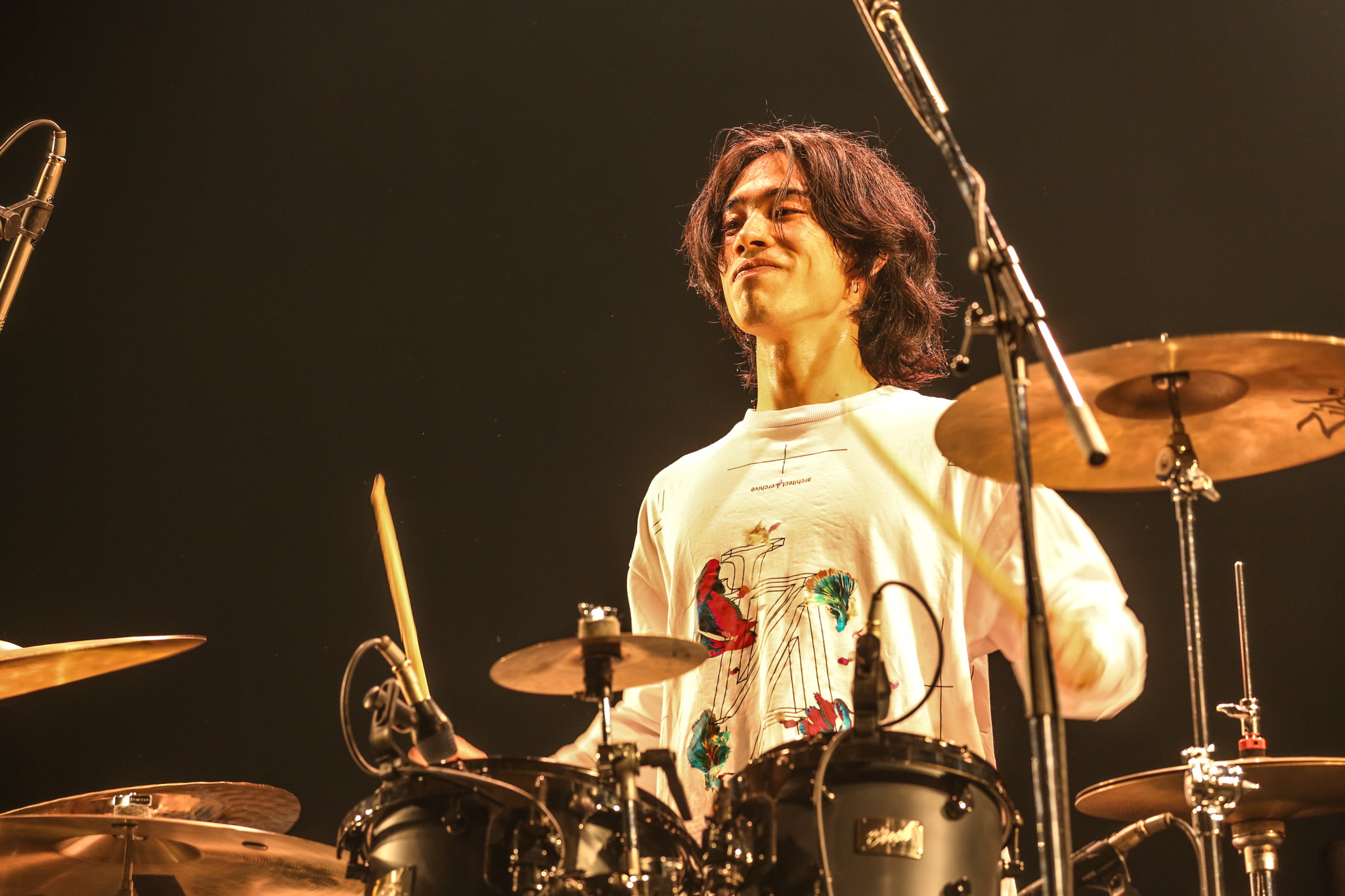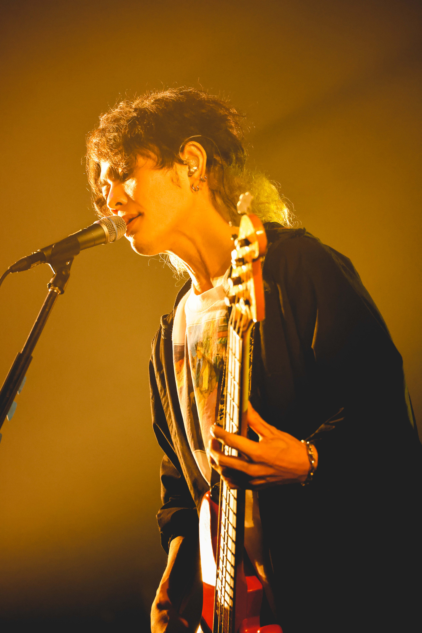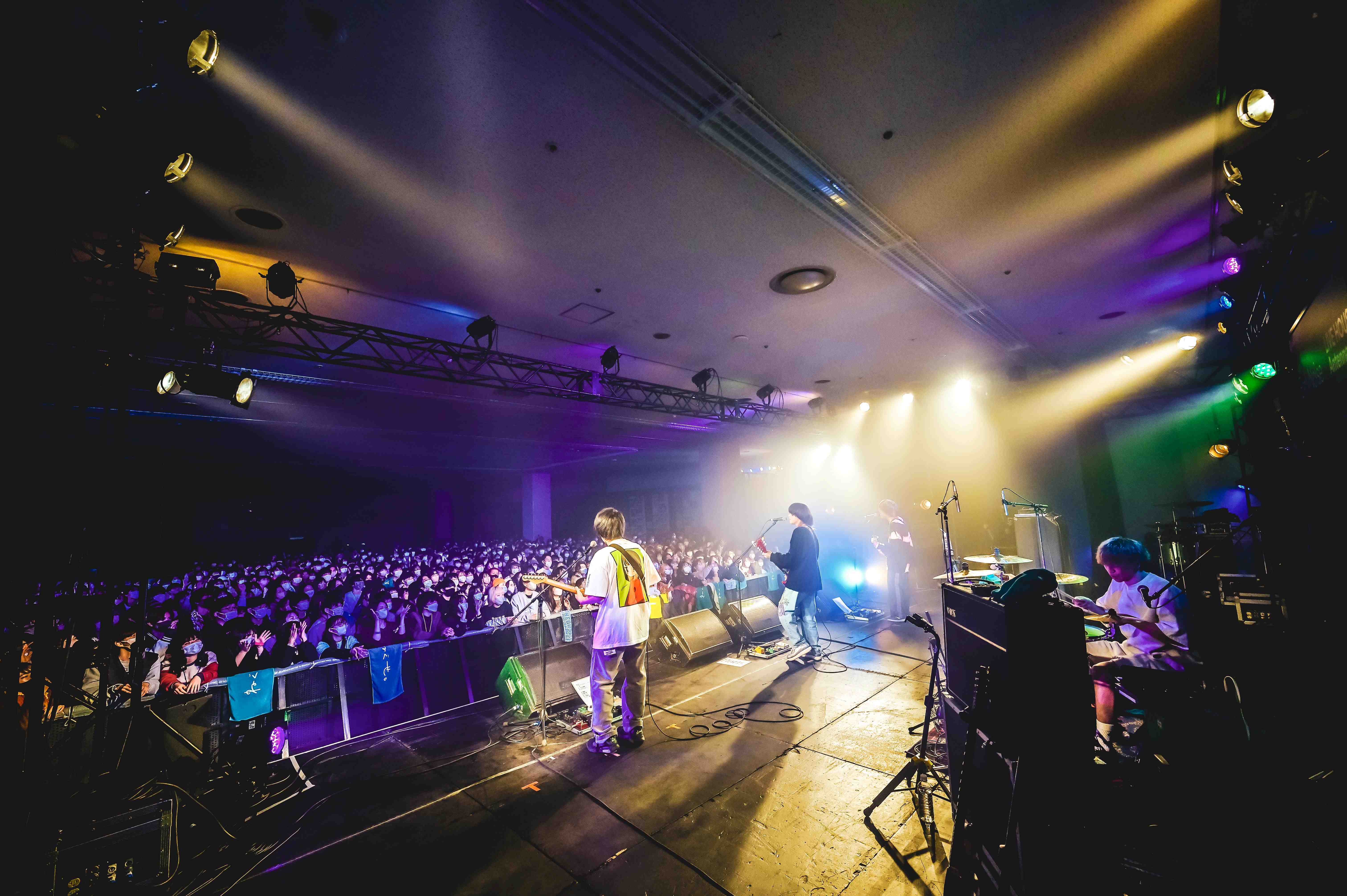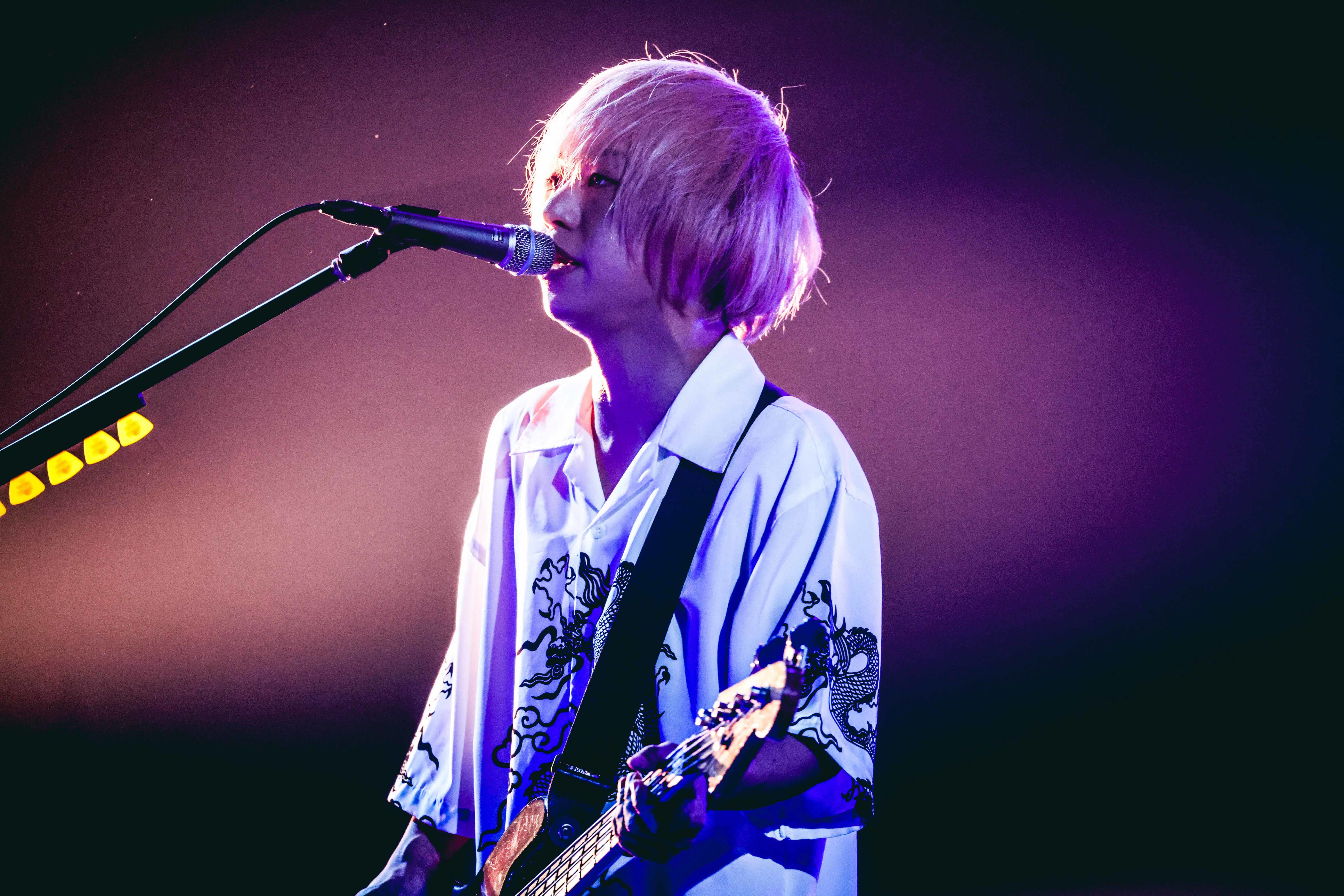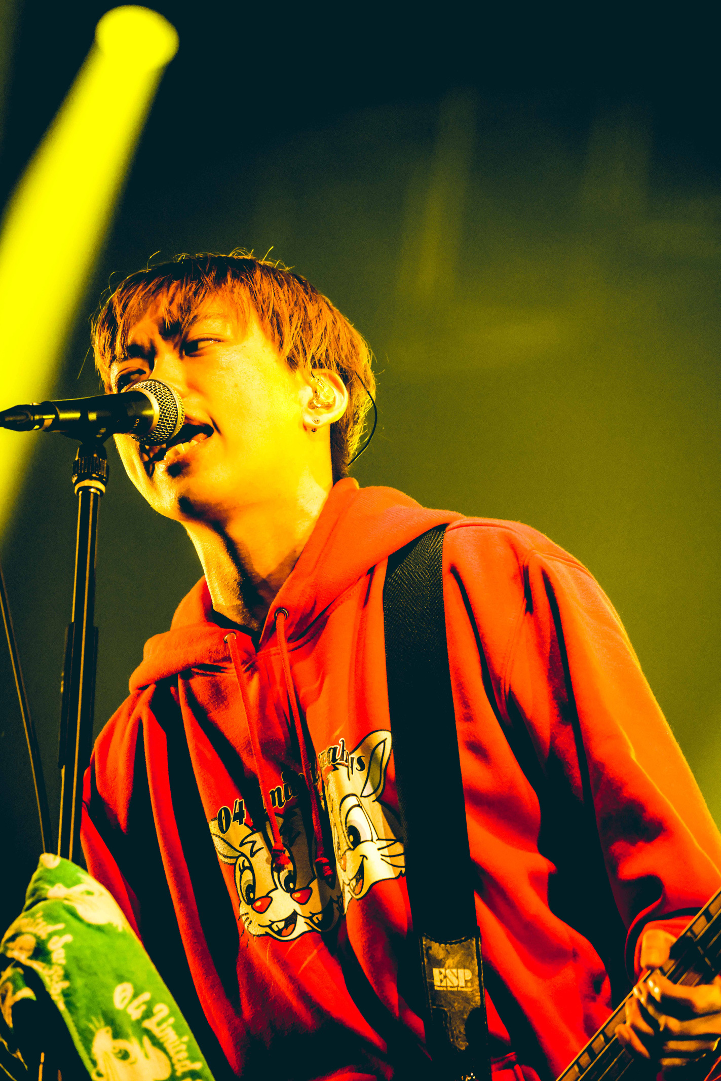 そう真っすぐな思いを吐露すると、澄んだ青いラインティングの中、「ナイトオンザプラネット」へなだれ込む。そっと寄り添うような言葉をラップで紡ぎ、抑えたアンサンブルゆえ粒立った音が絡み合い、バンドの新たな音像を提示。躍動するリズムを刻みながら長谷川カオナシ(Ba)が情感たっぷりの歌声を響かせ、「しょうもな」ではサビの階段を駆け上るような美メロにグッと心を掴まれる。小川幸慈(Gt)のドライブするギターが場を掌握し、小泉拓(Dr)の精微なドラミングにもアドレナリンは全開!