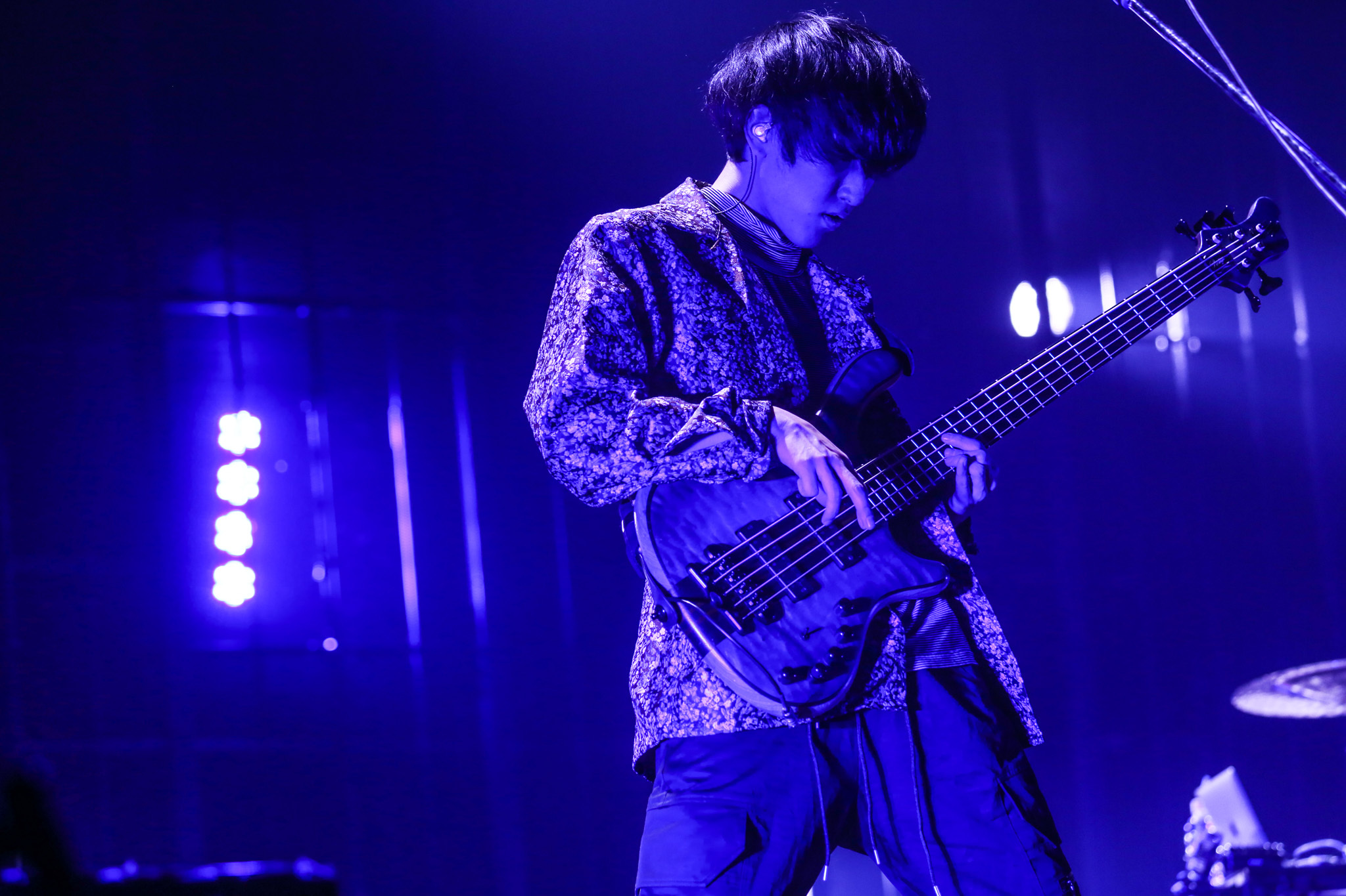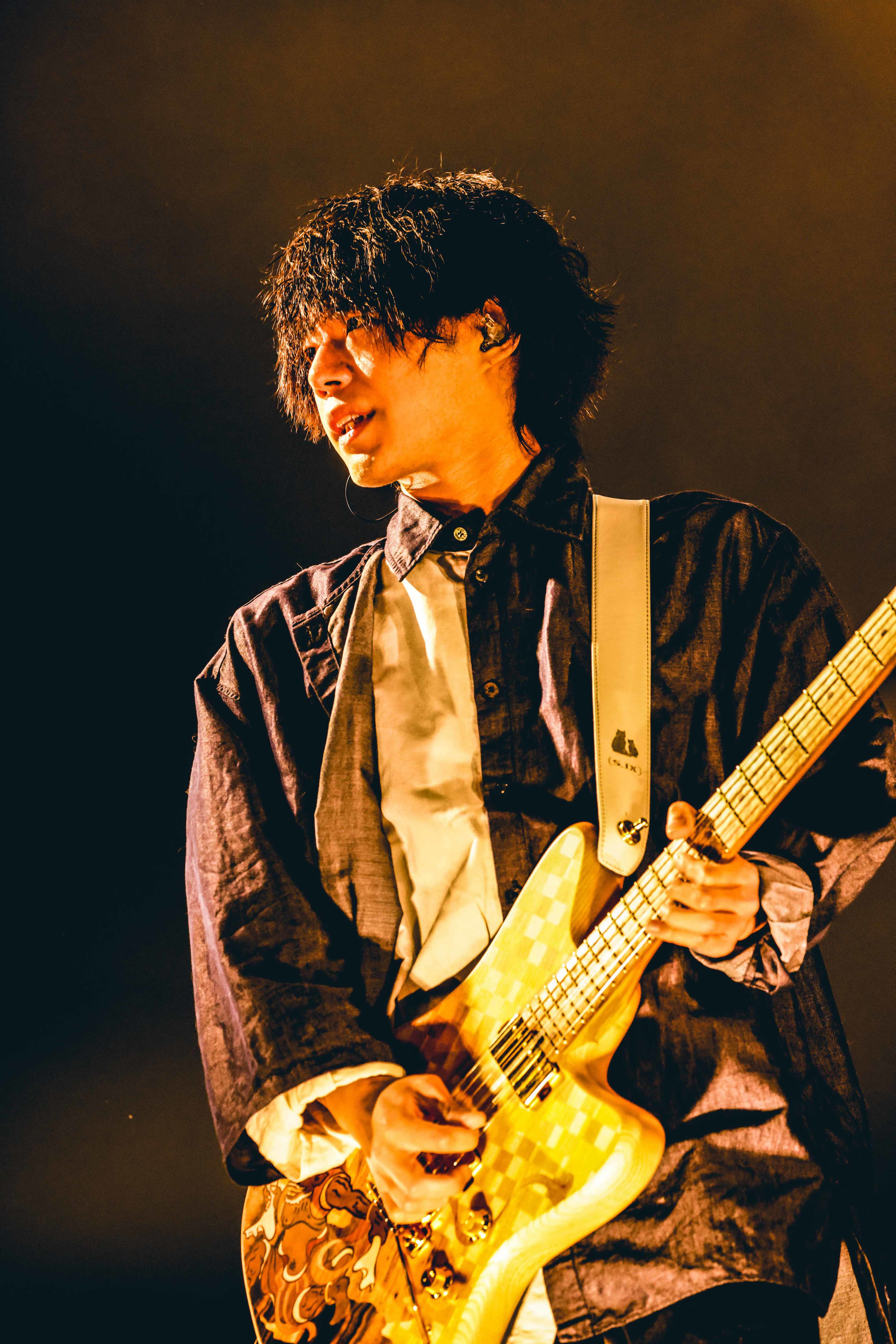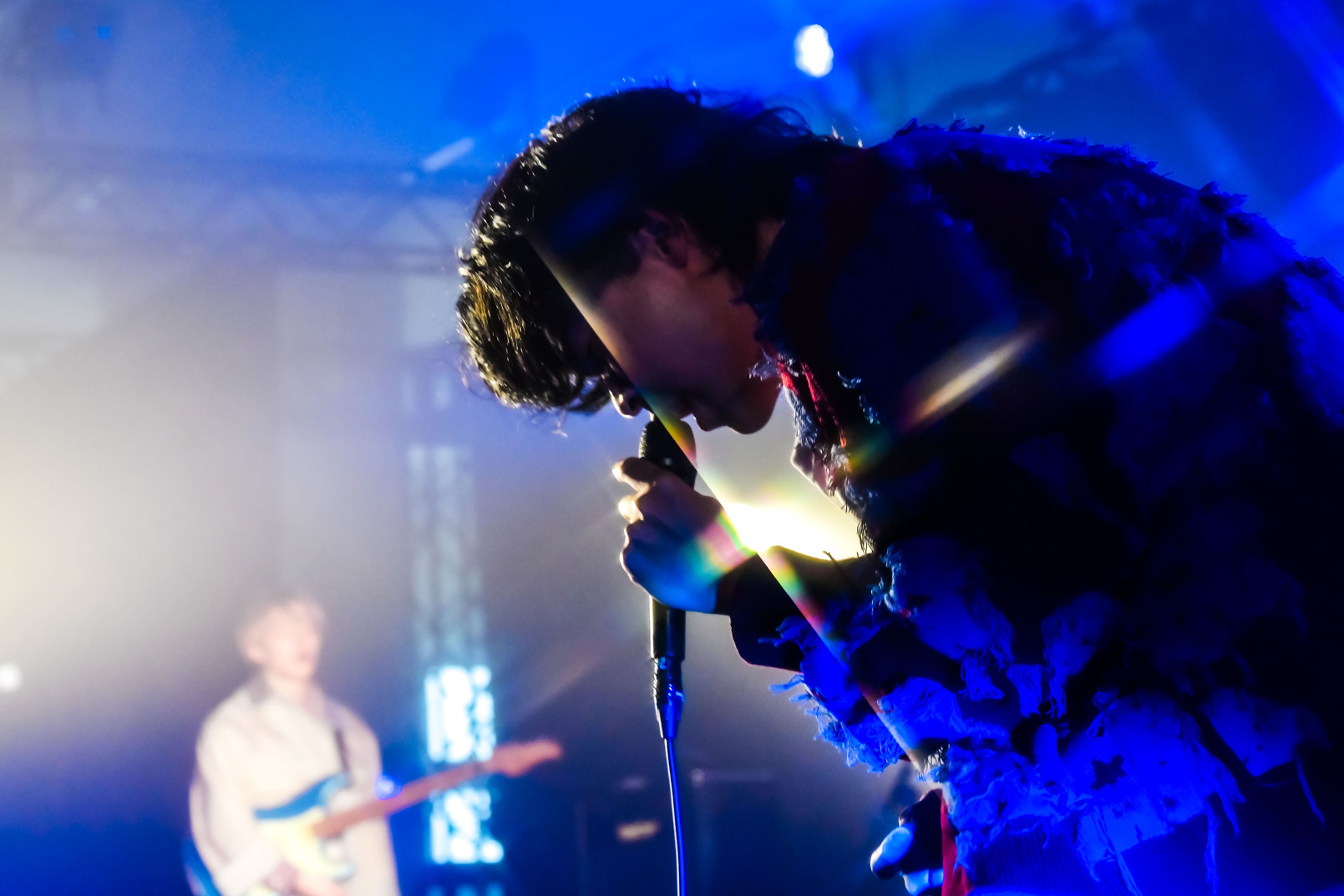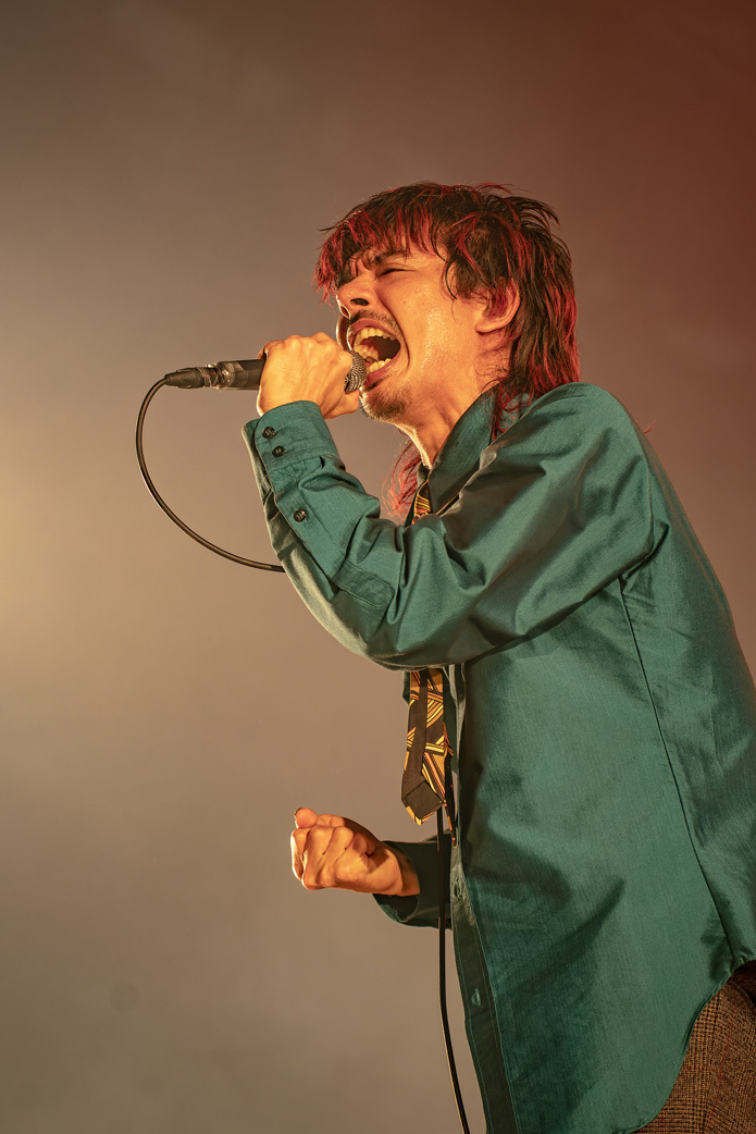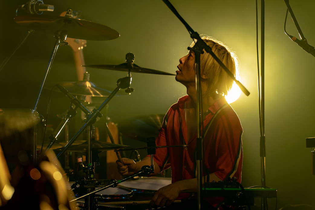 そう真っすぐな思いを吐露すると、澄んだ青いラインティングの中、「ナイトオンザプラネット」へなだれ込む。そっと寄り添うような言葉をラップで紡ぎ、抑えたアンサンブルゆえ粒立った音が絡み合い、バンドの新たな音像を提示。躍動するリズムを刻みながら長谷川カオナシ(Ba)が情感たっぷりの歌声を響かせ、「しょうもな」ではサビの階段を駆け上るような美メロにグッと心を掴まれる。小川幸慈(Gt)のドライブするギターが場を掌握し、小泉拓(Dr)の精微なドラミングにもアドレナリンは全開!