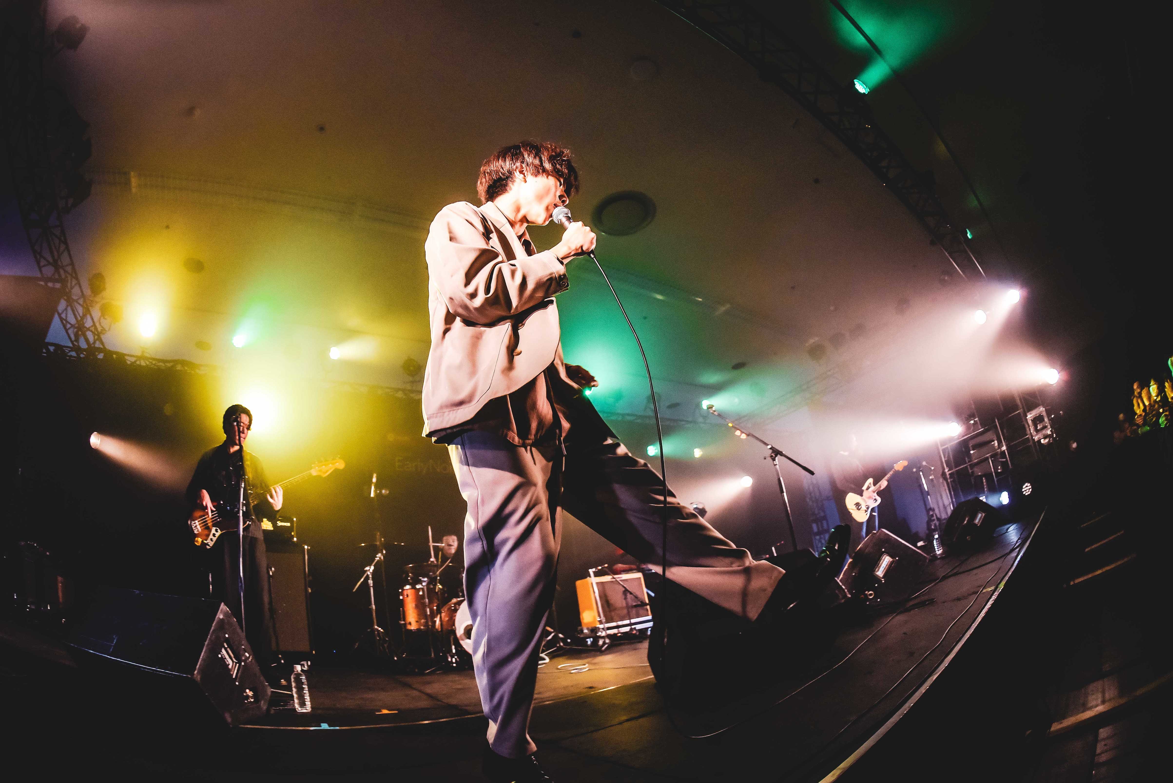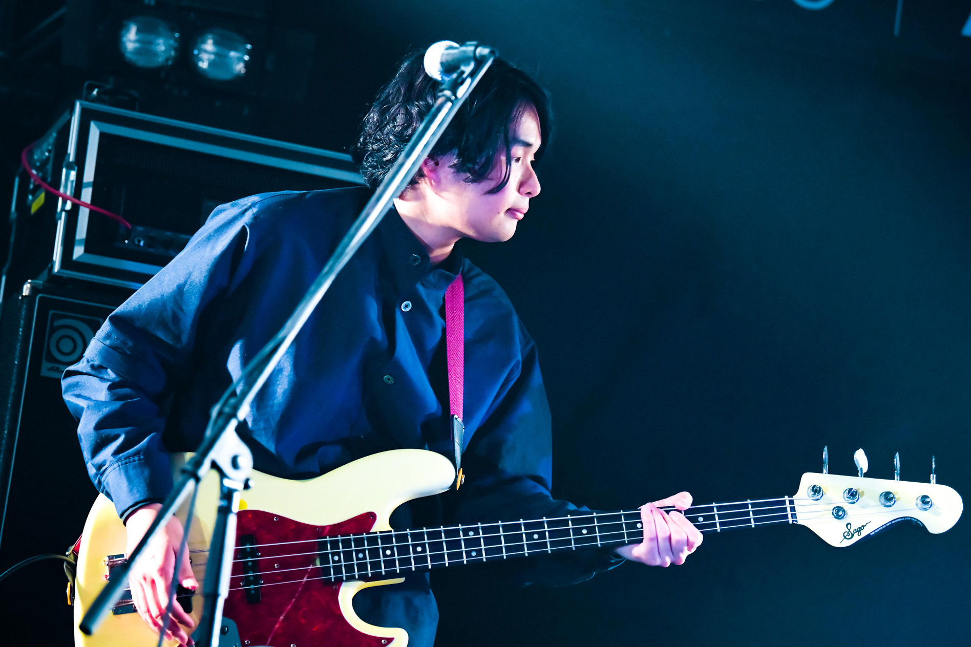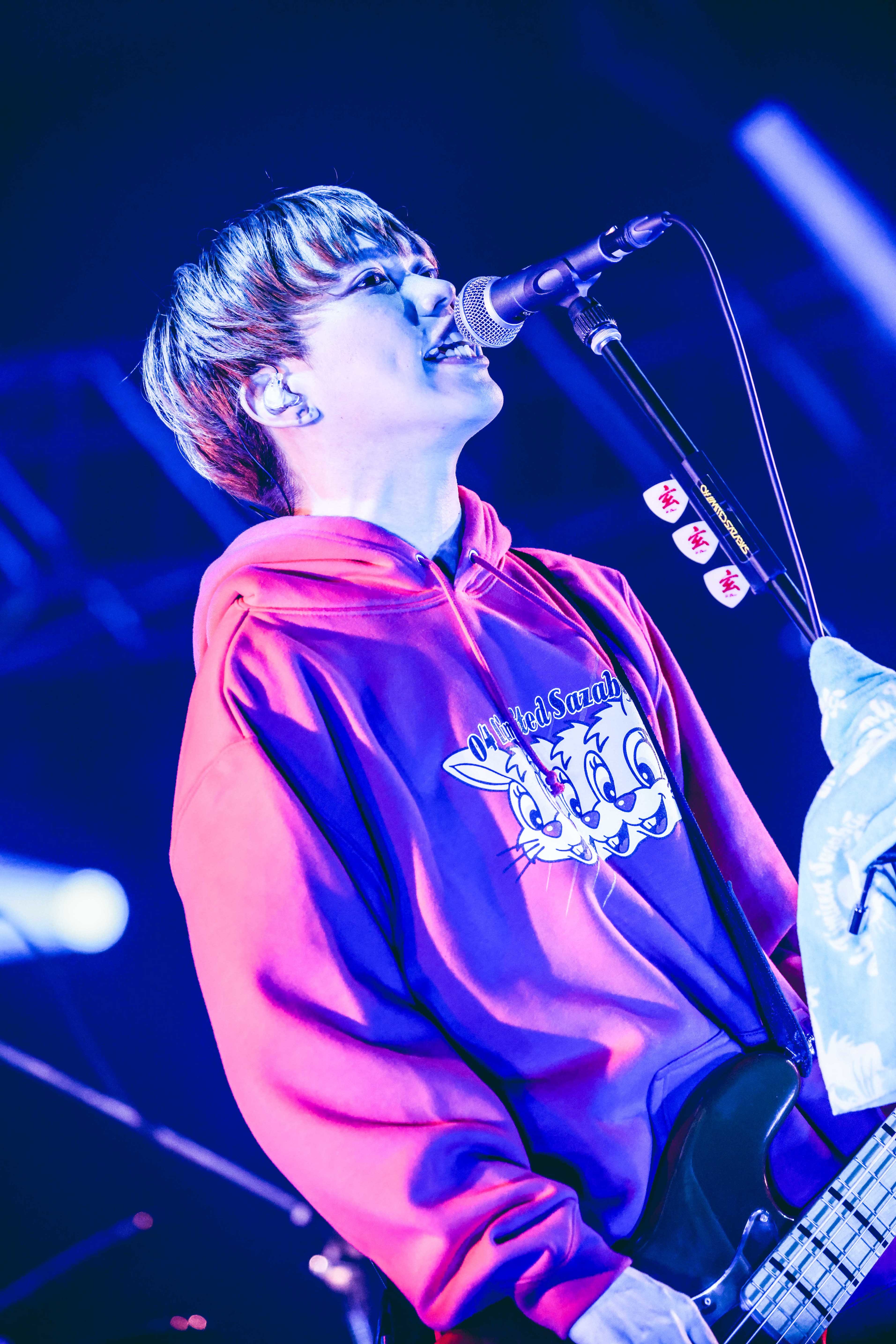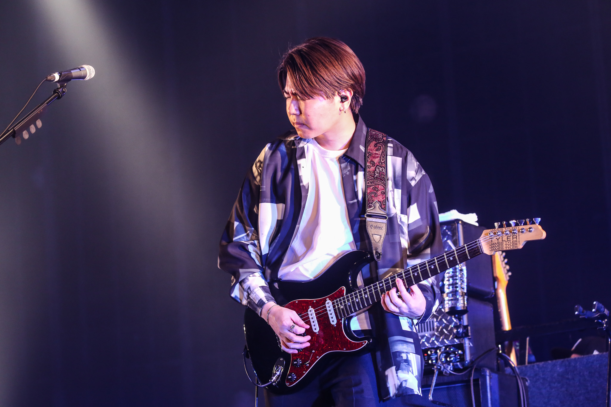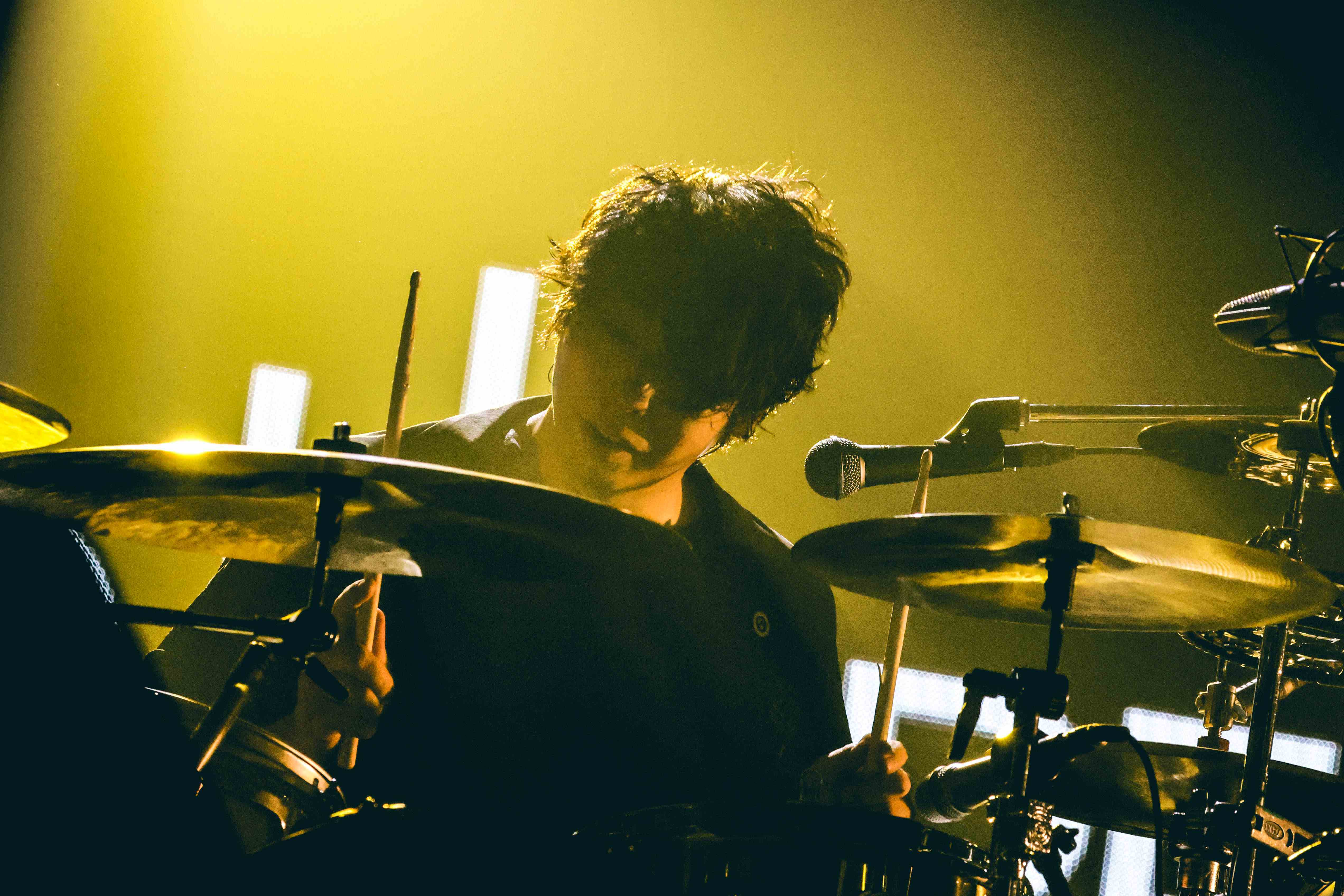 そう真っすぐな思いを吐露すると、澄んだ青いラインティングの中、「ナイトオンザプラネット」へなだれ込む。そっと寄り添うような言葉をラップで紡ぎ、抑えたアンサンブルゆえ粒立った音が絡み合い、バンドの新たな音像を提示。躍動するリズムを刻みながら長谷川カオナシ(Ba)が情感たっぷりの歌声を響かせ、「しょうもな」ではサビの階段を駆け上るような美メロにグッと心を掴まれる。小川幸慈(Gt)のドライブするギターが場を掌握し、小泉拓(Dr)の精微なドラミングにもアドレナリンは全開!