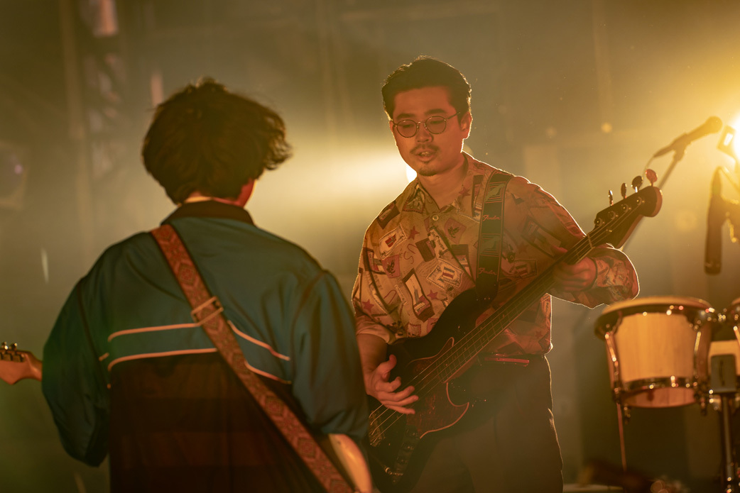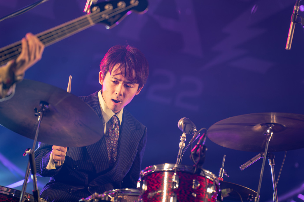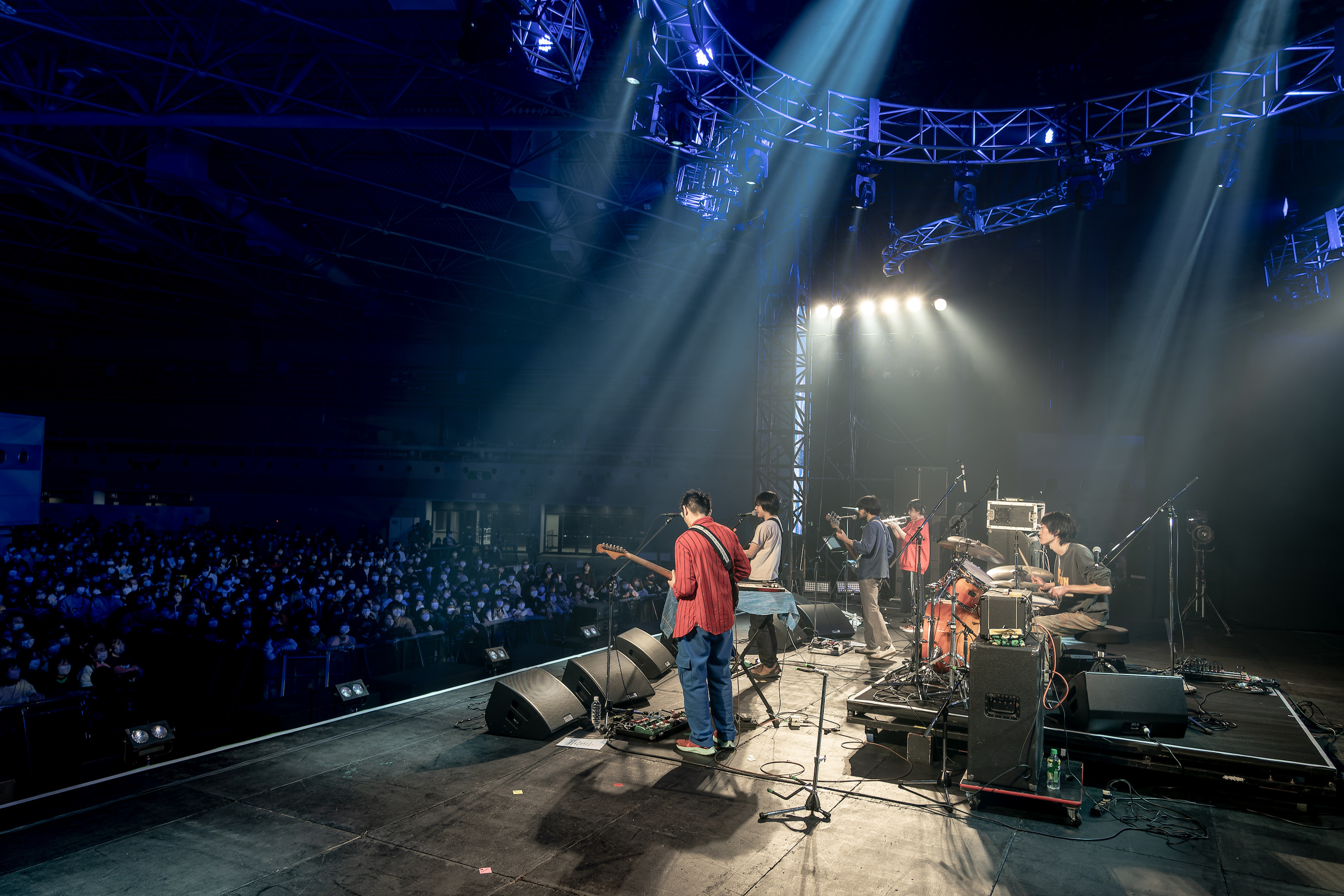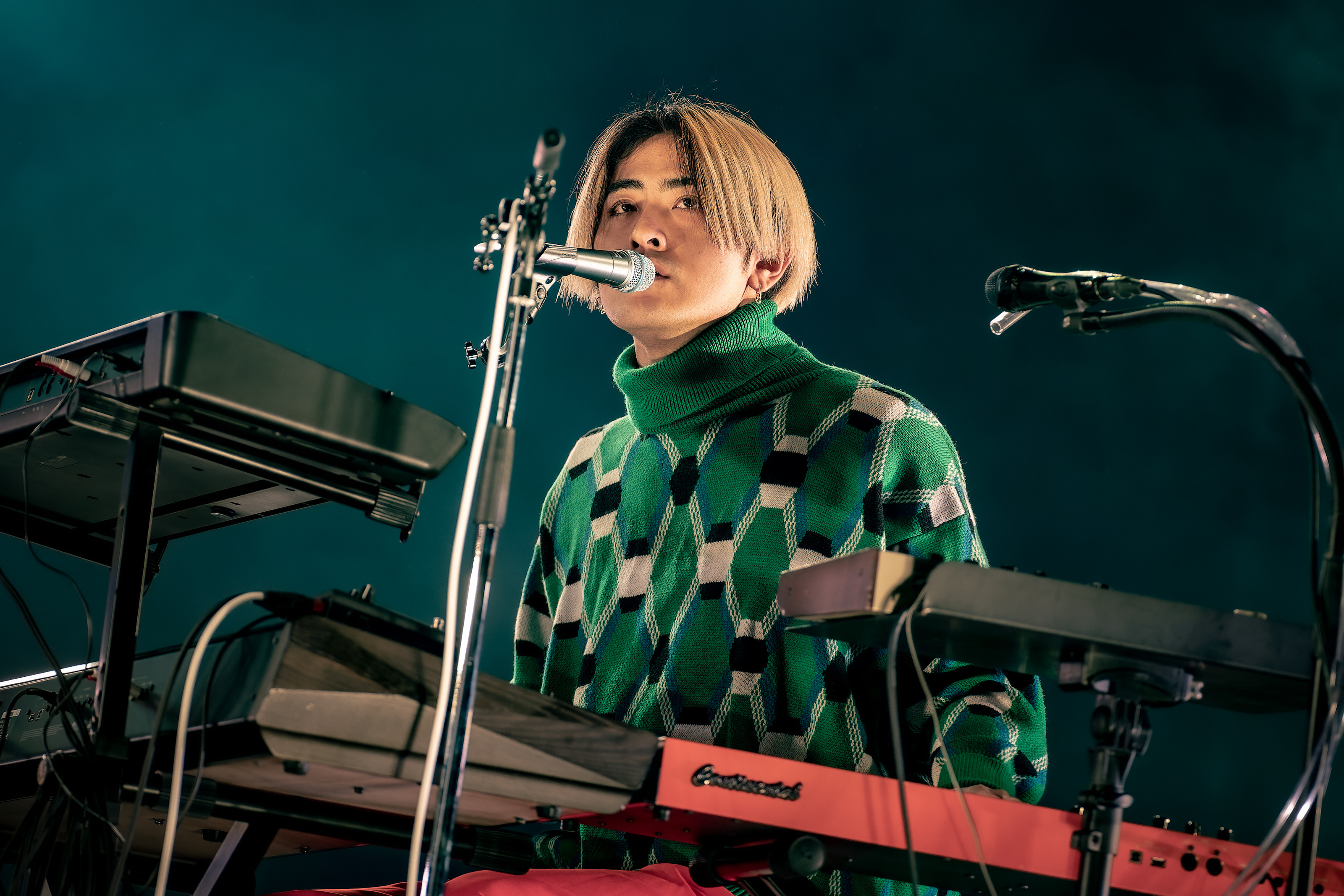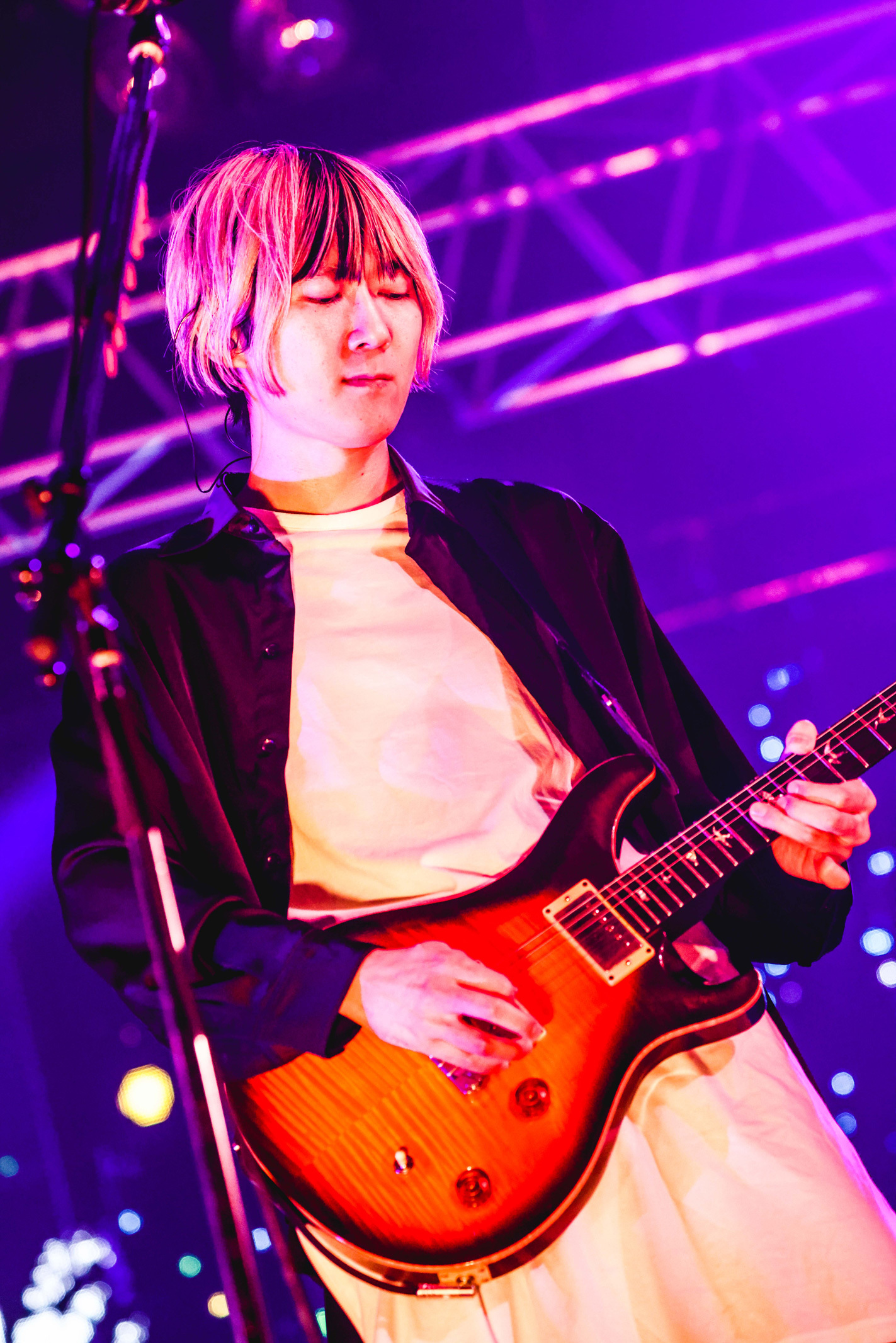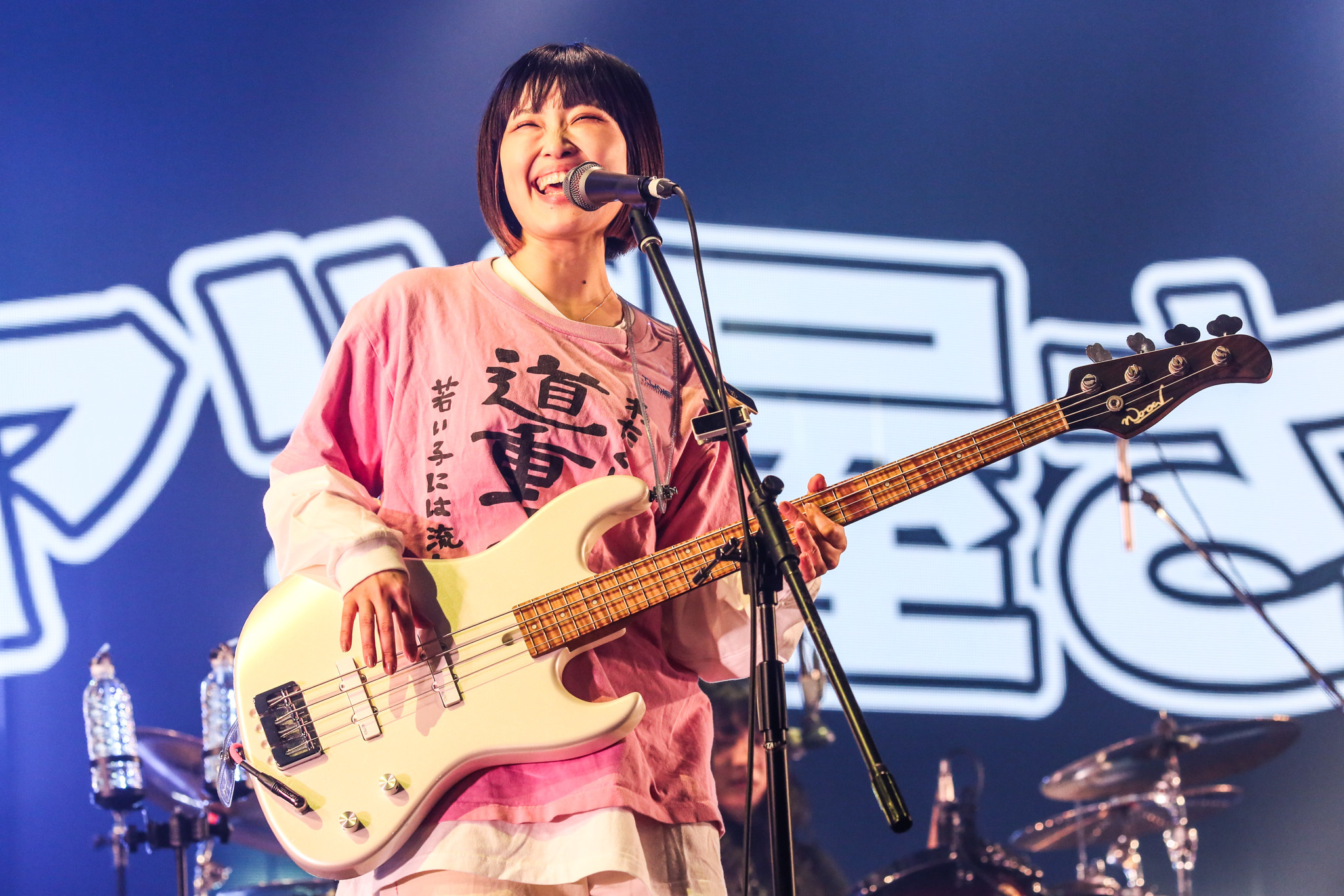 そう真っすぐな思いを吐露すると、澄んだ青いラインティングの中、「ナイトオンザプラネット」へなだれ込む。そっと寄り添うような言葉をラップで紡ぎ、抑えたアンサンブルゆえ粒立った音が絡み合い、バンドの新たな音像を提示。躍動するリズムを刻みながら長谷川カオナシ(Ba)が情感たっぷりの歌声を響かせ、「しょうもな」ではサビの階段を駆け上るような美メロにグッと心を掴まれる。小川幸慈(Gt)のドライブするギターが場を掌握し、小泉拓(Dr)の精微なドラミングにもアドレナリンは全開!