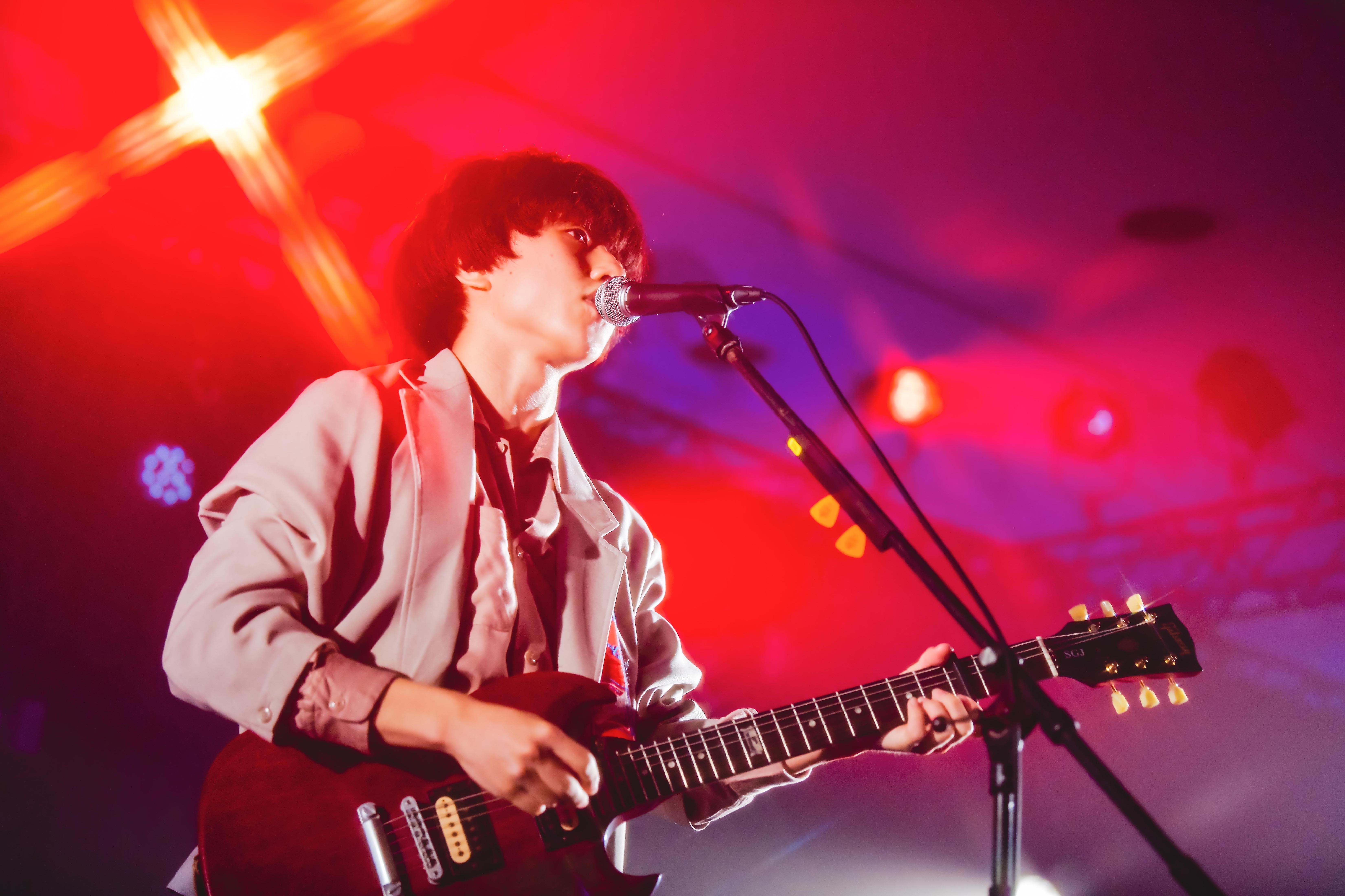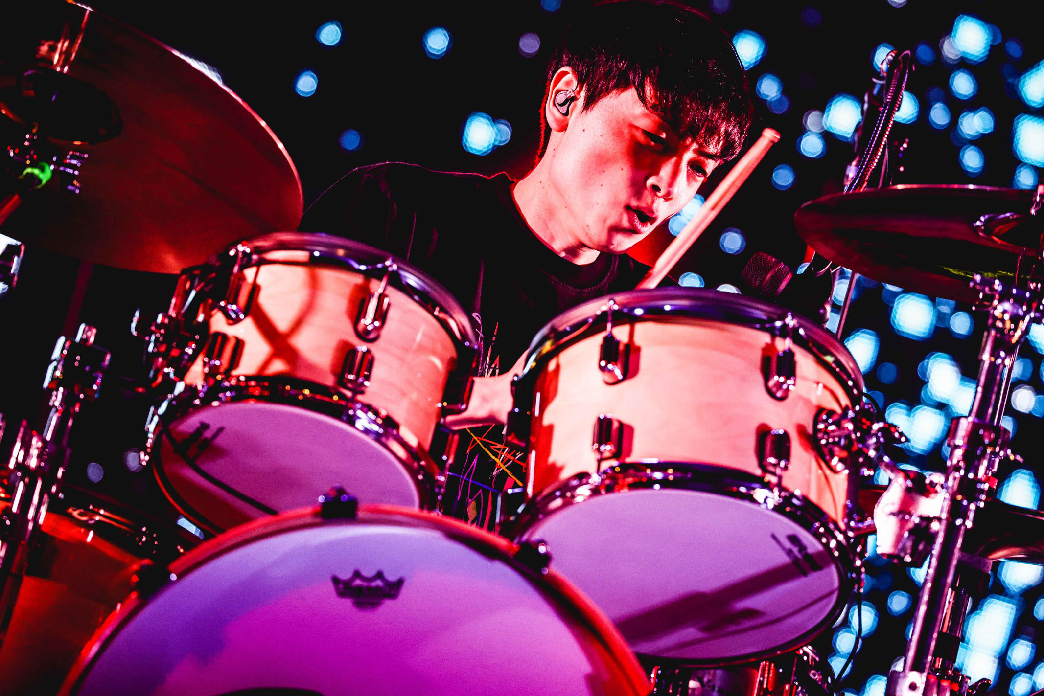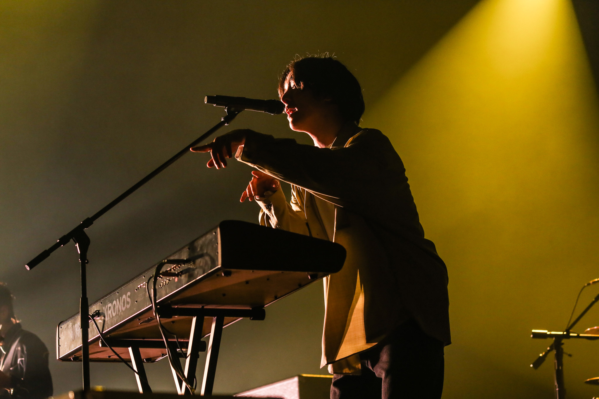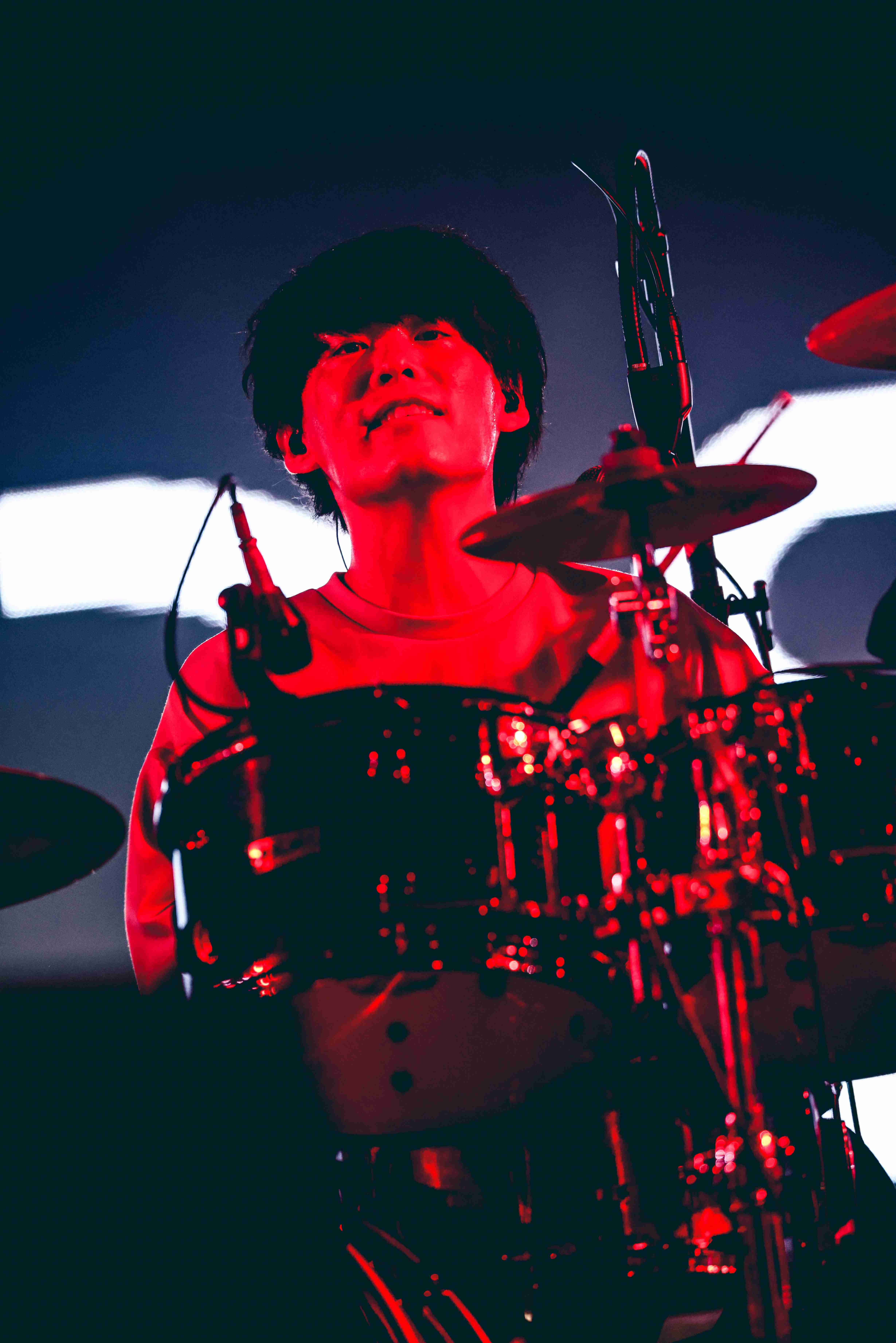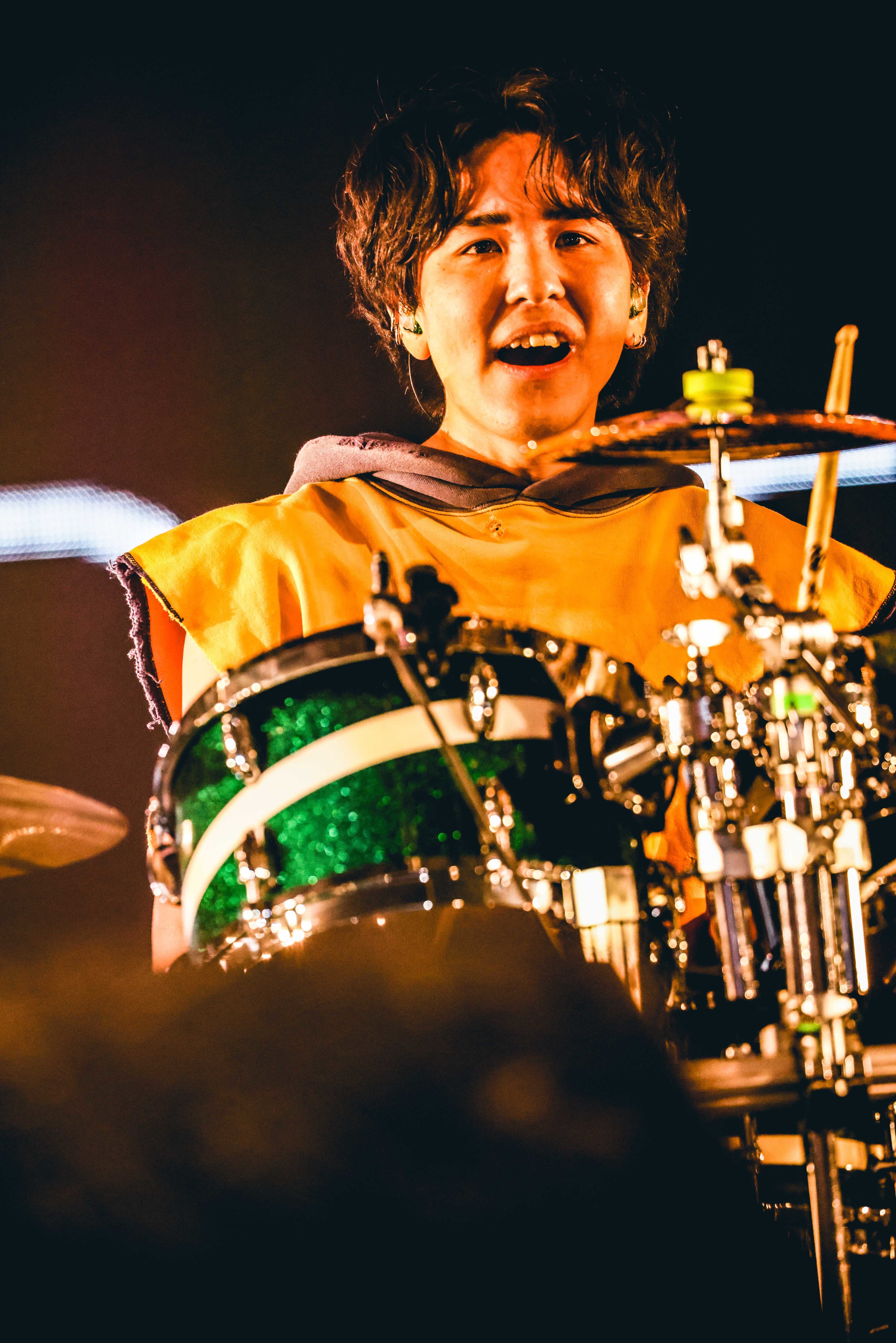 そう真っすぐな思いを吐露すると、澄んだ青いラインティングの中、「ナイトオンザプラネット」へなだれ込む。そっと寄り添うような言葉をラップで紡ぎ、抑えたアンサンブルゆえ粒立った音が絡み合い、バンドの新たな音像を提示。躍動するリズムを刻みながら長谷川カオナシ(Ba)が情感たっぷりの歌声を響かせ、「しょうもな」ではサビの階段を駆け上るような美メロにグッと心を掴まれる。小川幸慈(Gt)のドライブするギターが場を掌握し、小泉拓(Dr)の精微なドラミングにもアドレナリンは全開!