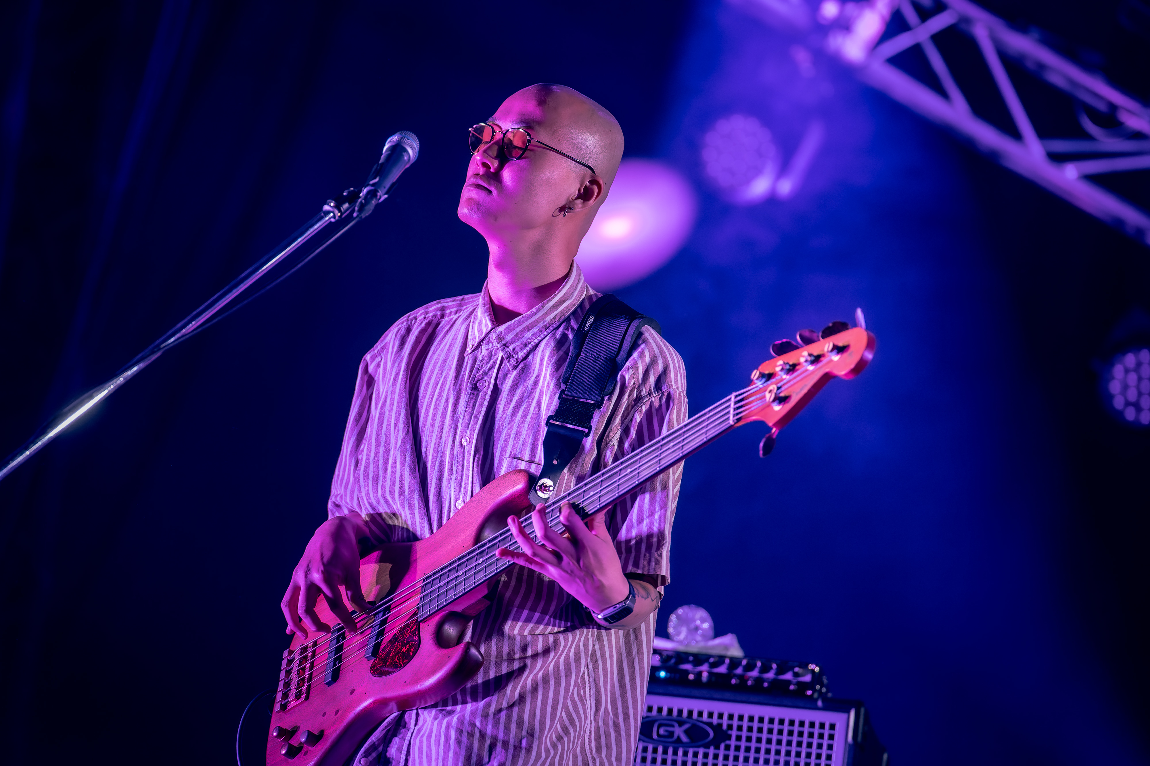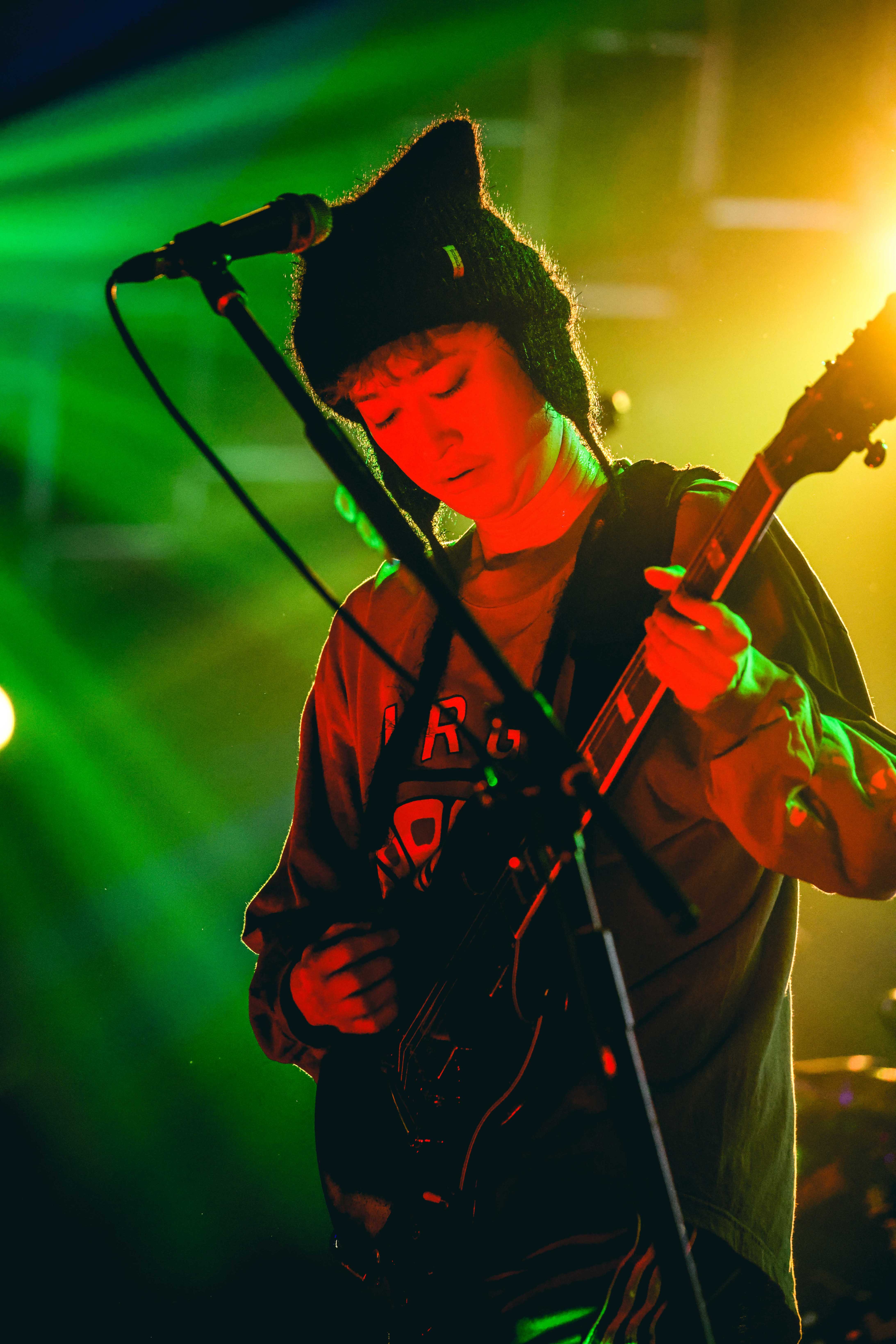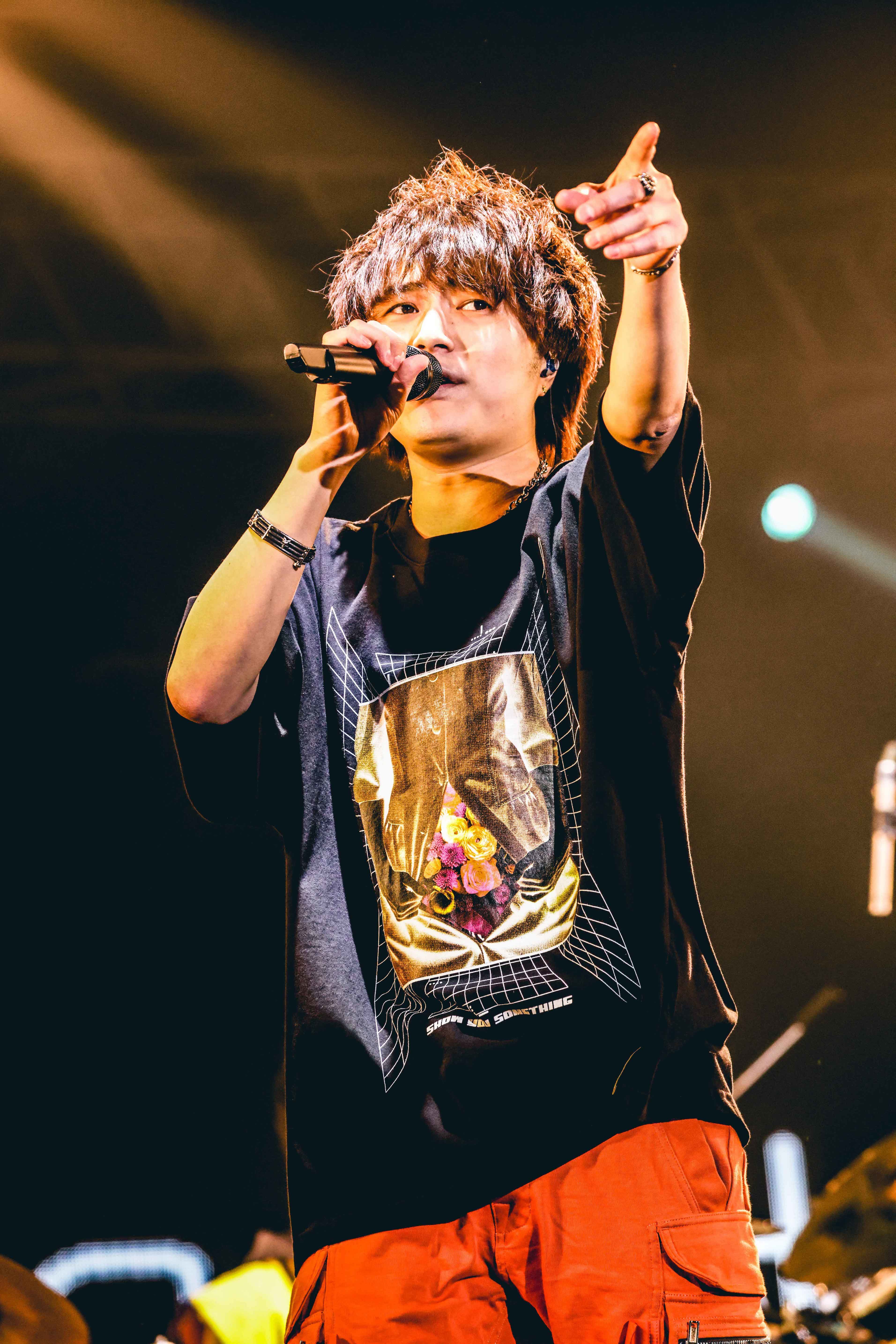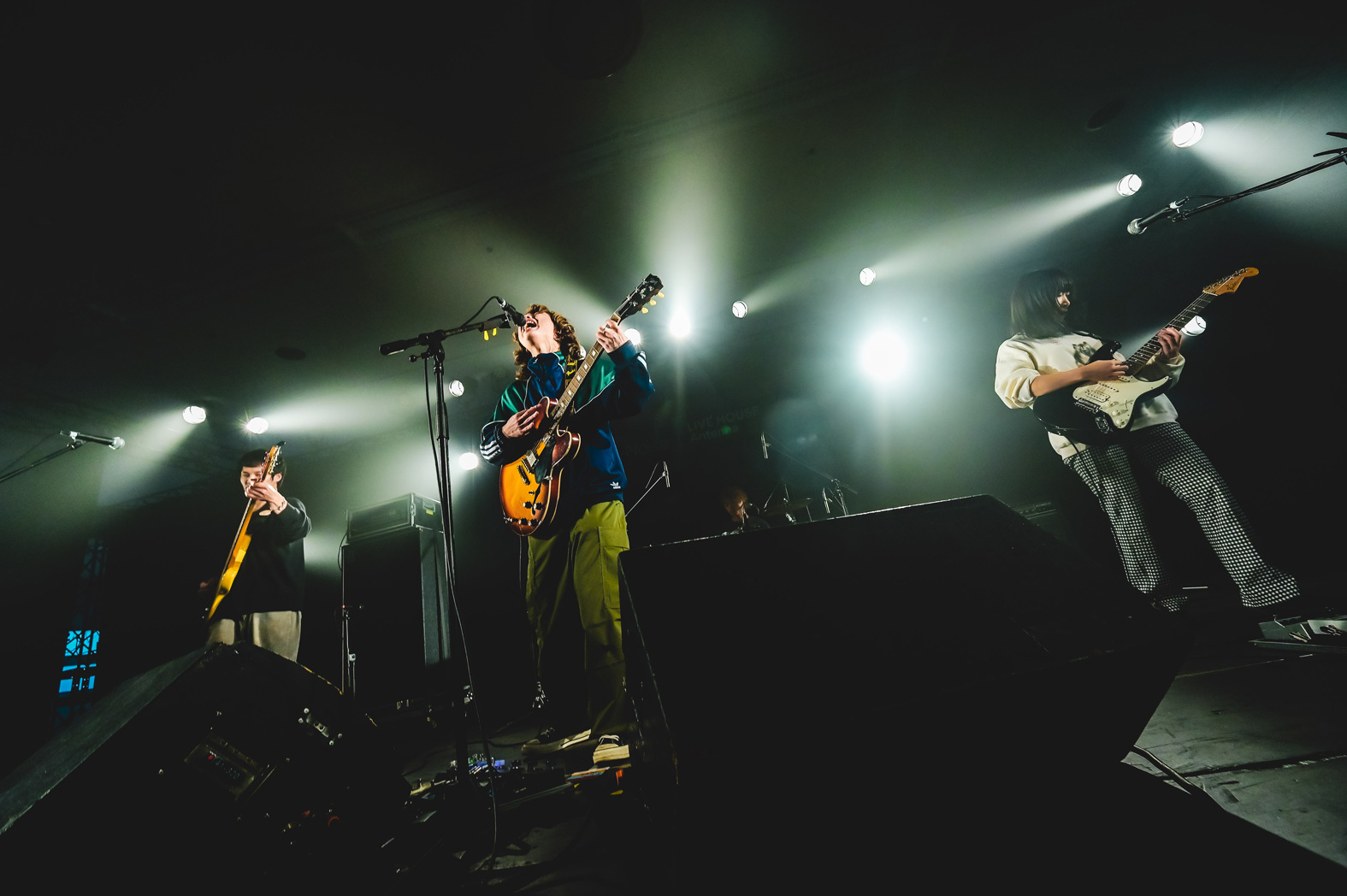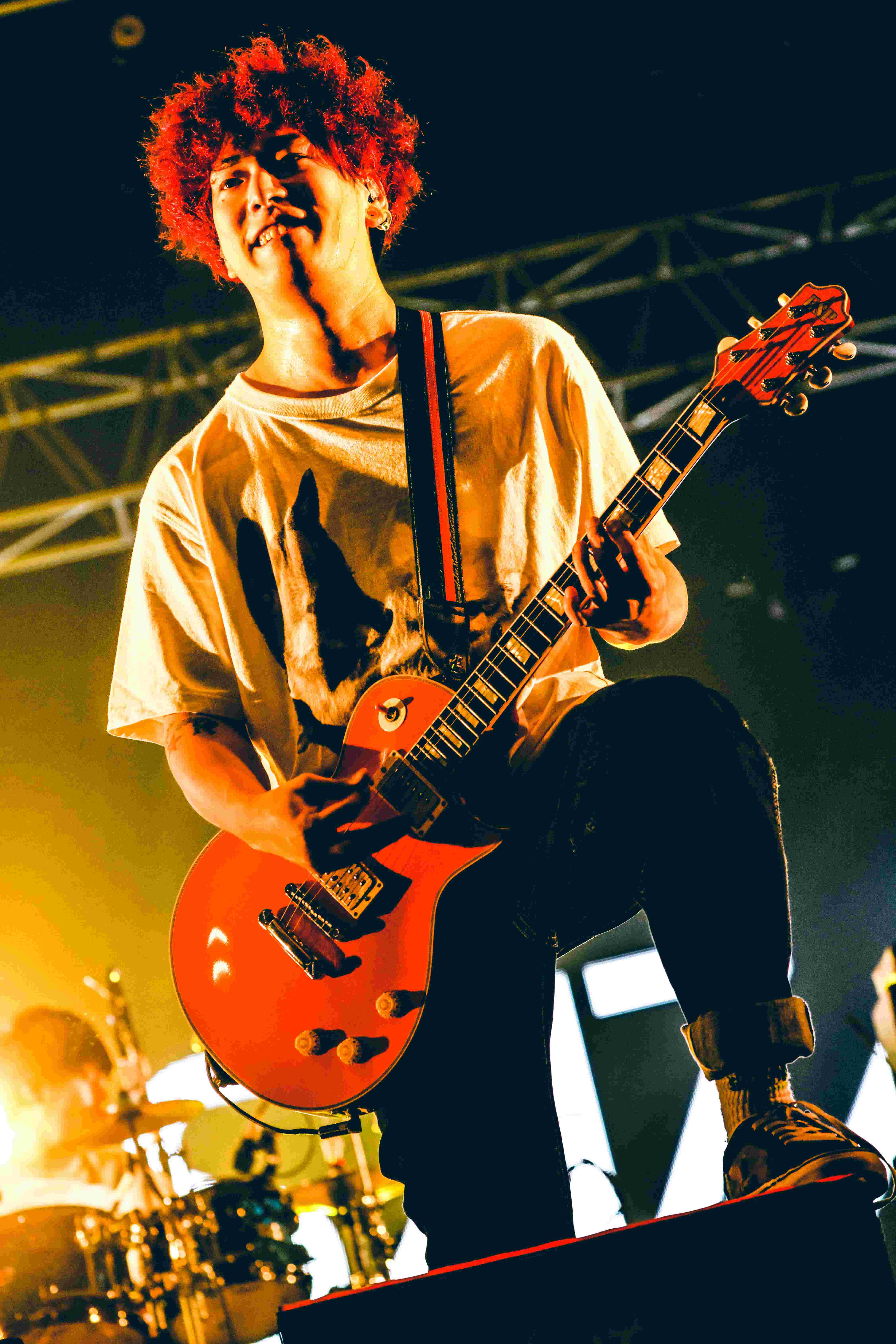 そう真っすぐな思いを吐露すると、澄んだ青いラインティングの中、「ナイトオンザプラネット」へなだれ込む。そっと寄り添うような言葉をラップで紡ぎ、抑えたアンサンブルゆえ粒立った音が絡み合い、バンドの新たな音像を提示。躍動するリズムを刻みながら長谷川カオナシ(Ba)が情感たっぷりの歌声を響かせ、「しょうもな」ではサビの階段を駆け上るような美メロにグッと心を掴まれる。小川幸慈(Gt)のドライブするギターが場を掌握し、小泉拓(Dr)の精微なドラミングにもアドレナリンは全開!
