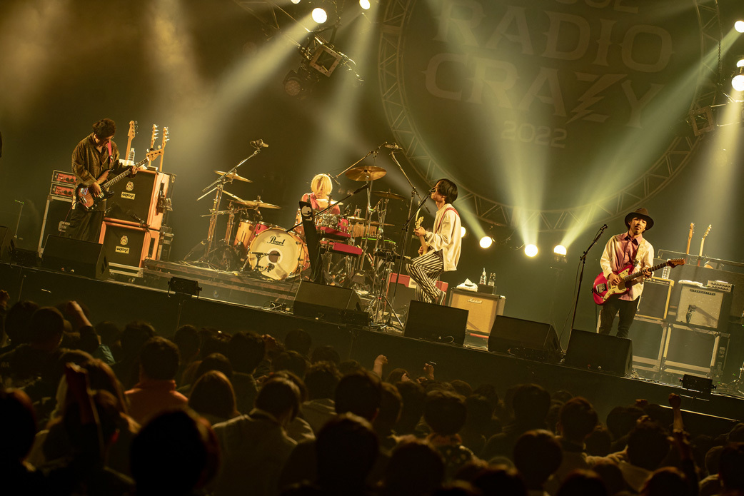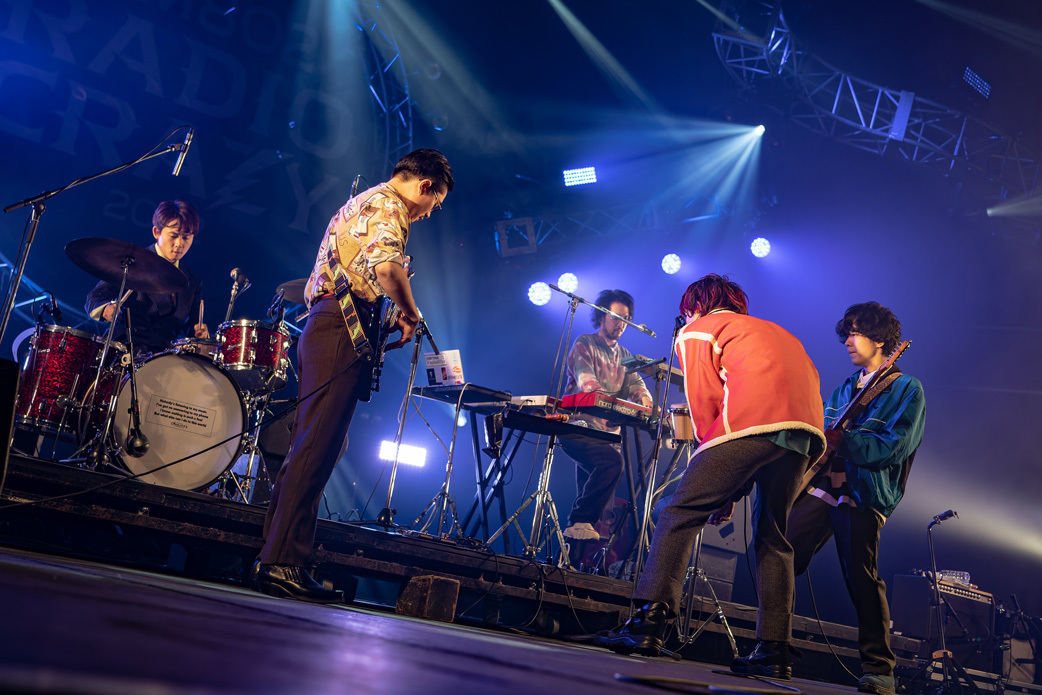 サウンドチェックから大盛り上がりだったOKAMOTO’Sは、『RADIO CRAZY』皆勤賞を更新中。今年で13年連続の出演となった。オカモトショウ(Vo)が「いくぜ『RADIO CRAZY』!」と叫ぶと、サポートにBRIAN SHINSEKAI(Key)を迎えた5人編成で「90’S TOKYO BOYS」からライブスタート。続けてダンサブルな「JOY JOY JOY」を投下し、会場全体を大きく揺らす。ハマ・オカモト(Ba)とオカモトレイジ(Dr)が繰り出すビートは圧倒的で、オカモトコウキ(Gt)のギタープレイは往年のロックスターのようだし、ショウのパワフルな歌唱と堂々たる立ち姿は最高にカッコ良く、観る者を虜にする存在感を放っていた。