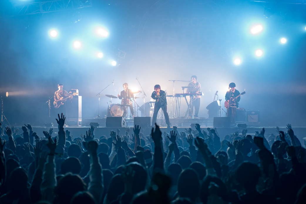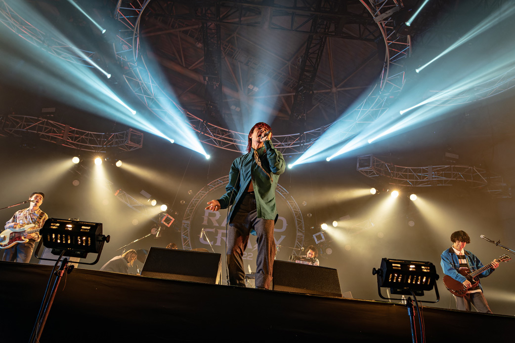 L-STAGEに登場したflumpoolは、初の『RADIO CRAZY』出演。山村隆太(Vo.Gt)はFM802『ROCK KIDS 802 FRIDAY』番組内「松原市 Radio Fields(金曜23:00〜23:20)」を担当しており、本来2020年に出演予定だったがコロナで延期になっていた。「Happy Xmas (War Is Over)」をSEにメンバーがステージに現れると、山村は「ハッピーメリークリスマス! お互い素敵なクリスマスにしましょう!」と笑顔。磯貝サイモン(Gt.Key)をサポートに迎え、「花になれ」から良質なサウンドを響かせる。フェスへの出演経験が少なく、フェス慣れしてないため「フェスコワイ」というグッズを販売するほど怯えて(?)いた彼らだが、ぎゅうぎゅうになったフロアを見て山村は「うわっ、嬉しー!」と、心底嬉しそうな笑顔で歓迎する。