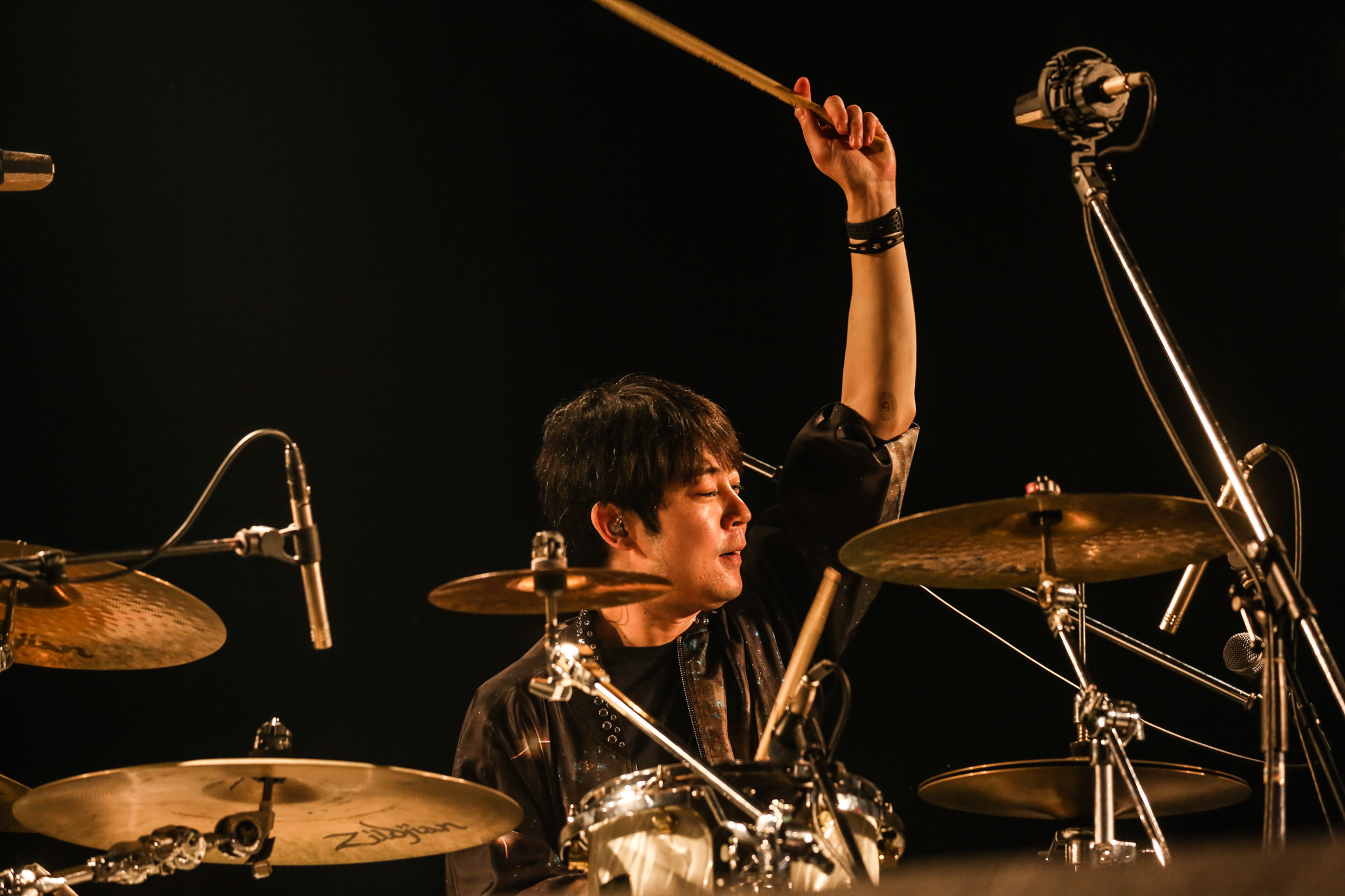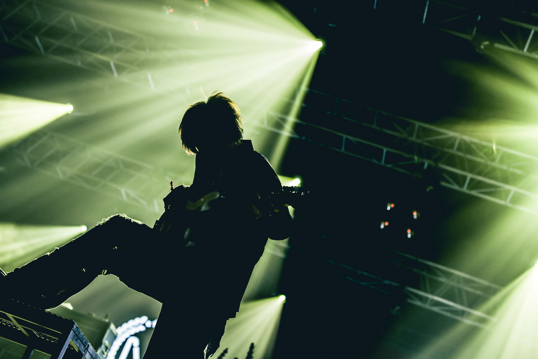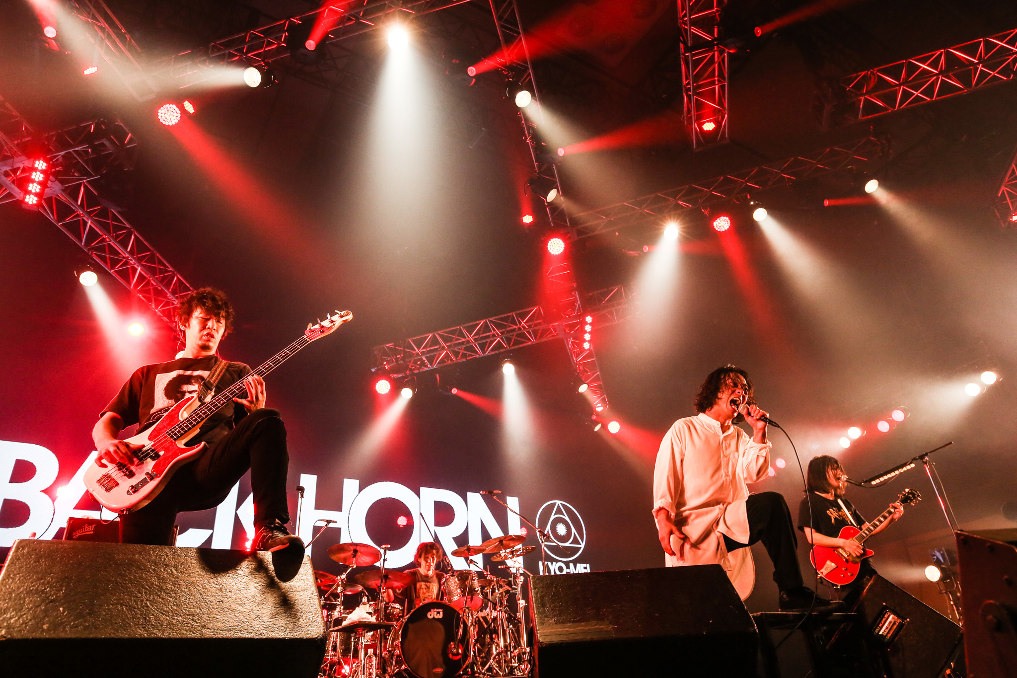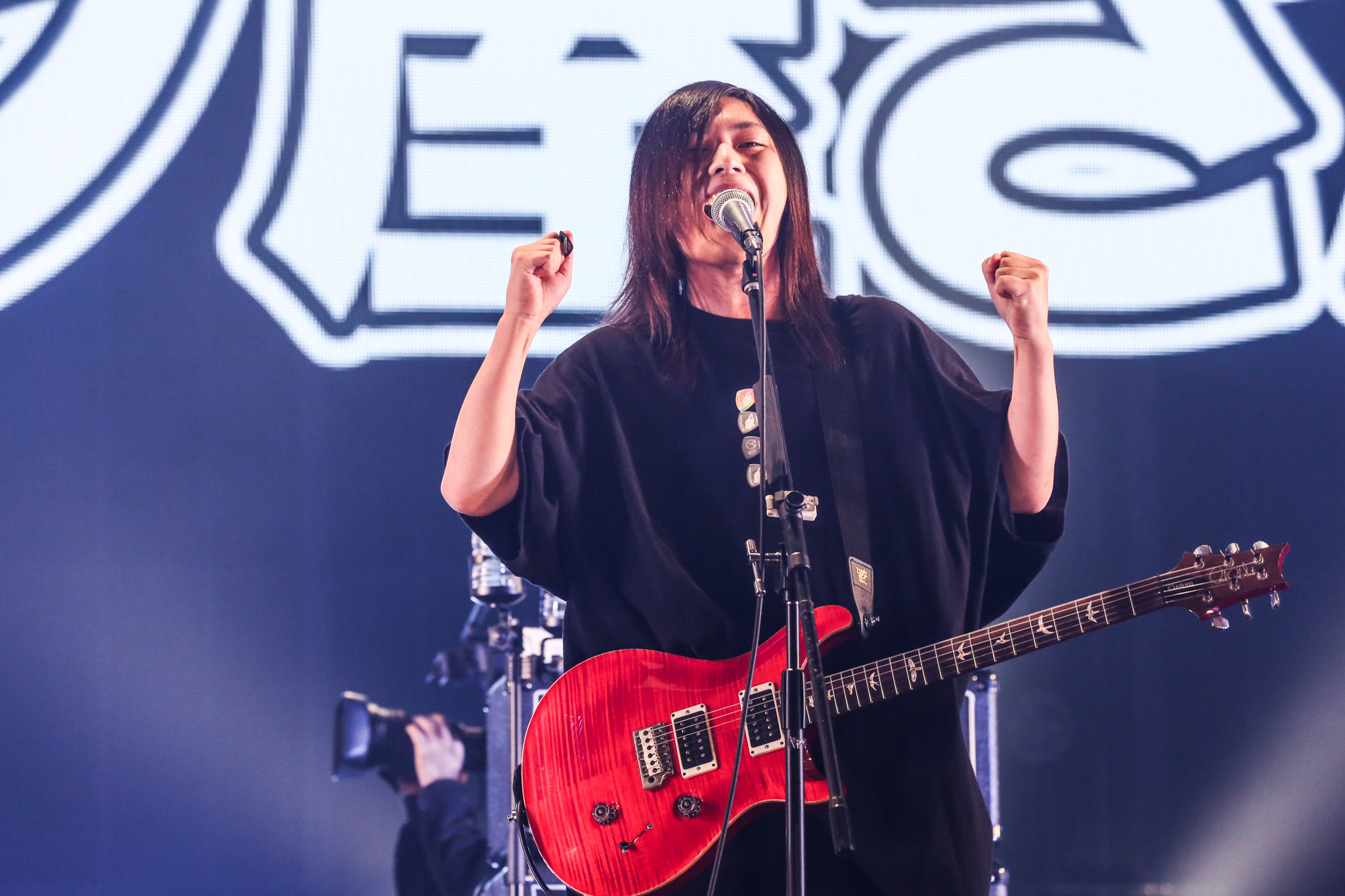 「来年、僕たちは結成25周年を迎えます。まだまだ変わらずやっていくのでよろしく。最高の夜にしましょう!」(山田)と再び轟音を背に、「ヒガンバナ」へ! 岡峰光舟(Ba)の超絶的なベース・プレイに聴きほれながら、今新たに示すTHE BACK HORNの王道に拳を強く握らずにはいられない。そのまま「コバルトブルー」、「刃」と、特大キラーチューンで畳み掛ける彼ら。広大な会場を飲み込みながら眼前でプレイするような鬼気迫るパフォーマンスに、ライブ巧者・THE BACK HORNの勇姿を再確認する一幕となった。