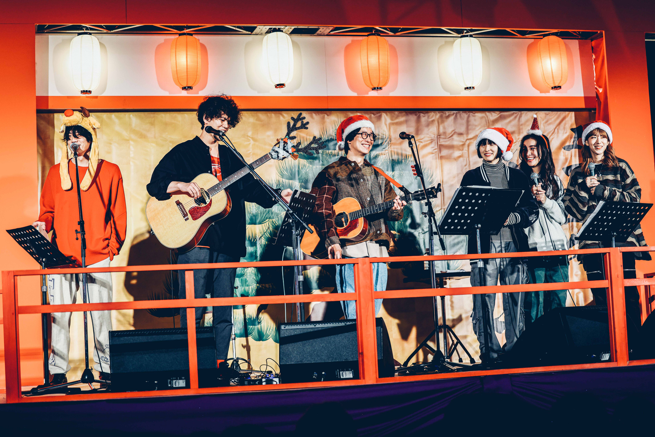 境内ステージでは、「FM802弾き語り部」のライブが。25日(日)は、部長の松本 大のほか菅原卓郎(9mm Parabellum Bullet)、ホリエアツシ(ストレイテナー)、Chilli Beans.が出演。それぞれ持ち曲やカバーを弾き語りで披露し、最後は「赤鼻のトナカイ」をセッションするなどほかでは観れない特別なコラボも。
