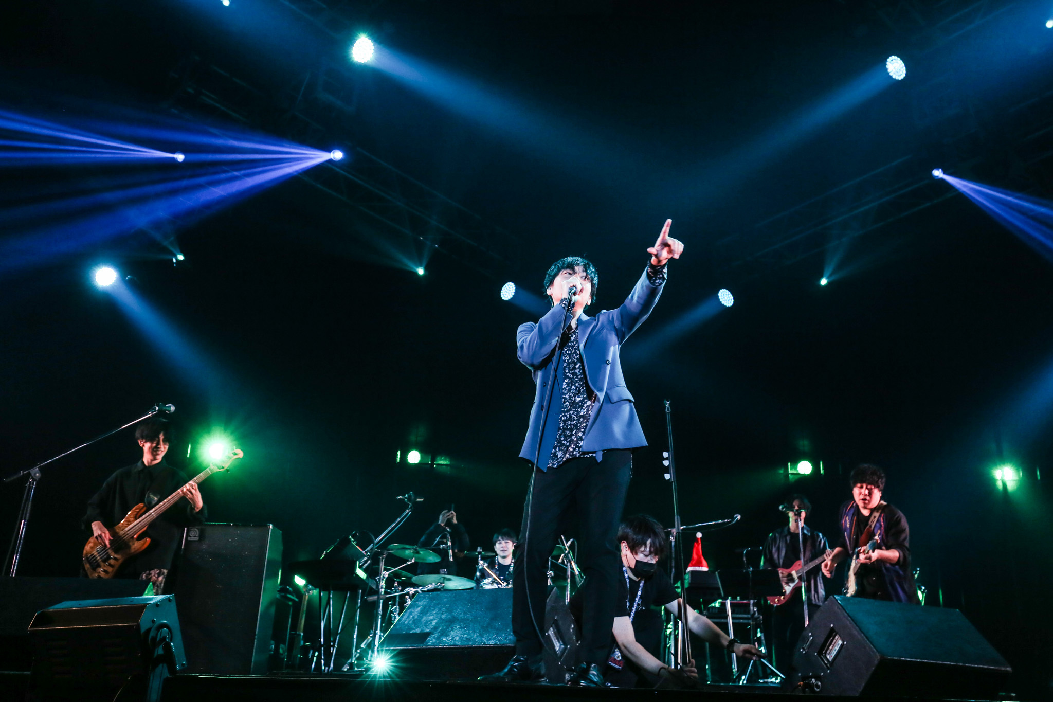 Twitterで「今までとは全く違うセットリストで最高なロックなライブをやる!」と宣言していた通り、後半は年明け1月1日(日)にリリースされるアルバム『2100年』からの楽曲を披露。「俺的にロックが一番、ガツンとエネルギーを自分の中から開花できるものだと最近本当に思ってるので、全力でロックやりたいなと思います」と話し、キレのある演奏でロックチューンを叩き込む。ギター3本を含む6人バンド編成ゆえにステージから放たれる迫力は凄まじく、自身も高まったように柵前に飛び降りてダッシュする場面も。「こんな熱いクリスマス初めてだ」と楽しそうに笑顔を見せた。ラストの「明日もこの世は回るから」までロックバイブスで駆け抜けた、2022年のライブ納めだった。