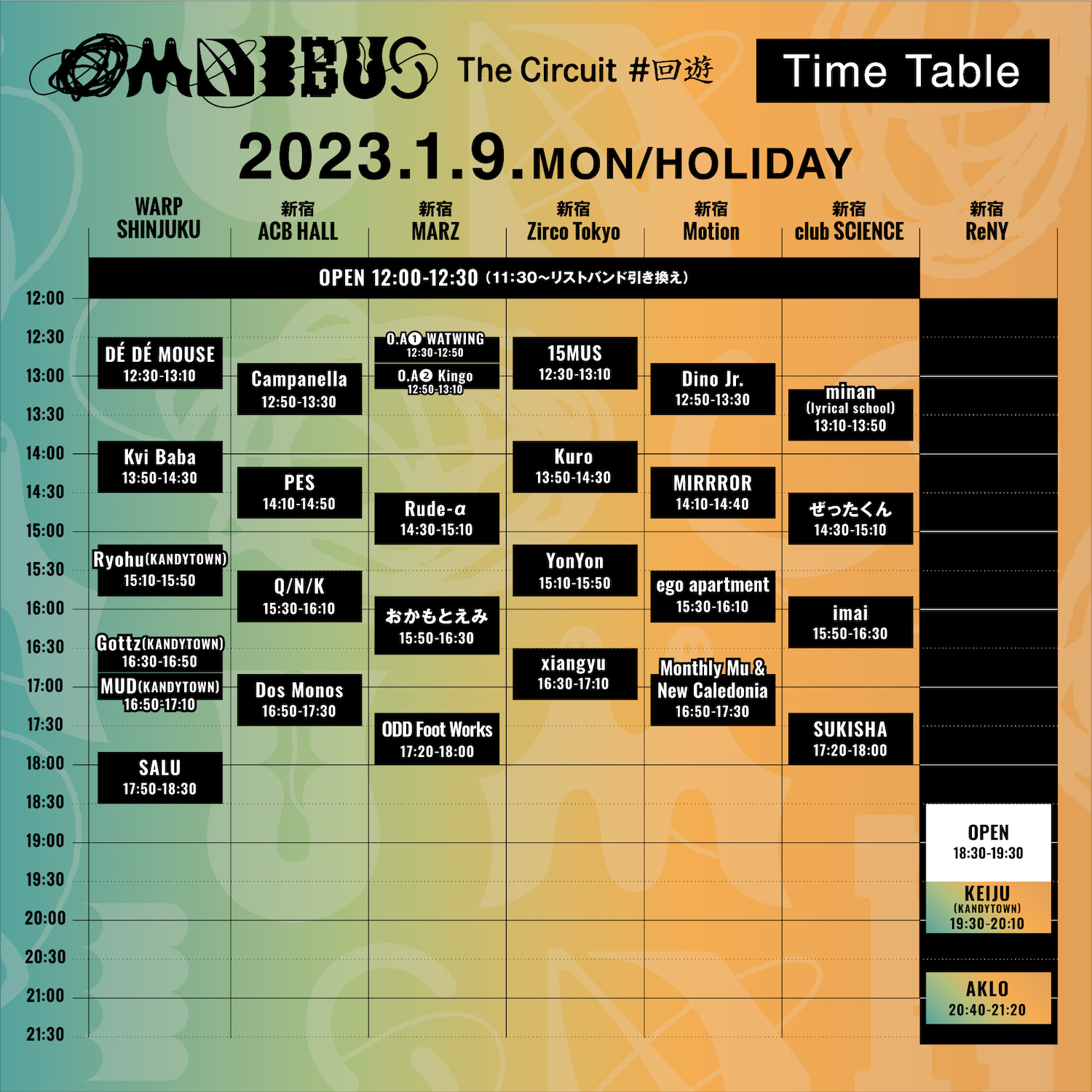 公益社団法人日本芸能実演家団体協議会(芸団協)が主催し、文化事業「JAPAN LIVE YELL project」の一環として、2023年1月9日(月祝)に行う音楽フェスティバル『OMNIBUS '23 The Circuit #回遊@JLYp Shinjuku』。全出演アーティストの発表に伴い、1DAY公演、アップグレード公演のタイムテーブルを公開した。