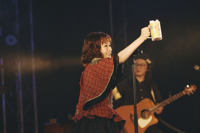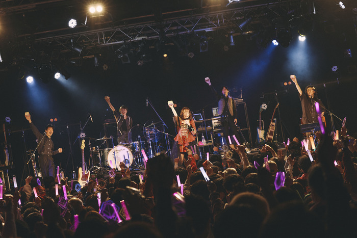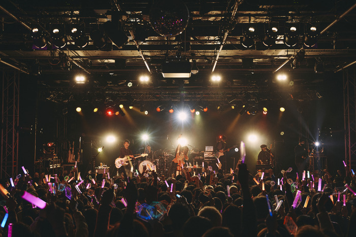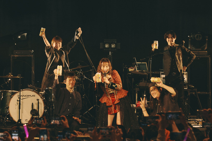 9曲目は「ふわふわ」。「サビの部分で振付を作ったので一緒に踊ってみてください」との掛け声で、可愛らしいパフォーマンスと、途中バンドメンバーがドリンク一気飲みや年越しそばを食べるなどの楽しい演出もあり、キュートな雰囲気に包まれた会場となった。