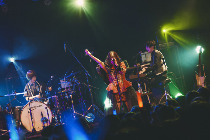「まだまだ行けますか!チェリーブロッサム!」の掛け声とともに始まった12曲目は1stアルバムに収録の「Happy Days」。初期のライブの盛り上げナンバーで、こちらも久々の披露でファンも一緒に手を振りハッピーな会場が作り上げられていった。