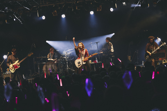 2曲目は「My Way」。パワー溢れるナンバーでガラッと会場の空気が変わり、観客も手を振り大きく盛り上がる。久々のバンドスタイルでの披露でファンも喜んだのではないだろうか。更に3曲目「透ケルトン」に突入し更にアッパーなナンバーに益々会場は手を振り盛り上がる。エレキギターを弾く激しいアクションで更に更に盛り上がって行く。