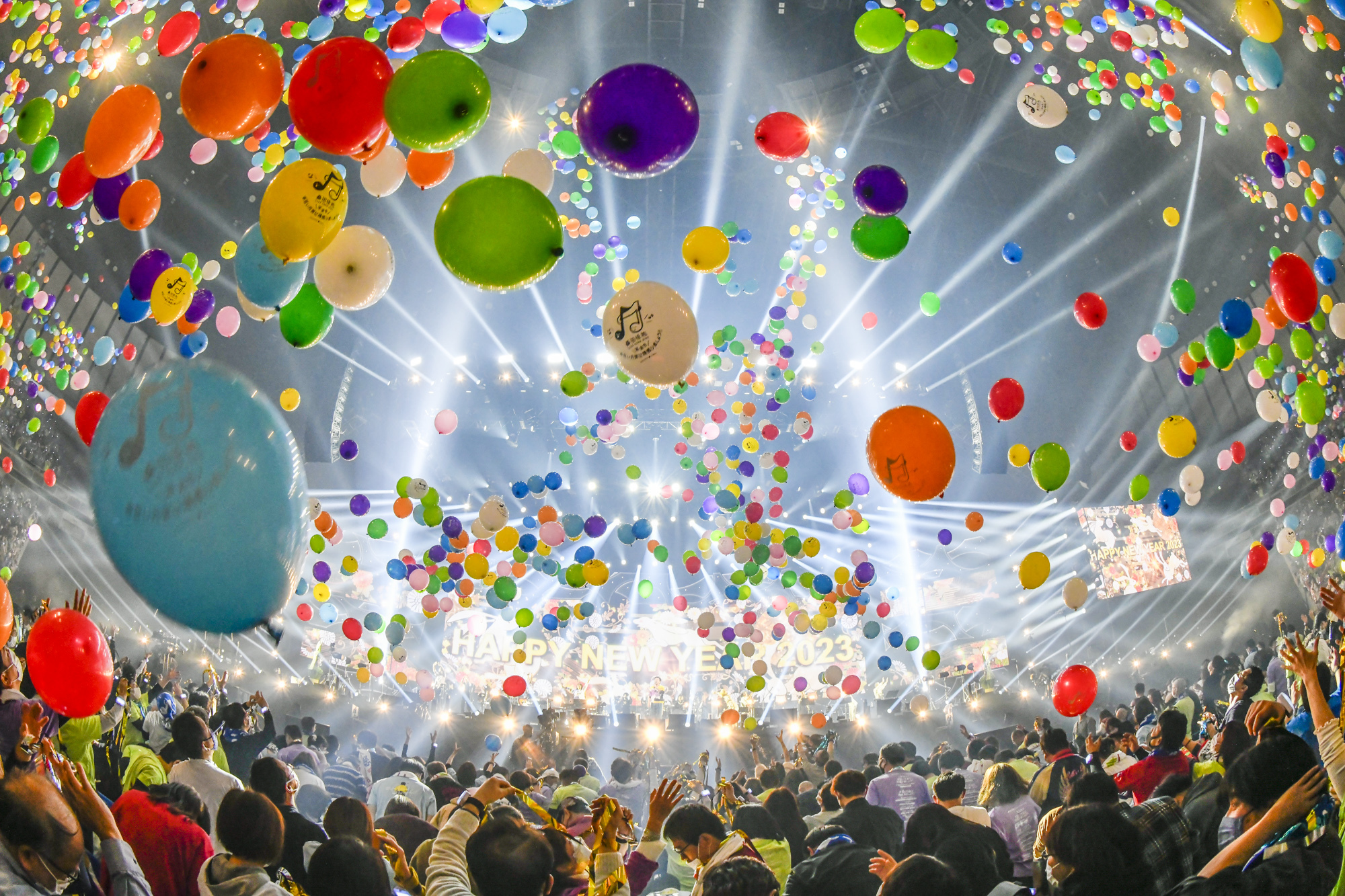 本編も終盤に差し掛かると、故・アントニオ猪木さんへの哀悼とリスペクトを込めて首に赤いタオルを巻き「Soulコブラツイスト〜魂の悶絶」を披露。畳み掛けるように場全体に大きな盛り上がりを生み出すライブナンバー「悲しい気持ち (JUST A MAN IN LOVE)」を演奏し終えると、時は年明けまであとわずか。2023年の幕開けへのカウントダウンが始まり、30秒後についに新年を迎える祝砲が鳴り響く。客席にはきらびやかな金テープが舞い、色とりどりの無数の風船が天井から降り注ぐと、会場は新しい年を迎える歓喜に包まれたのだった。間髪入れずに「ヨシ子さん」が始まると、会場は再びライブの熱狂に引き戻される。続いて、美空ひばりの60年代の大ヒット曲「真っ赤な太陽」を披露し、あたかも本編が終了するかの如くステージを去ろうとした瞬間に「波乗りジョニー」のイントロが鳴り響くと、観客のボルテージはマックスに。会場は大興奮と笑顔に満ちたまま本編の幕は下ろした。