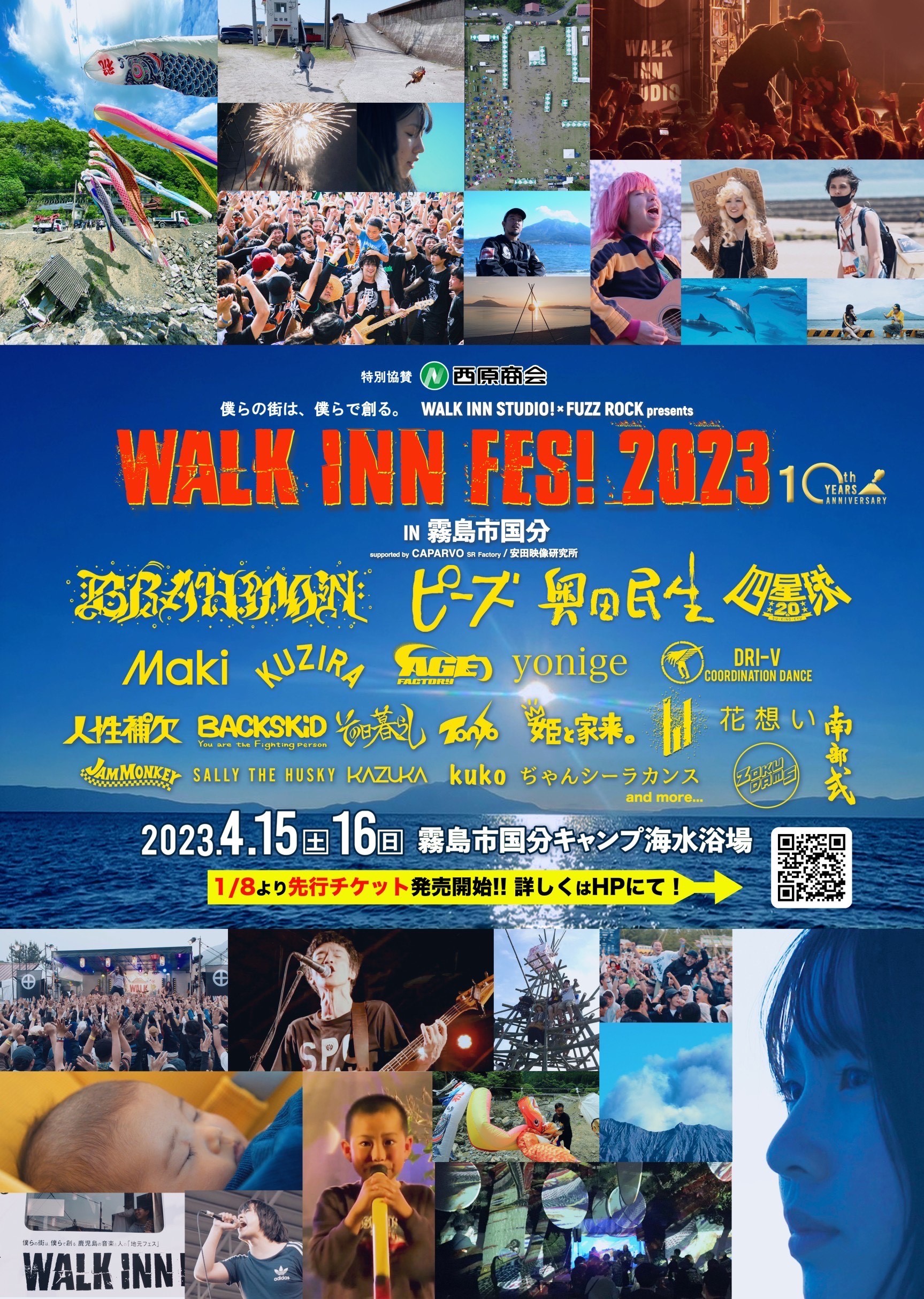 『WALK INN FES! 2023』は、2014年に桜島のふもとでスタートした野外音楽フェスで、今年で10周年を迎える。「僕らの街は、僕らで創る。」をテーマに掲げ、名だたるバンドやアーティストと地元のミュージシャンが出演。バンドマン自らステージを設営し、運営も手伝うDIY精神に満ちたフェスとして知られる。またライブだけでなく音楽、ダンス、食、アート、アパレルから子供たちの経営するお店まで様々なジャンルが一堂に会するのも特徴のひとつで、規則や禁止行為を極力設定することなく参加者が自ら考え場を創っていく、まさに小さな「街」のようなフェスとして規模を拡大してきた。