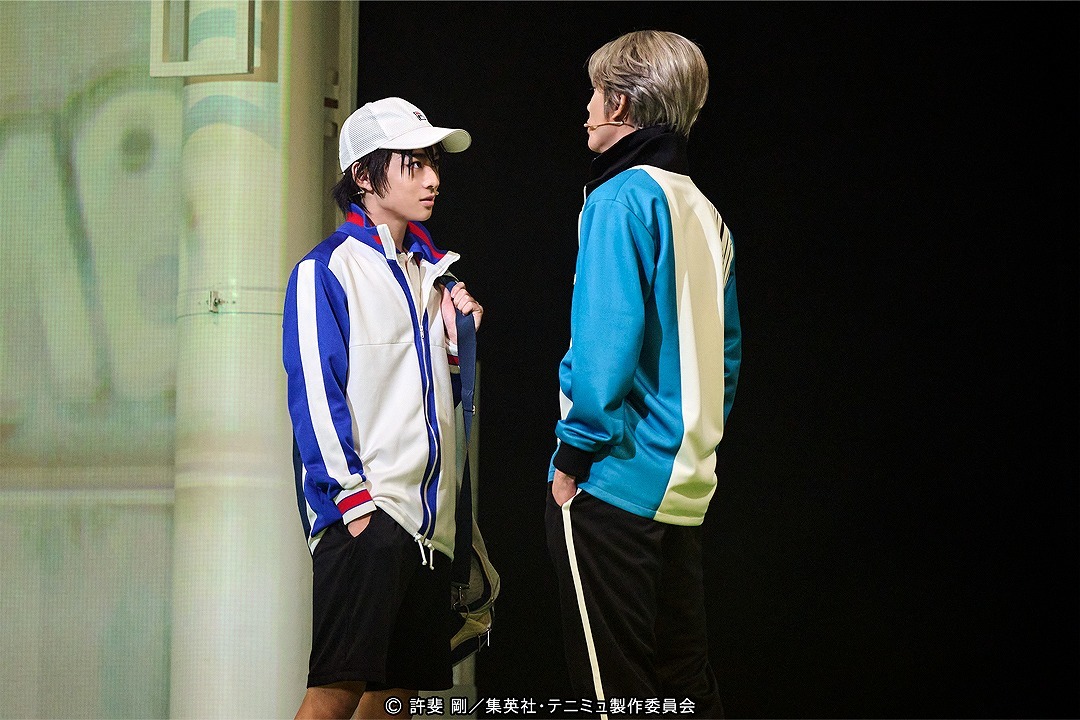 ボールが弾む音とシューズが軋む音が響く。そこへ重なっていく拍手、歓声、そして暗転からの一瞬の静寂——と、次の瞬間目の前に現れたのは、威風堂々と響き渡る氷帝学園テニス部部長・跡部景吾の歌声と浮かび上がる氷帝メンバーのシルエット! 出し惜しみせずプロローグから氷帝全員を登場させるこの攻めの姿勢、繰り出される勝者のオーラを纏った力強い氷帝ナンバーが刻むリズムに客席の期待度はのっけから大いに煽られる。一方、ジリジリと相手を追い詰めていくような氷帝の“圧”と好対照に、瑞々しくもドラマティックなドライブ感あふれるナンバーで登場したのは我らが青春学園。この先に待つ戦いに備え、自らの手で勝利を掴もうという希望に満ちた思いを謳う。まずはそれぞれのスクールカラーを対比させ、ここから始まる試合へと観るものの心をいざなっていく。