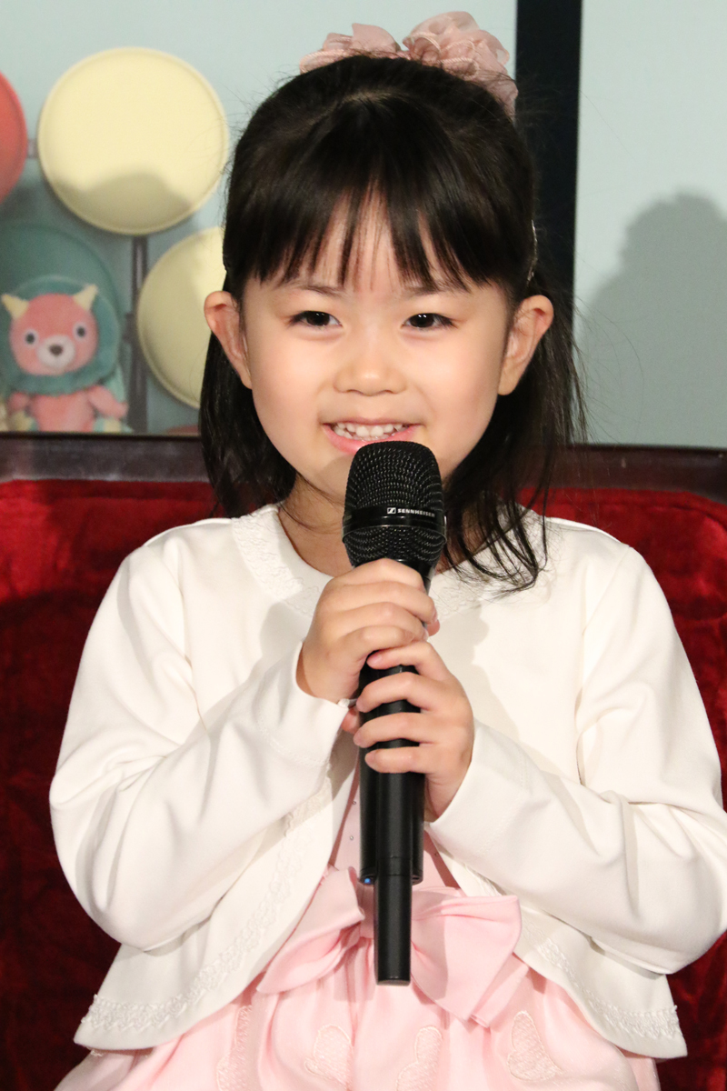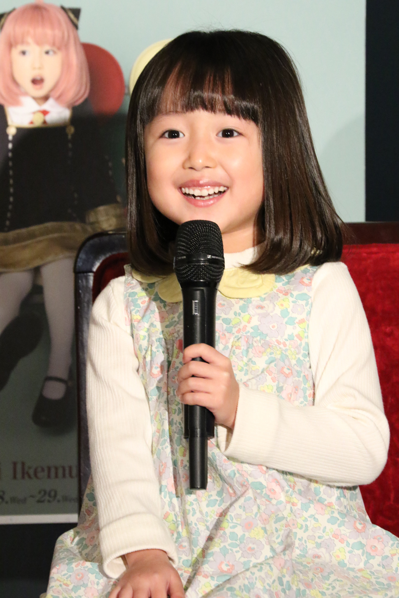 「アーニャ役の池村碧彩(いけむら あおい)です。6歳です。大好きなアーニャになれて、とっても嬉しいです。観に来てくれる、たっくさんのお客さんが、“わぁ、アーニャだ!”って思ってもらえるように頑張ります。(アニメのアーニャのモノマネで)よろろすお願いするます(場内笑)。よろしくお願いします」