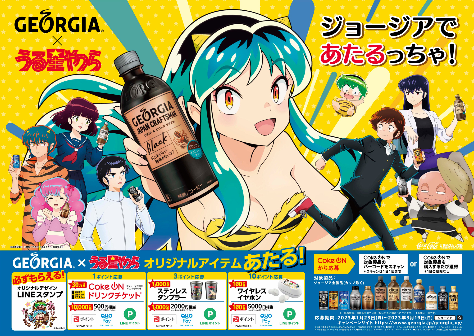 「ジョージア」とのコラボキャンペーンでは、コカ・コーラ公式アプリ「Coke ON」内の特設ページにてプレゼントキャンペーンを実施。「ジョージア」製品を購入し、ポイントを集めて「ジョージア オリジナルデザイン うる星やつらCoke ONドリンクチケット」や「選べるデジタルポイント」、さらにここでしか手に入らない「ジョージア」と『うる星やつら』のオリジナルアイテムなどが当たる抽選に応募することができる。