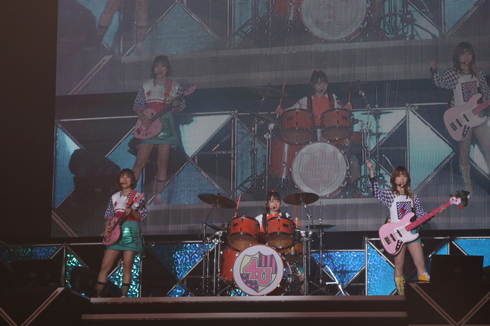 「待たせたわね幕張!ここからは私たち4Uのステージよー!」「燃え尽きる覚悟は良いですか?」と4Uの3人が満を持して登場すると、まずは挨拶がわりの「メロディーフラッグ」を披露。約半年前までツアーを回っていただけに、MCの調子もバツグンで「単独来なかった人~?」「あれれ~?でも、円盤買ってくれるんだよね?」と4Uの自由さには笑わされる。でも何より、彼女たち3人が本当に楽しそうに演奏しているのが、4Uの最大の魅力だ。4人目のメンバーに捧げる「プレゼント・フォー・ユー」や「テンション上げてけ~!」とサングラスを装着し、披露した「Crazy Girl's Beat」ではギターソロ、ベースソロで魅せる。「Lucky☆Lucky」では会場全体を使って「ウェーブ作るよ!」と大きな人の波が幕張メッセを飲み込む。「これで終わりだと思った?最後はみんなの所へ行くよ!」と、トロッコに飛び乗り「Daze forU!!」を披露し、そのままトロッコごと退場。嵐のように去っていったが、パワフルで底なしに明るくて、やはりライバルは彼女たちじゃないと務まらないなと思わせる何かがある。