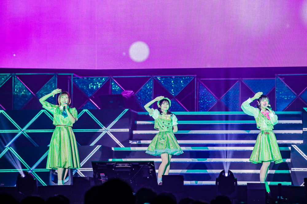 お揃いの緑の衣装でサンボンリボンの3人が登場し、「Clover×Clover」と「セカイのヒミツ」を披露。「昨日はよく眠れたよって人~?」「私、夜ふかしさんなので眠れないかもって桜お姉ちゃんに相談したら、よく眠れるジュースを教えてくれたので飲んだんですけど……目がらんらんらんってなっちゃって・・・・(笑)」「シィちゃんは寝れた?」「私はよく眠れたんですけど、さっき夢みたいな出来事があって……リハの時にサワラお姉ちゃんがマイクを上下逆に持ってました!」と、本当の三姉妹のように軽妙なトークで場を温めていく姿が非常に印象的だった。