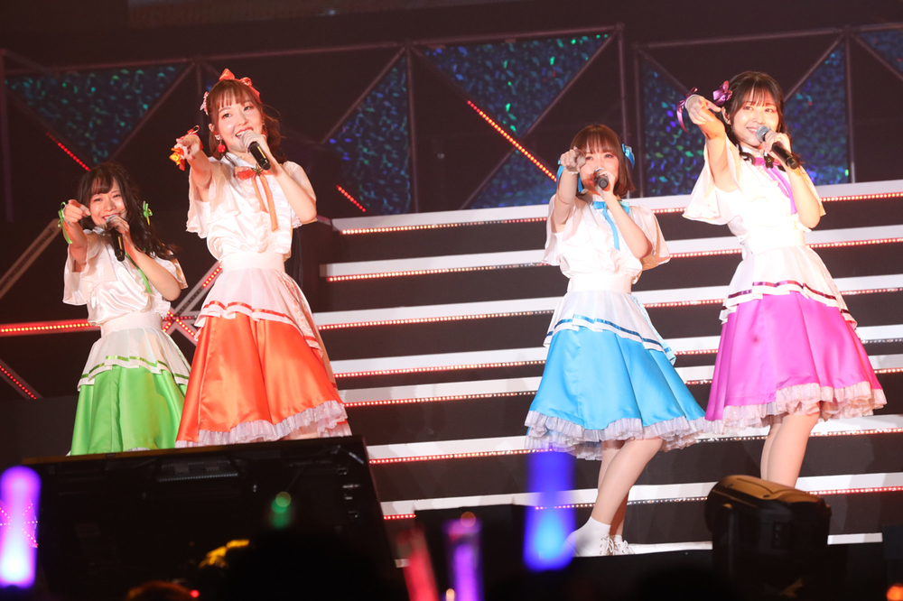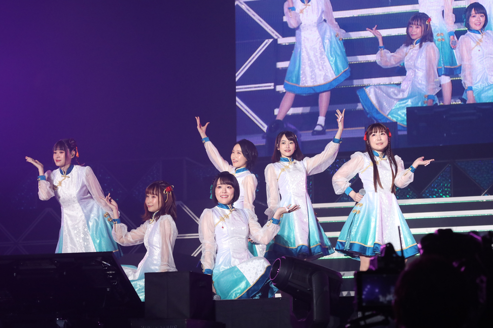 続いてもなんとも賑やかな七花少女の6人が登場。「スノードロップ」「花咲キオトメ」「秋の空とこころ コスモス」「マイ・グラデイション」の4曲を披露した。「花咲キオトメ」ではトロッコで会場を駆け巡り「花咲キオトメのサビの振り付けをみんなも結構やってくれてたよね!」「スゴかった!」「嬉しい~!」「今後もやってほしいので、みんなで一緒にやってみよう!」と振り付けのレクチャーも行った。6人もいると水分補給をするだけでもワチャワチャとしてしまい、終始かしましい感じだったのが、なんともらしくて微笑ましかった。