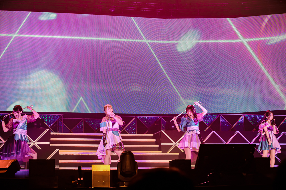最高のトップバッターの次はAsterlineによるステージを披露。立ち込める白煙の中から3つのシルエットが映し出されると、シアン・マゼンタ・イエローの原色バッキバキのレーザーが爆音の「Starlight☆Asterism!!!」と共に会場を包んだ。まだまだフレッシュな3人によるパフォーマンスはある意味、対比的でガラッとライブの雰囲気を変えてきたのが印象的だった。ドロップがFuture Bassすぎて気持ちいい「Reach for the Meteor」の2曲を終え、MCパートに入ると「初めて、支配人さんたちの前でライブをやらせてもらう事になって、緊張もスゴかったけど、ステージ裏で背中を叩き合って、気合いを入れてきました!」と意気込んで舞台に臨んだ事を吐露した。