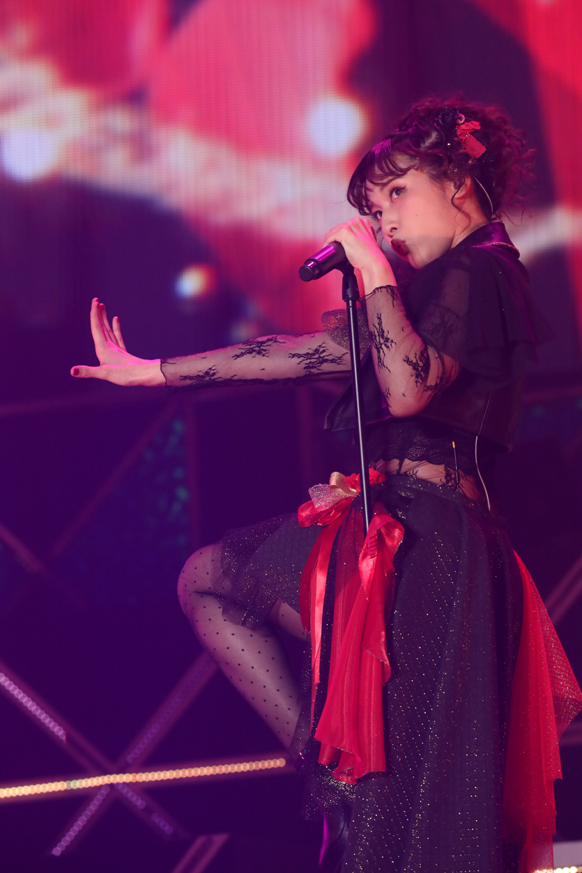 続いて登場したのは、対して妖艶な4人組のCASQUETTE'Sだ。2人ずつ、2台のトロッコで現れると、豪華絢爛な彼女たちらしく、余裕な表情でトロッコ上から会場に手を振り「HOLY QUEEN」を披露。「マスカレード・ナイト」ではステッキを振り回し、さながらブロードウェイのようなステージングを繰り広げる。MCでは「今回、キャスケット帽が無いんですよね!」と衣装に触れた事を皮切りに、徐々に会話の中で“大人な女子”感が無くなっていったのだが、思い出したように「あっ、あらあら~!そろそろ次の曲みたいよ~!」と舵を急速旋回させると、場内もおもわず笑いが出る。しかし「赤く染め上げて差し上げましょう」とスイッチを入れてしまえば、さすがのもので「SCARLET」では火柱まで噴き出し、情熱的で甘美に歌い上げる。