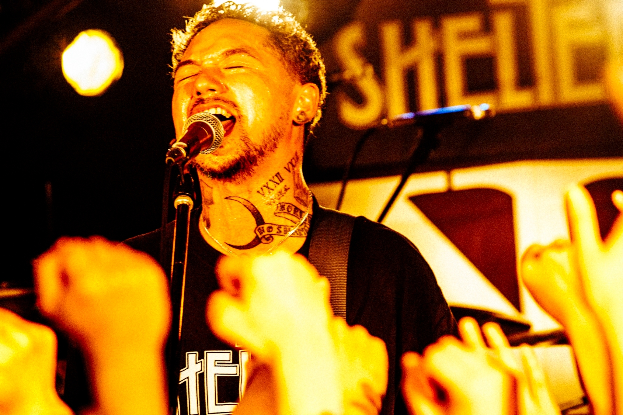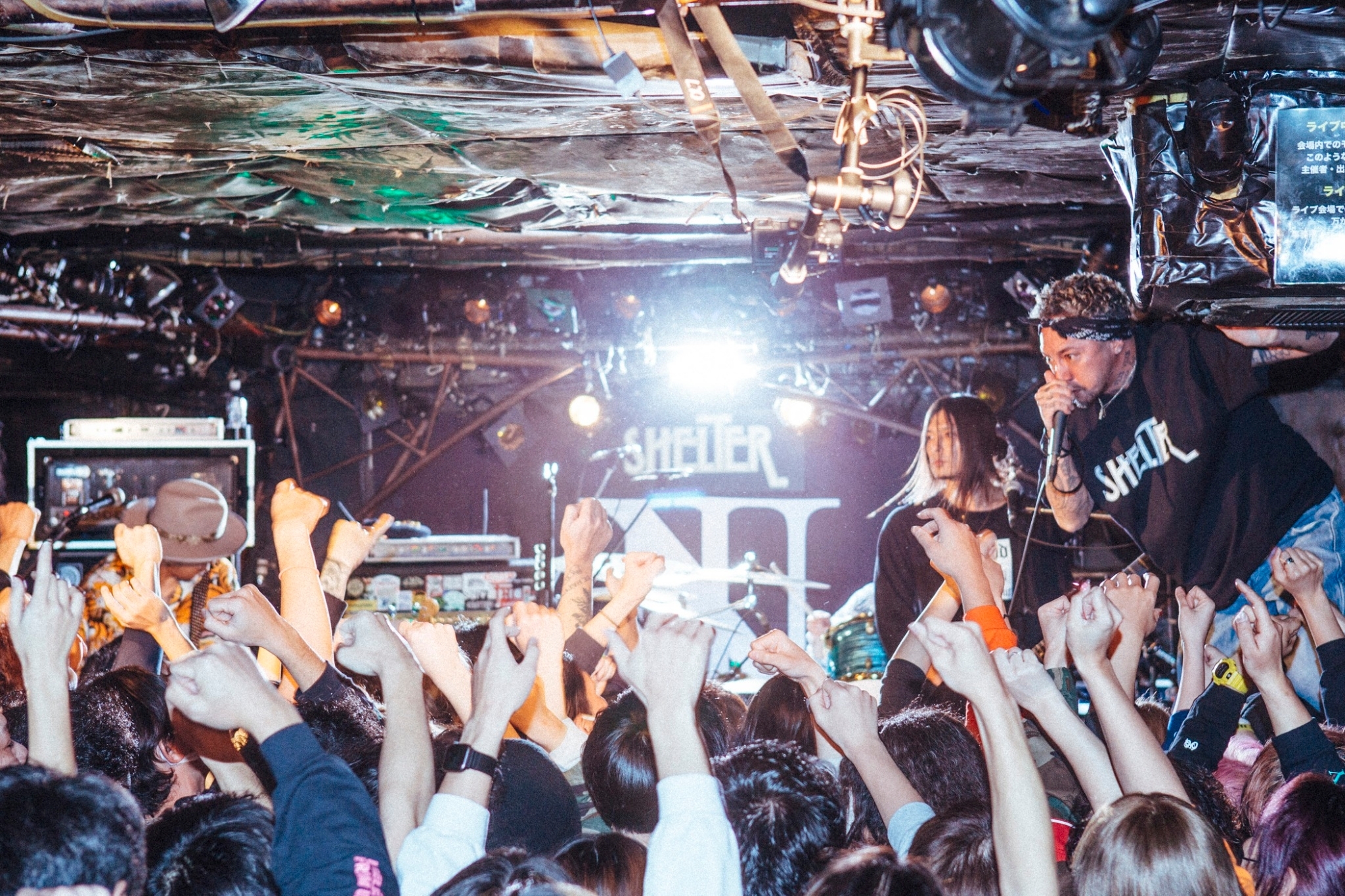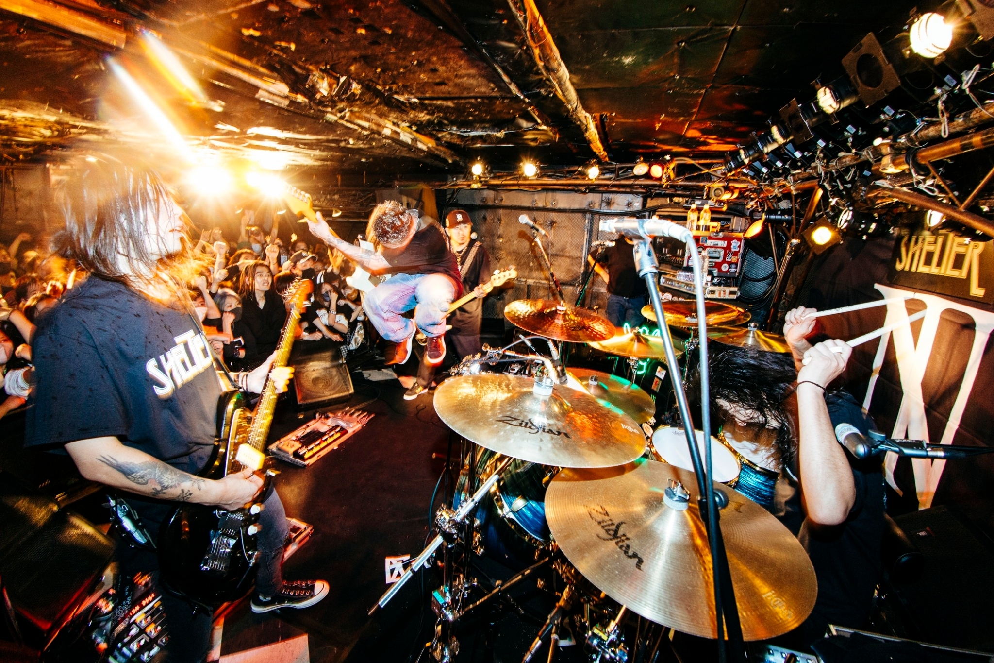 開演定刻の20時を5分ほど過ぎた頃、BGMの音量が大きくなり、場内は暗転。咆哮をあげるZAXを先頭に現れた4人を出迎えたのは、その収容人数に見合わないほどの音量の拍手だった。そしてステージ中央の配置に就いたJESSEが「行こうか、SHELTER。2023年、こんな感じでやって行こうか」と呼びかけると同時にフロアのあちこちから歓声があがり、新たな状況の始まりを象徴するに相応しい“Adam&Eve”が炸裂する。