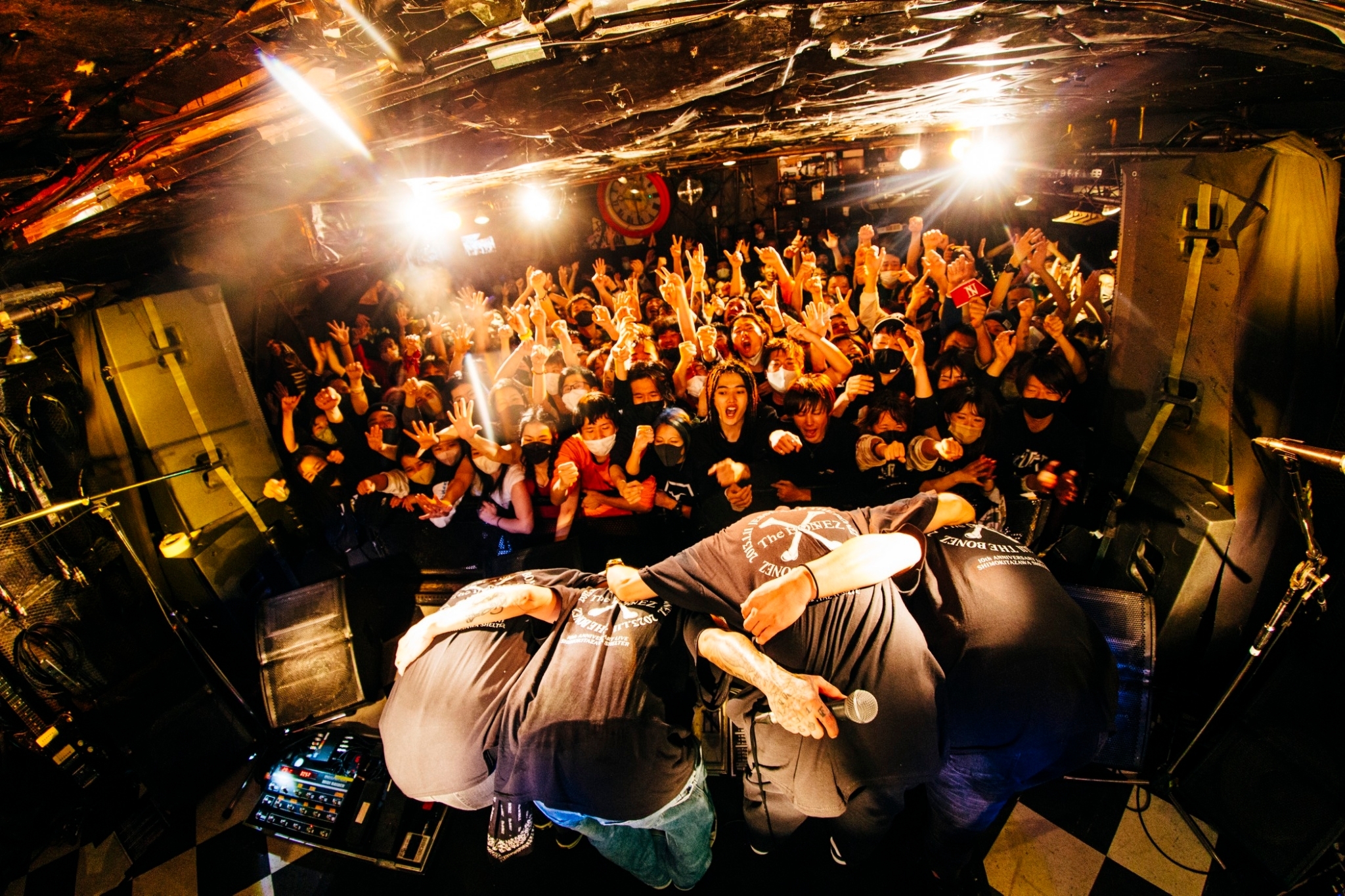 下北沢SHELTERというライヴハウスは、The BONEZの歴史を語るうえで欠かすことのできない聖地のひとつではあるが、現在の彼らの身の丈を考えれば、幼少期の頃に履いていた靴のようなサイズ感の場所ともいえる。メンバー・チェンジをはじめとする紆余曲折を経ながらも、段階を踏まえながら自らにとっての“遊び場”を拡大させ続けてきた彼らであれば、10周年と新たな年の到来を祝う場はもっと大きな場であって然るべきだろう。ただ、このバンドにとっては今もライヴハウスがホームであり、それは経年後に卒業することを前提とするような場所ではない。コロナ禍において彼らがさまざまな制限と向き合いながら比較的大きなサイズの会場でライヴ活動を続けてきたのは、全国で彼らを待ち続けている共鳴者たちと各地のライヴハウスで再会するためでもあったし、彼らは常にそれを約束してきた。その最初の場所が下北沢SHELTERだった、ということなのである。