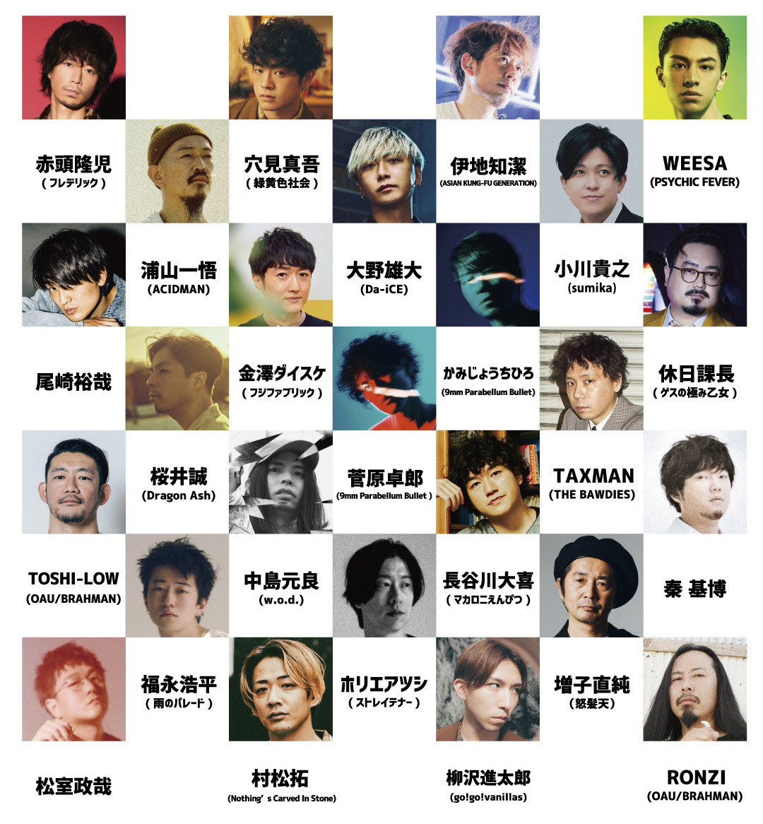 赤頭隆児(フレデリック)、穴見真吾 (緑黄色社会)、伊地知潔(ASIAN KUNG-FU GENERATION)、WEESA(PSYCHIC FEVER)、浦山一悟(ACIDMAN)、大野雄大(Da-iCE)、小川貴之(sumika)、尾崎裕哉、金澤ダイスケ(フジファブリック)、かみじょうちひろ(9㎜ Parabellum Bullet)、休日課長(ゲスの極み乙女)、桜井誠 (Dragon Ash)、菅原卓郎(9㎜ Parabellum Bullet)、TAXMAN(THE BAWDIES)、TOSHI LOW(OAU/BRAHMAN)、中島元良(w.o.d.)、長谷川大喜(マカロニえんぴつ)、秦 基博、福永浩平(雨のパレード)、ホリエアツシ(ストレイテナー)、増子直純(怒髪天)、松室政哉、村松拓(Nothing’s Carved In Stone)、柳沢進太郎 (go!go!vanillas)、RONZI(OAU/BRAHMAN)