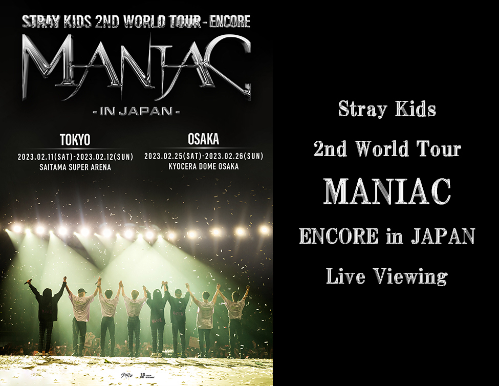 2023年2月25日(土)・26日(日)に京セラドーム大阪(大阪府)で開催される『Stray Kids 2nd World Tour "MANIAC" ENCORE in JAPAN』が、全国47都道府県の映画館にライブ・ビューイングされることが決定した。