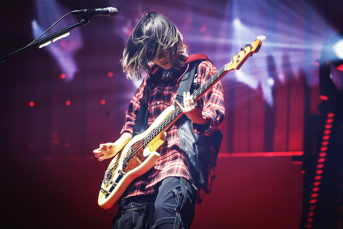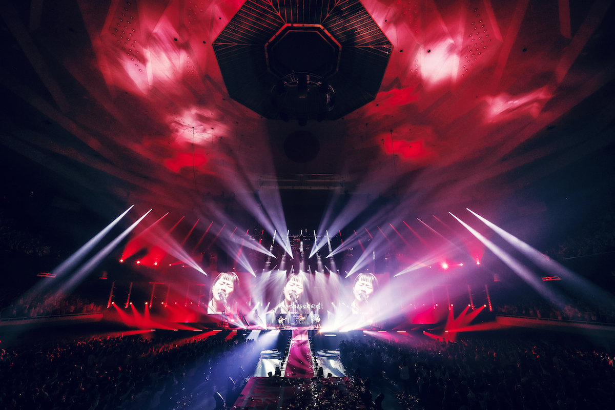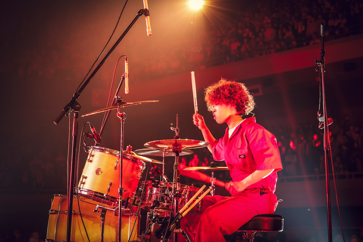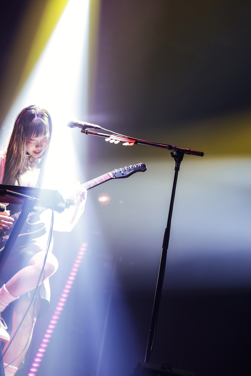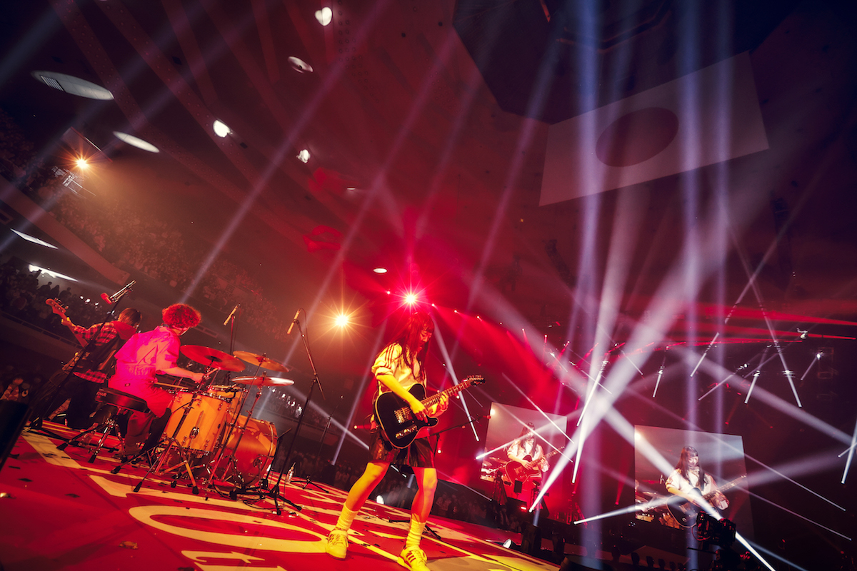 スケールの大きさと切れ味の良さを備えたバンドサウンドが気持ち良かったのは「中毒」だ。宮崎の歌声に松岡と吉川のコーラスが混じることで、独特な高揚感が漂っていた。MVにも登場する怪獣をモチーフにした映像と歌詞の映像が流れる中で演奏されたのは「君の目も鼻も口も顎も眉も寝ても覚めても超素敵!!!」。宮崎のキーボードの弾き語りで始まり、ベースとドラムが加わると、緩急自在のグルーヴに観客が揺れた。レーザービームが飛び交う中で演奏されたのは「きっとあの漫画のせい」。宮崎の奏でるグレッチの伸びやかな音色が印象的だ。宮崎、松岡、吉川が一丸となった演奏。観客のハンドクラップが加わって、会場も一丸。