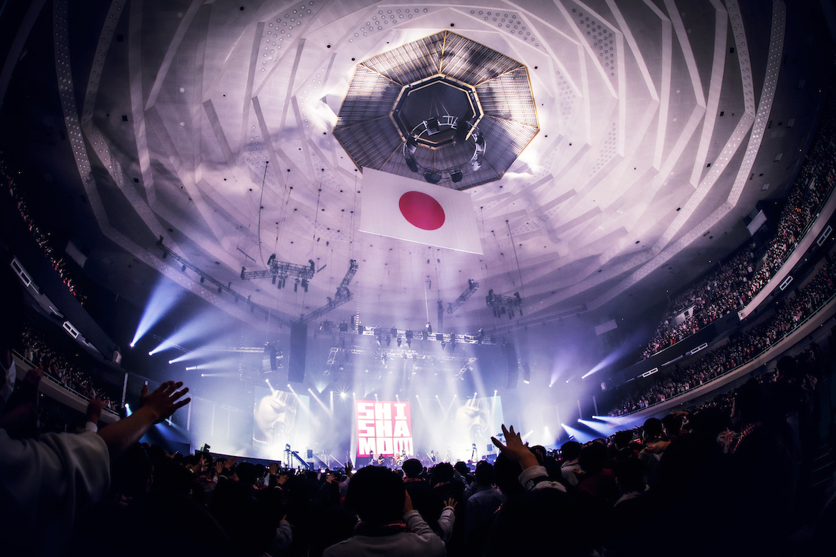 武道館に入ってまず目を引いたのは、“赤と白”の配色の鮮やかさだ。ステージの床は赤。ステージの中央からの花道も赤。花道の先のセンターステージには、おなじみのSHISHAMOの赤地に白のロゴがデザインされている。赤白なのは、それだけではない。客席を埋めつくしている観客が首に巻いている赤白タオルが目立っていた。天井からは赤白の日の丸の国旗。会場内には10周年を祝う、めでたい雰囲気が漂っていた。