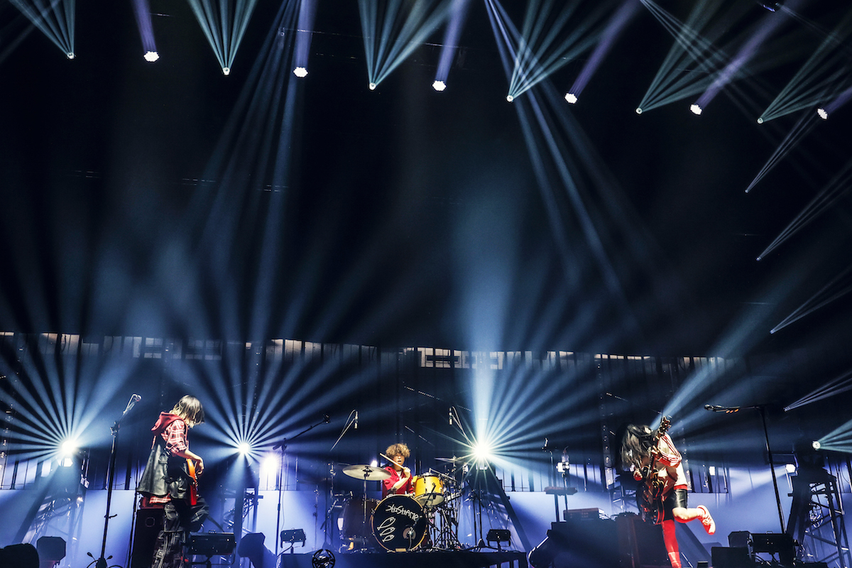 3人の挨拶に続いて、アンコールのラストは「またね」。思いの詰まった歌、ギター、ベース、ドラムが大きなうねりを生み出していく。失恋の曲だが、この日の<またね>というフレーズは、観客との再会の約束の言葉のようにも響いてきた。演奏が終わると、3人が花道を歩いて、センターステージで手をつないでお辞儀。客席から「大好き〜!」という声がかかった。「ありがとうございました」と3人が生声で挨拶。