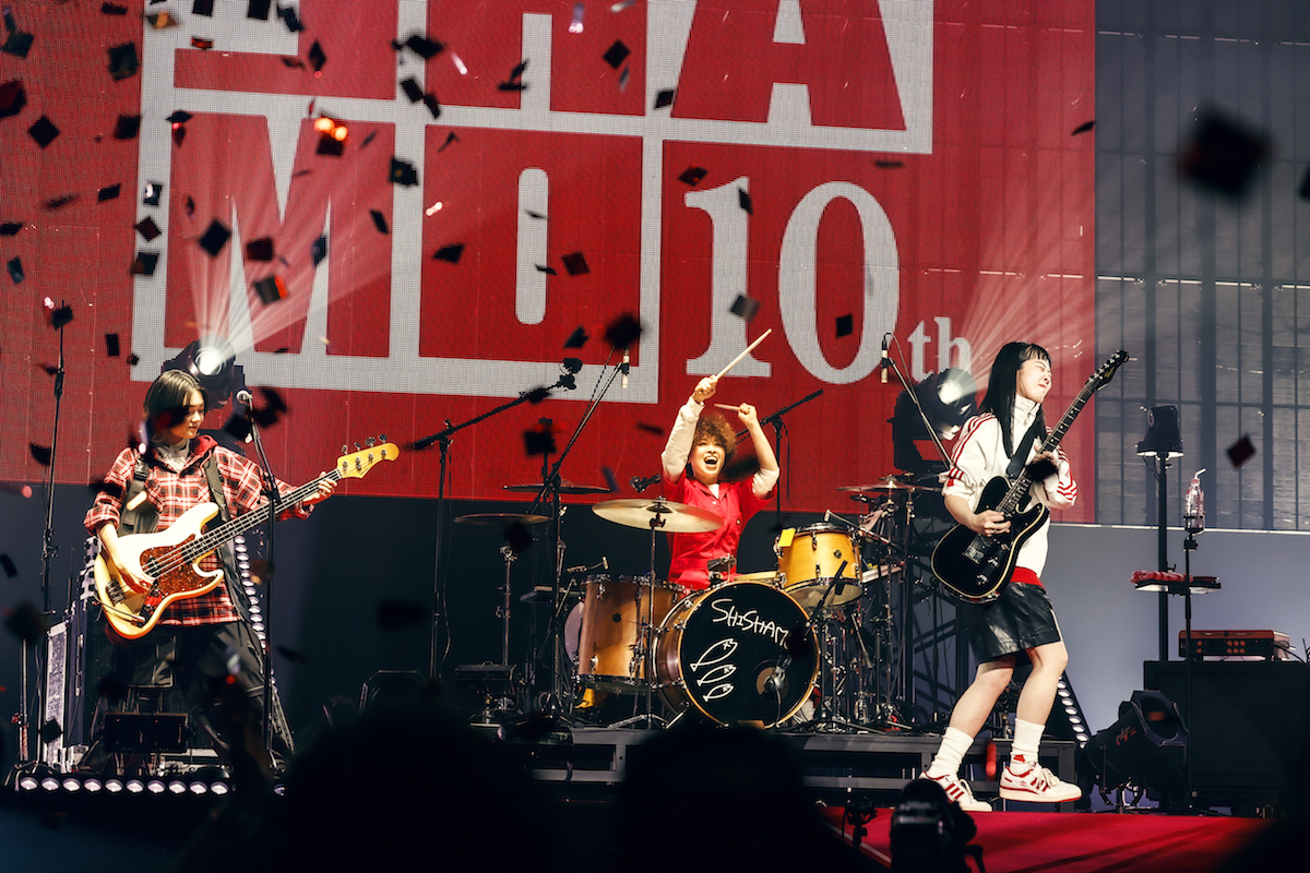 1曲目は「恋する」。デビューアルバム『SHISHAMO』収録曲であり、CDデビュー10周年コンセプトアルバム『恋を知っているすべてのあなたへ』にもリレコーディングした「恋する -10YEARS THANK YOU-」が収録されている、ライブの始まりにふさわしい曲だ。キャノン砲から紙吹雪が発射され、祝福ムードがさらに盛り上がっていく。同時に、緊張感を気迫へと変換していくような演奏に、こちらまで身が引き締まっていく。観客がハンドクラップで参加。「ねぇ、」での疾走感あふれる演奏に場内が気持ち良さそうに揺れていた。ステージの背後のLEDには「10YEARS THANK YOU」と書かれ、星のマークが10個輝いているSHISHAMOの10周年ロゴが映し出されている。満員の観客に、宮崎が挨拶。「仕事始めの日に来て下さってありがたいです。みんなは祝いに来てくれたんですよね」との言葉に会場内から大きな拍手が起こった。この日の模様は、U-NEXTでもライブ配信されている。会場内だけでなく、自宅でSHISHAMOの10周年を祝っている人たちがいるのだ。