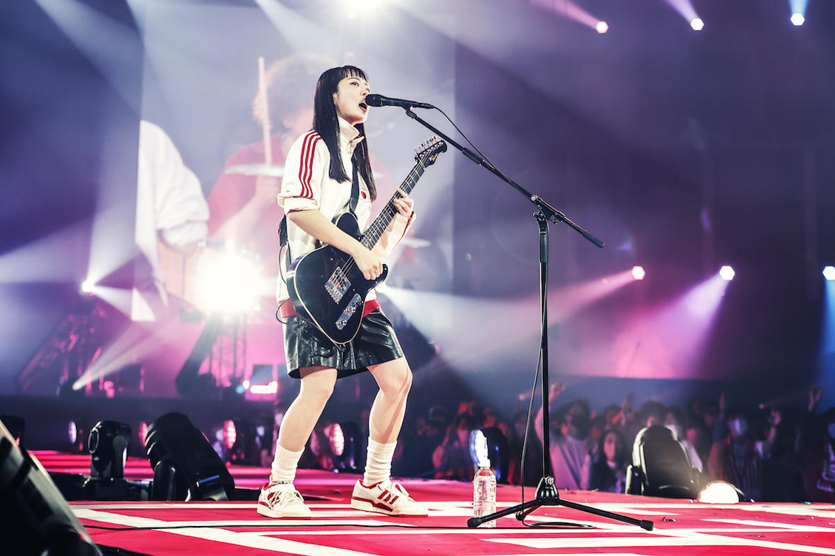 この10年の間で生まれた恋の歌がたくさん披露された。変幻自在のグルーヴで演奏されたのは「狙うは君のど真ん中」だ。恋心をファイティングスピリッツに昇華させていくような演奏がスリリングだ。歌、ギター、ベース、ドラムが一体となって観客のど真ん中を直撃。「量産型彼氏」では、男の子の健気な恋心をロックで表現。カラフルでポップなイラストを使った映像も楽しかった。ギターソロで宮崎が花道に出てくると、観客が大きく手を振る。せつなさと力強さとが共存する演奏が素晴らしかったのは「メトロ」。失恋から立ち直ろうとする女の子の気持ちに寄り添うような凜とした演奏だ。