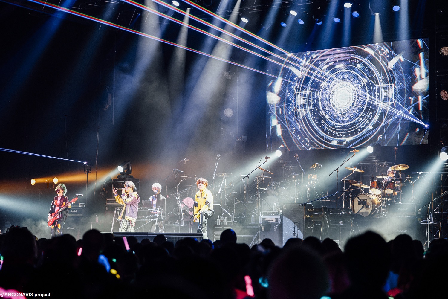 5曲目に披露した「心を歌いたい」の落ちサビでは、星空のような光の粒がステージを包む。3バンドだと早いもので、もうArgonavis最後の曲がやってくる。「年初めから皆さんにお会いすることが出来て、本当に嬉しいです!僕らはずっと夢見てます。アルゴナビスの音楽をたくさんの人に聞いてもらって、たくさんの人とライブをする。歩幅は小さくても、一歩ずつ着実に進んでいます。2023年は皆さんをきっと大きなステージへ連れて行きます。」そう誓って披露したのはアコースティックイントロverの「命のクリック」だ。