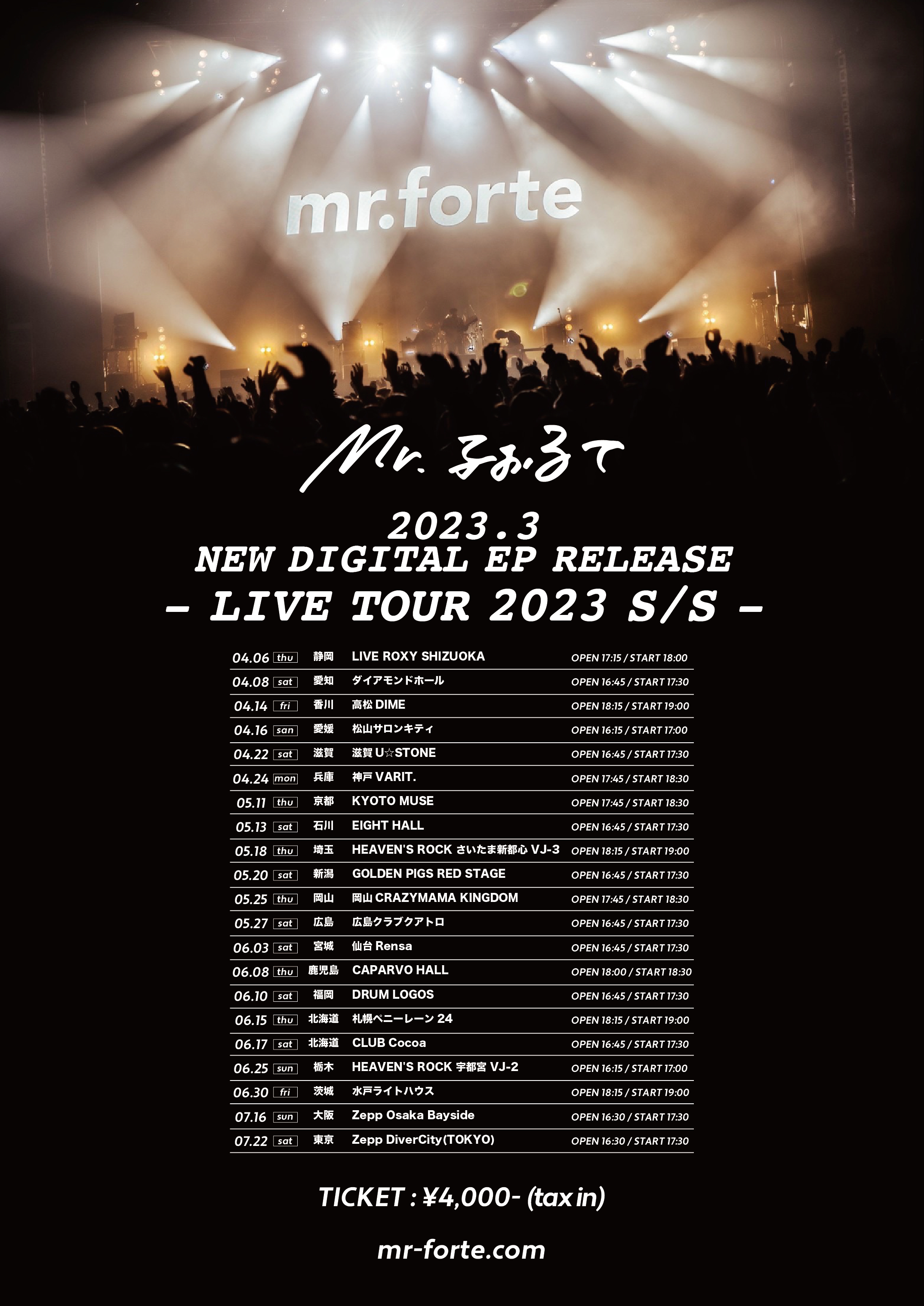 この全国ツアー『Mr.ふぉるて LIVE TOUR 2023 S/S』は、全21公演のツアーとなっており、ラストの2公演は共に初となる大阪・Zepp Osaka Bayside、東京・Zepp DiverCity(TOKYO)でのワンマン公演とのこと。チケットは本日・1月18日(水)18:00からオフィシャルファンクラブ『ふぉるてば』限定特別先行予約が開始となっている。このツアーの前、3月に配信EPをリリースする予定で、詳細は後報となっている。