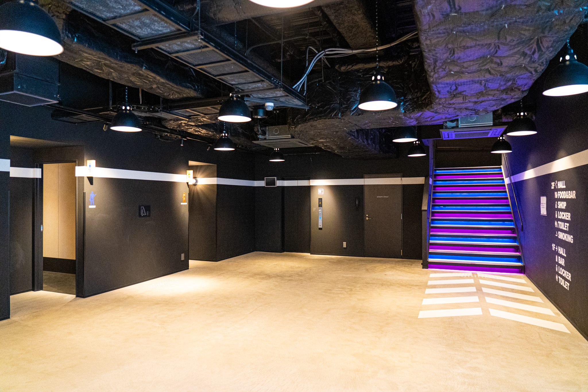 立派なロゴマーク(ゴリラがドラミングしている様子がモチーフになっている)があしらわれたスタイリッシュなエントランスを入ると、右手にはカラフルにライトアップされた階段が目に飛び込んでくる。左手には大きめのドリンクカウンターがあり、こちらでドリンクを交換する。
