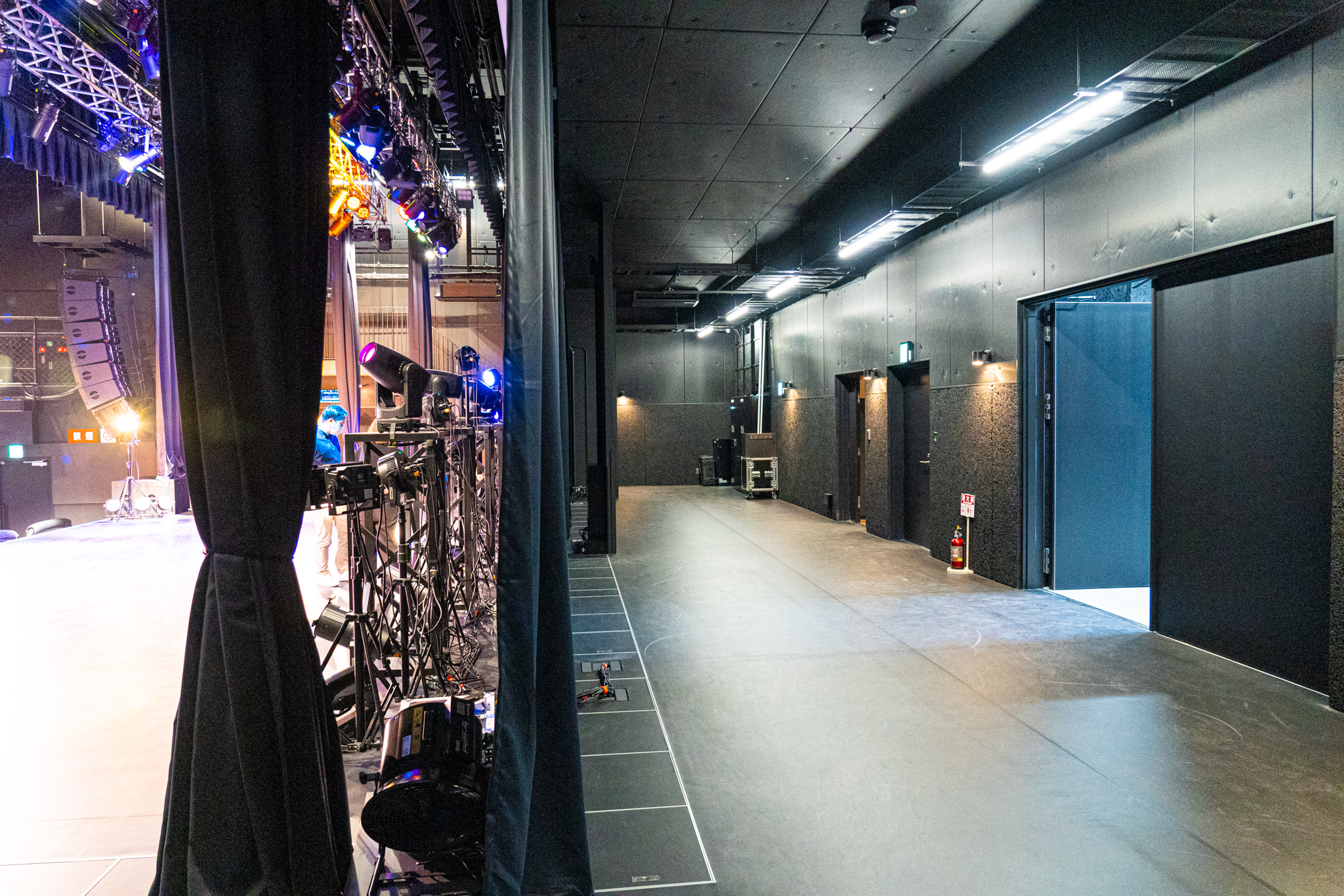 また、機材の転換が行いやすい広さの舞台袖スペース、ホテルの一室のような楽屋、洗濯機、シャワー室、トイレも完備で、出演者側にとっても利用しやすい仕様になっている。そしてこだわりのラウンジには厨房を用意。ホットミールをその場で作って提供できることから、ケータリング室としても利用できる。ビジョンや大型ソファ、テーブルなどの統一されたオシャレなインテリアも快適さを演出していた。