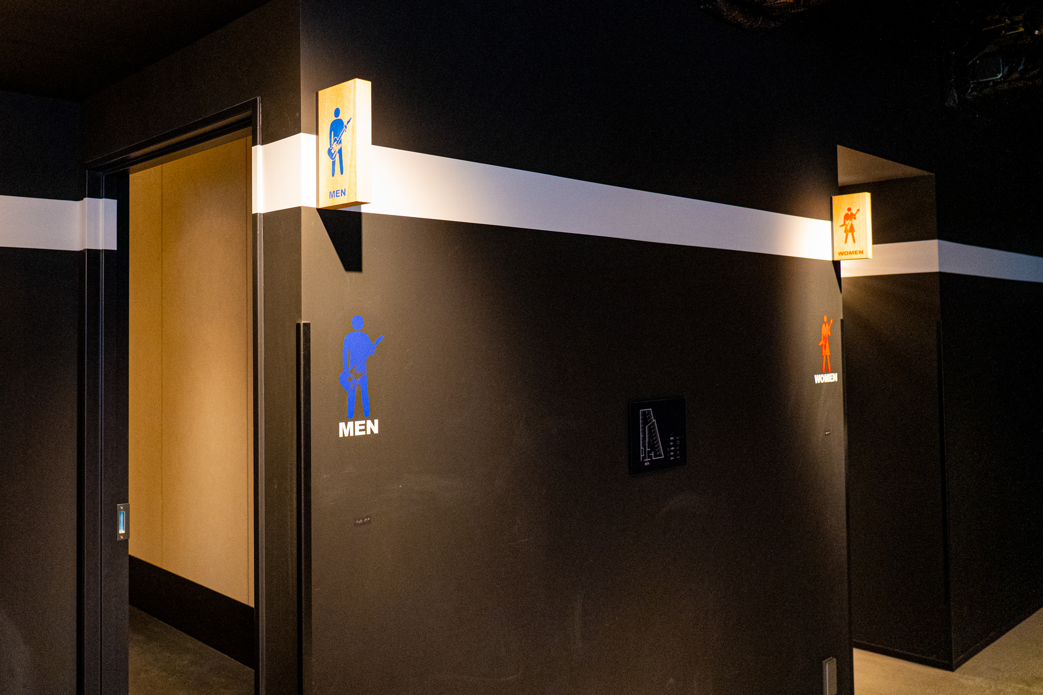 さらにギターを抱えたトイレのピクトサインも注目。トイレの入り口には点字サインがあり、1階と2階を繋ぐエレベーターも設置されている。2階には車椅子エリアや多機能トイレもあり、段差なしで出入り可能なバリアフリー設計となっている。