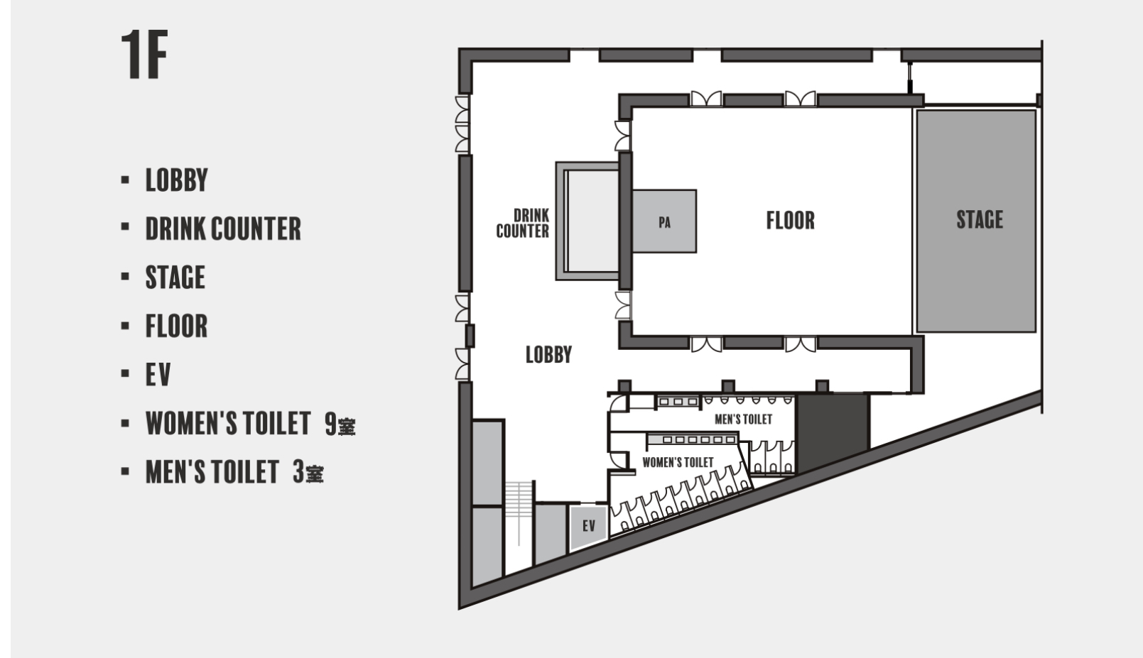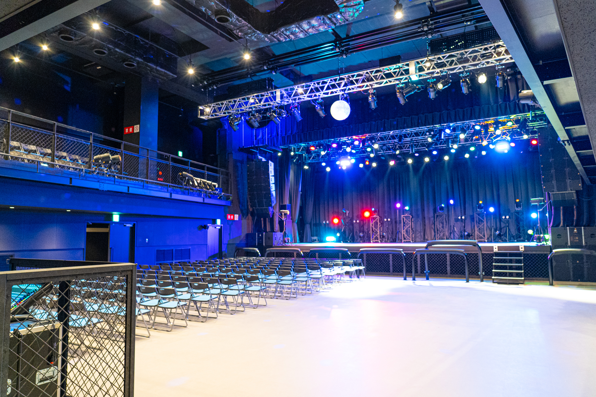 1階客席フロアの面積は255.36㎡。正方形よりも少し縦に長い形状で、かなりの広さがある。1階席のキャパはスタンディングで882人。心斎橋BIGCATとなんばHatchの間くらいの大きさと言えばイメージしやすいだろうか。ステージの高さが1m20cmあるため、床はフラットだが1階フロア後方からでも見えやすい造りになっている。