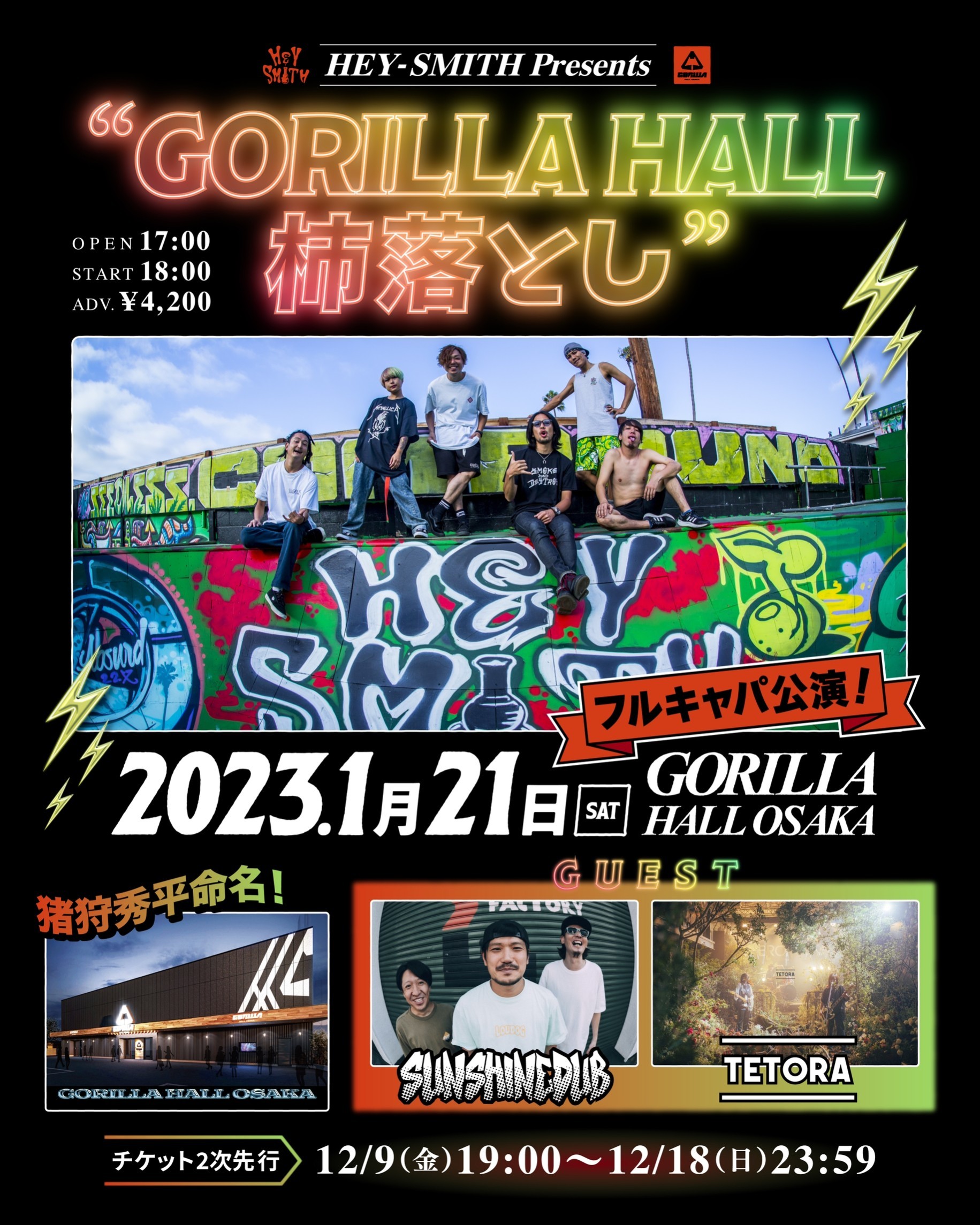 1月21日(土)に行われる記念すべき杮落とし公演は、『HEY-SMITH Presents “GORILLA HALL 柿落とし” HEY-SMITH × SUNSHINE DUB × TETORA』。「GORILLA HALL」の名付け親でもある猪狩氏のバンド・HEY-SMITHのほか、SUNSHINE DUBとTETORAが出演する。