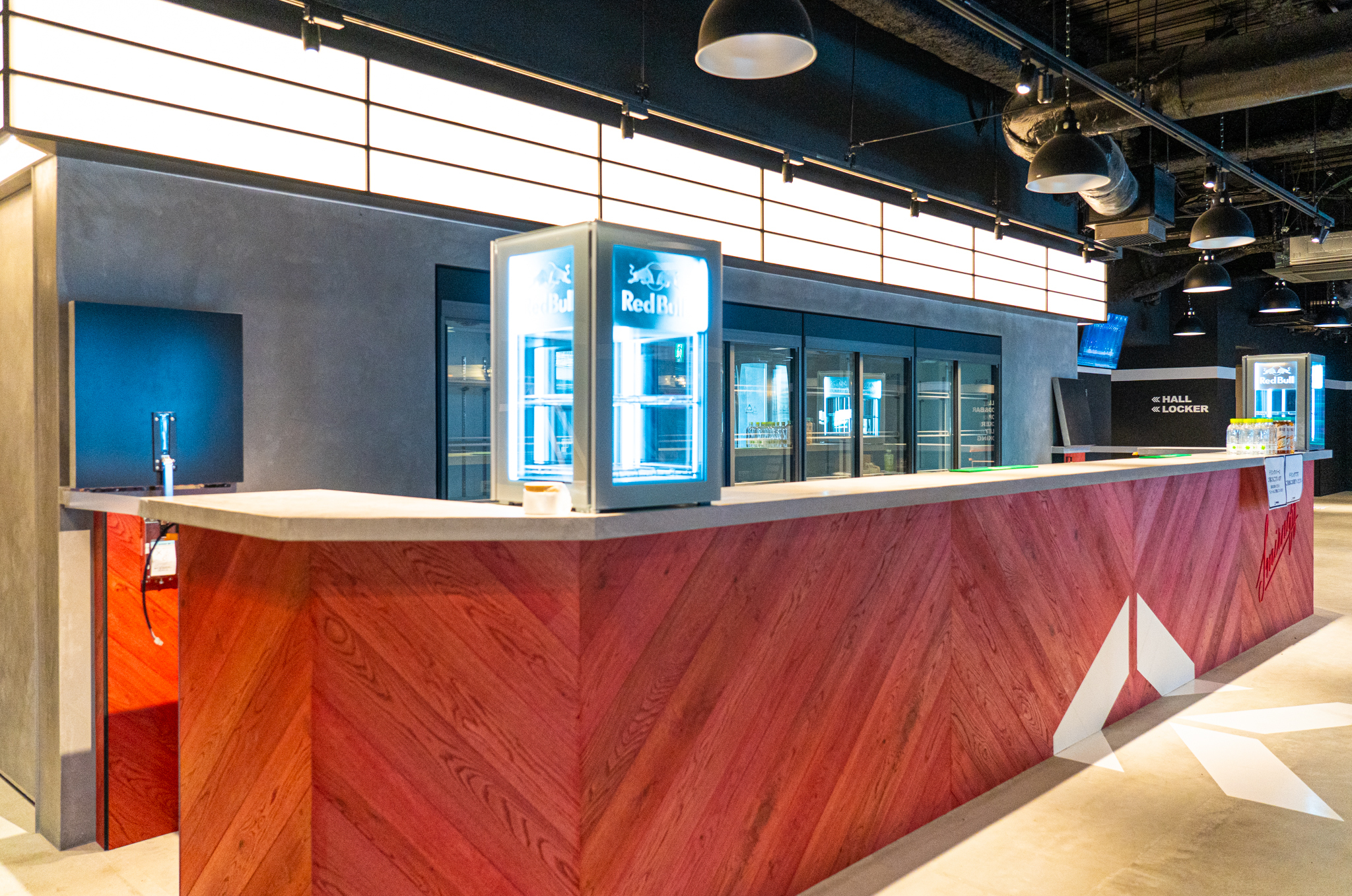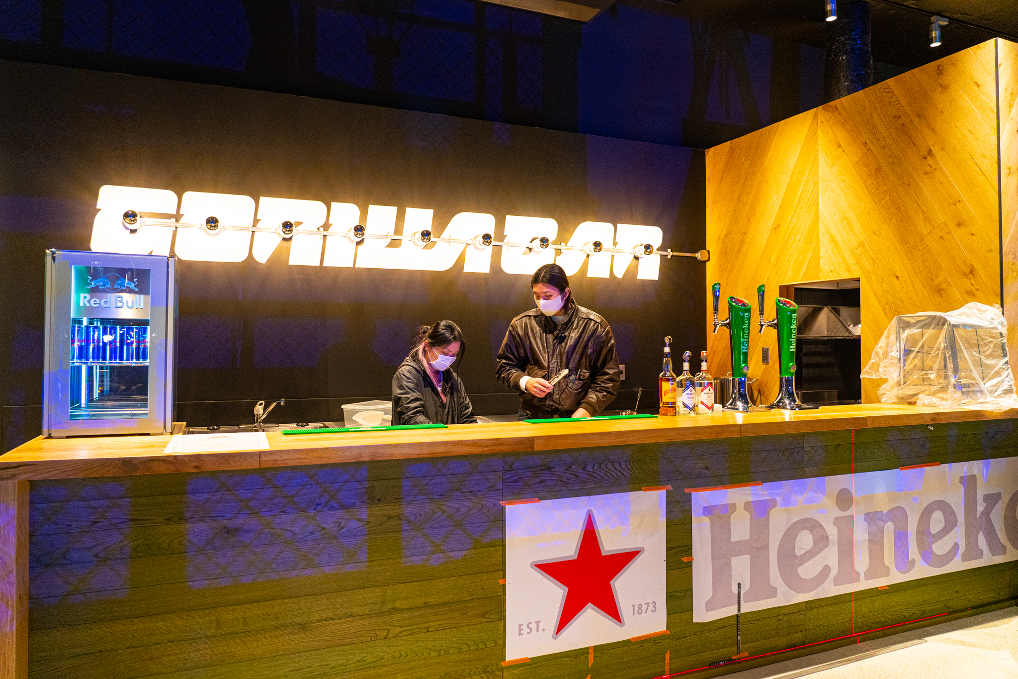 2階フロアには、客席エリアのほかにフードブース、バーエリア「GORILLABar」、物販カウンター、喫煙ルーム、トイレ(多機能トイレを含む)が設置されている。バーカウンターではサーバーによるお酒やドリンクの提供、フードブースではホットドッグなどのフードメニューも提供される予定だ。