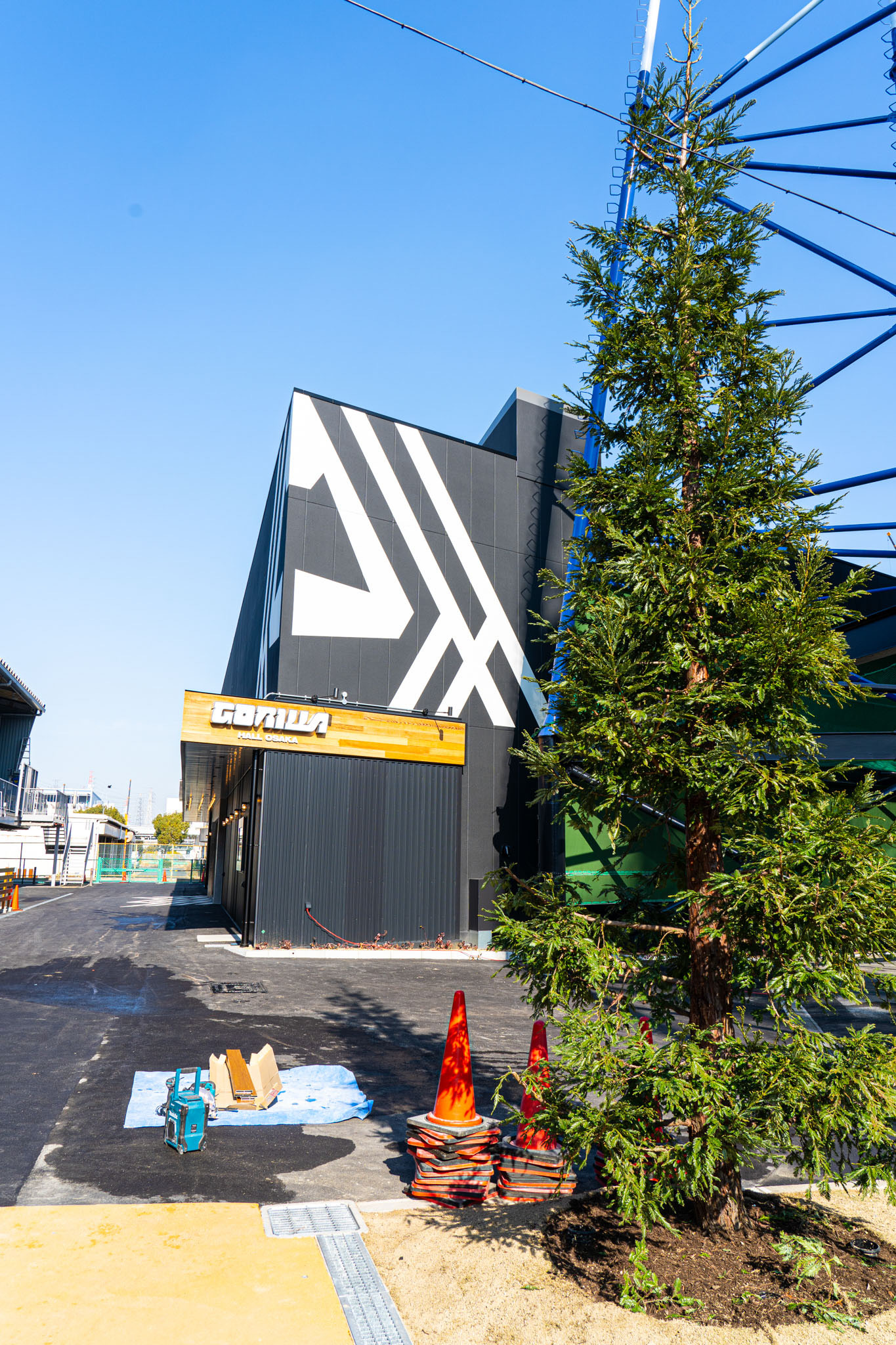 黒とウッド調の木材が組み合わさったフラットルーフは、迫力もありながら温かみも感じられる雰囲気。「GORILLA HALL」の名にふさわしい外観だ。エントランスには世界で一番大きく成長すると言われる木、センペルセコイアが高々と植わっている。さらに来場者を迎えるゴリラのオブジェが作られているらしく、こちらはオープンまでに完成予定だそう。